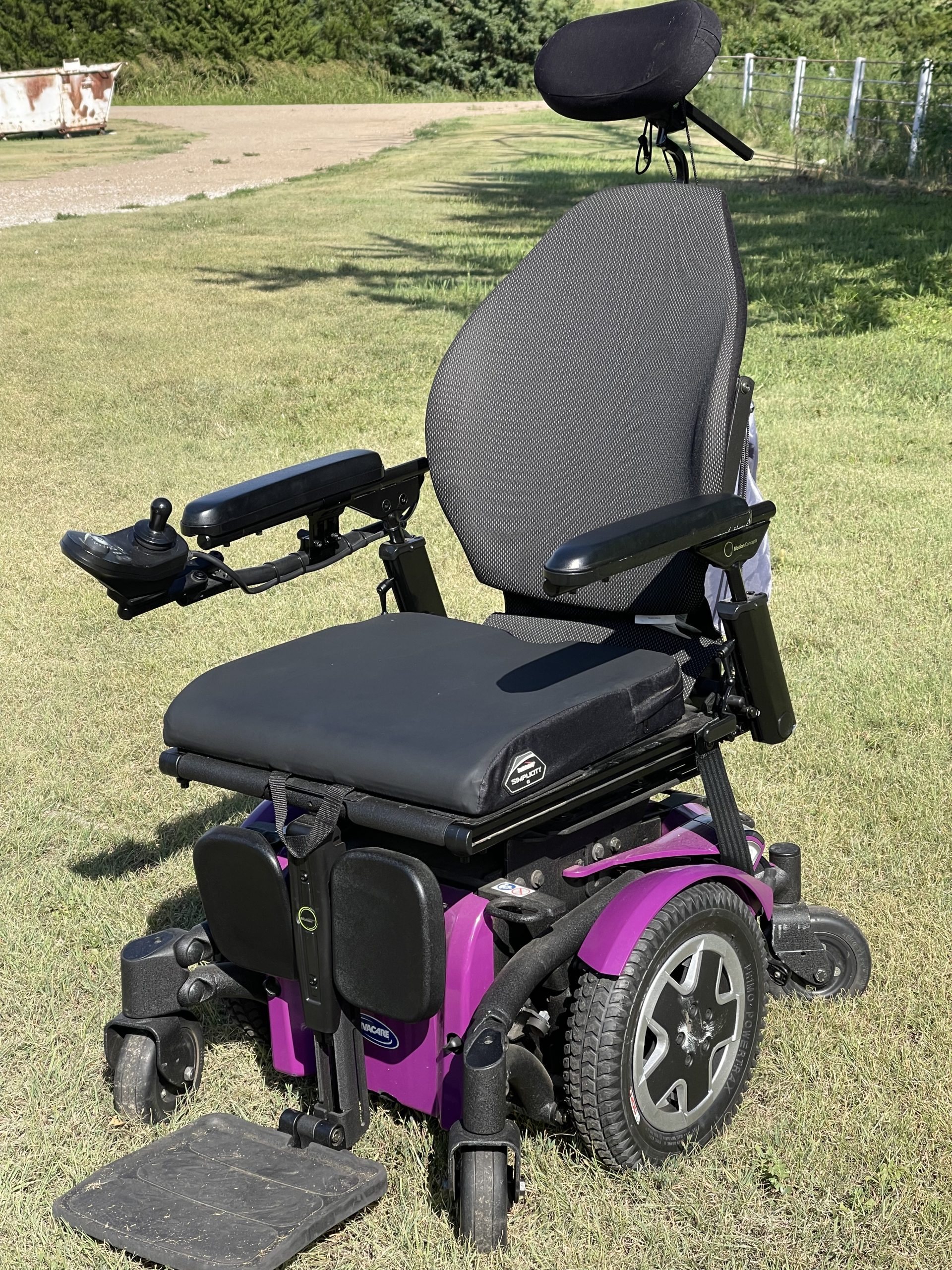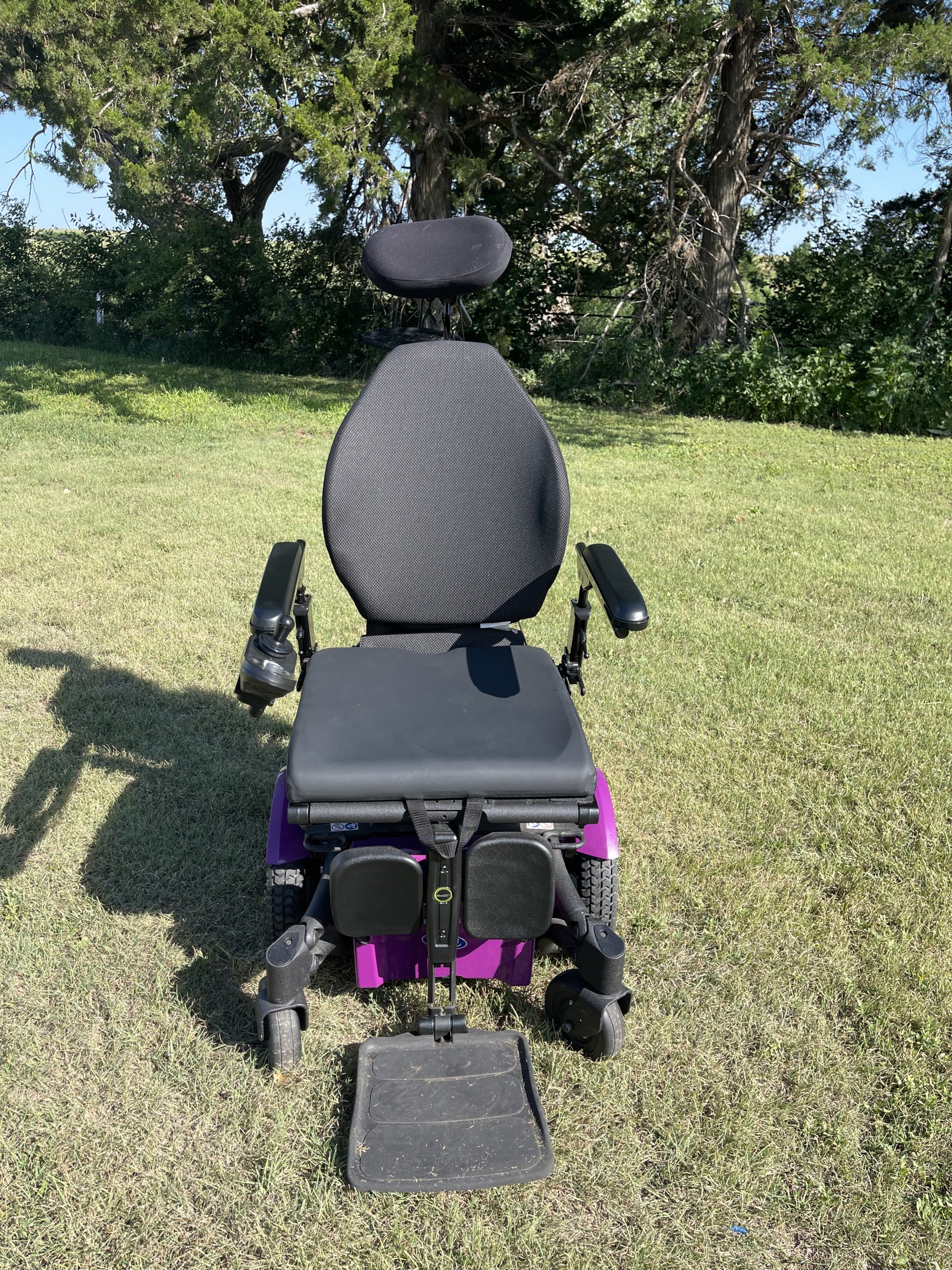 Black and purple in color. 6 wheels. Raises and tilts. The chair was used very briefly by my mother. She was still mobile most of the time so it was not used very much. We are only getting rid of it now due to her sudden passing in April of this year. We have no need for it. It was used briefly for 7 months when she had dr appts only. It does have some scuff marks on the left side of the wheel and on the arm. The chair comes with the owner's manual. Also comes with a pelvic belt hardware kit and installation instructions new in the bag and other parts still new in the bags and a seating module installation manual new in the bag. The model number and serial number are included in the pictures. Comes with a charger. Located in western Kansas between Great Bend and Hays. Please email me for more details or with any questions. Max weight is 250 pounds.