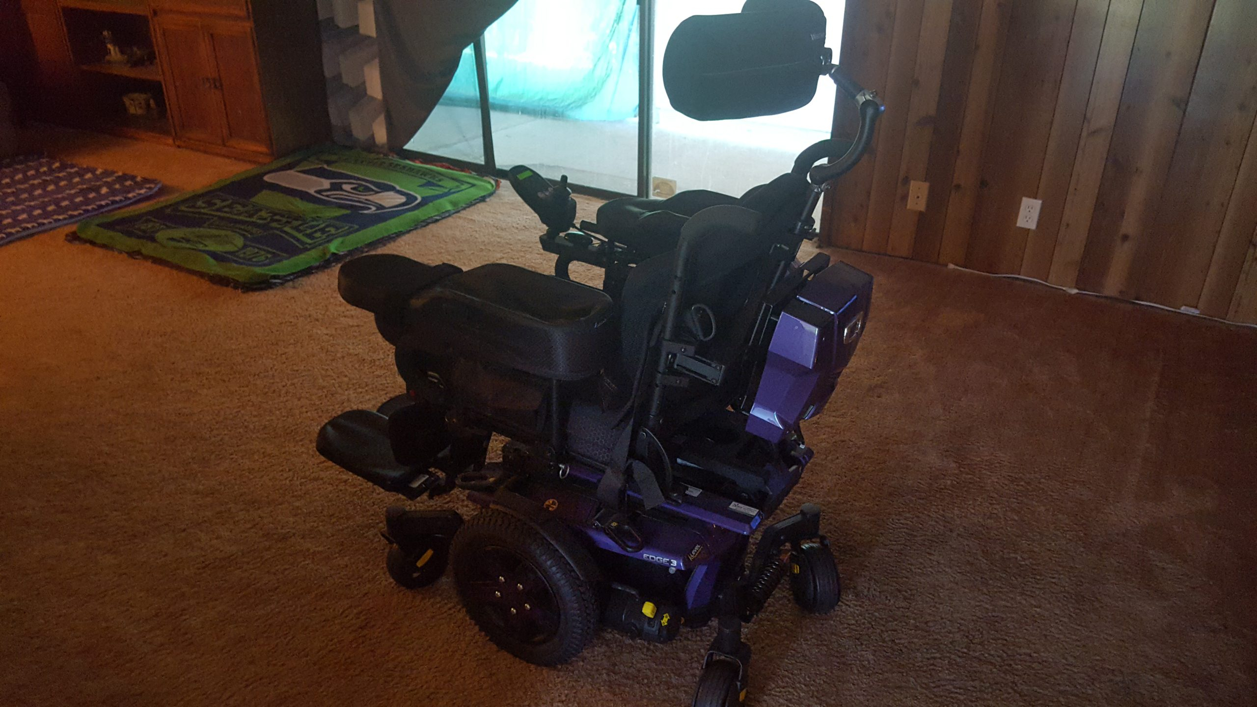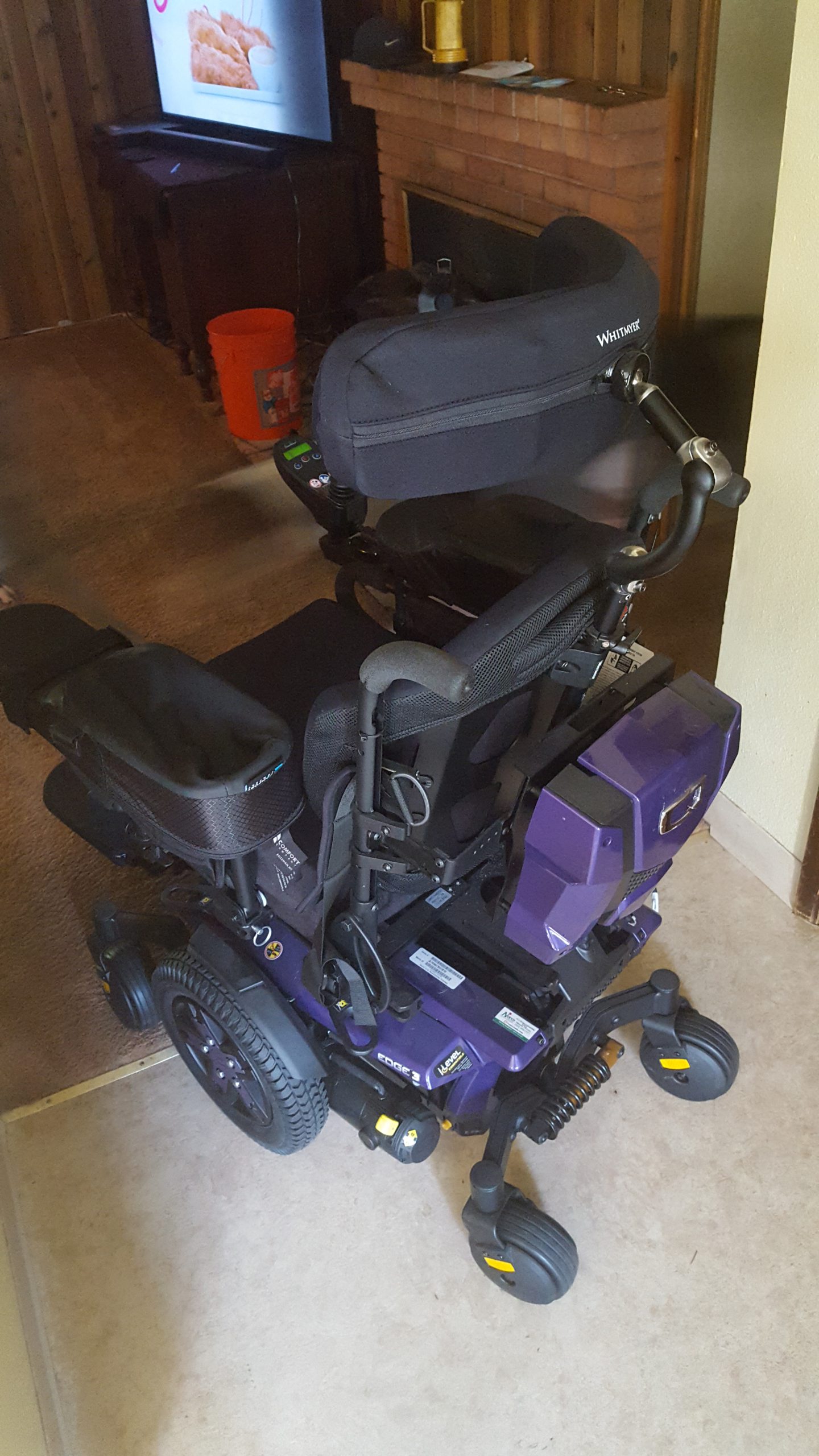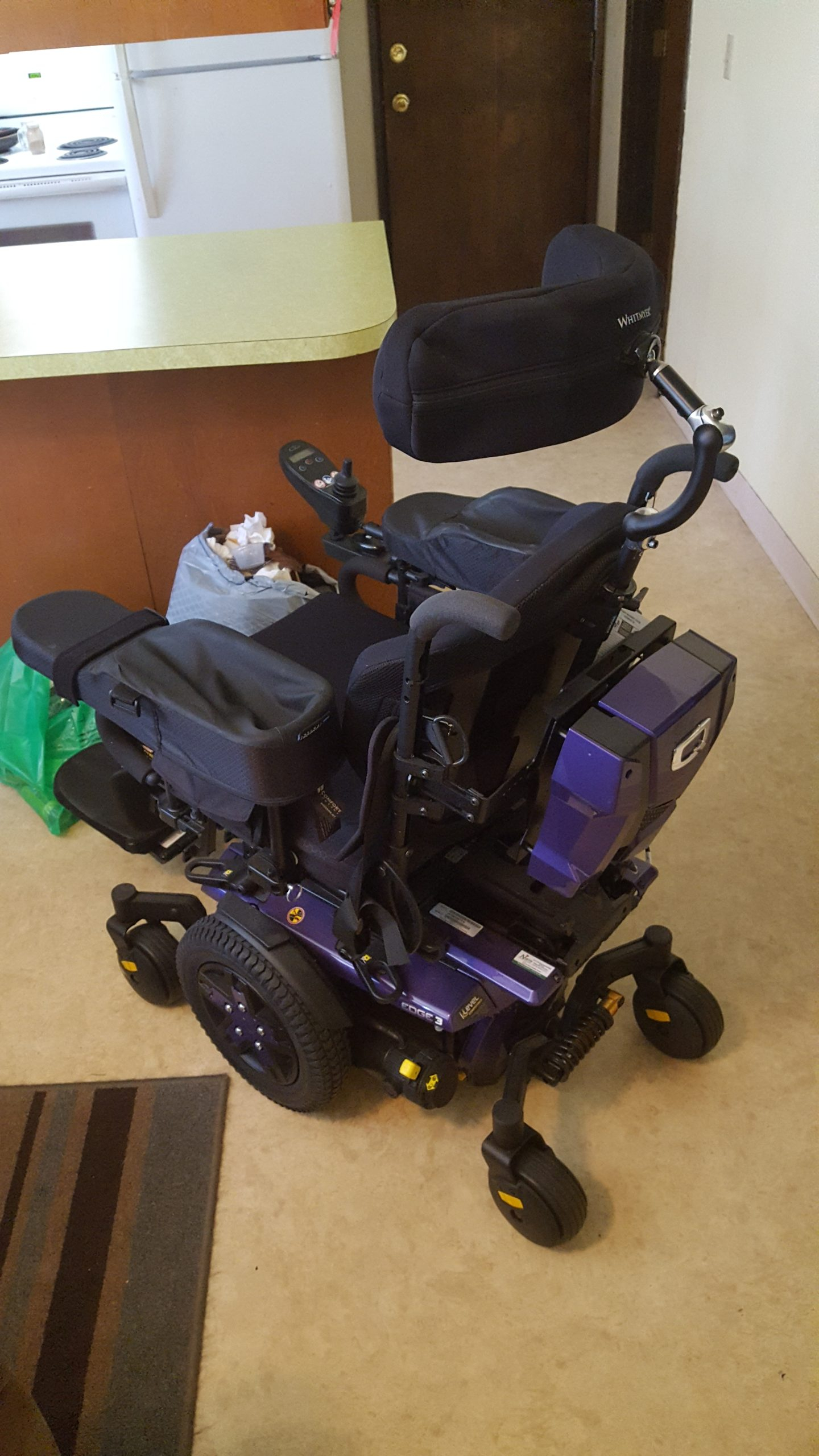 New chair wife can't operate chair has custom padded arms power lift recline padded individual footrests that can be set for height and angle includes power charger Pac and all manuals for operation. Chair is black with purple trim and wheel Covers. water resistant covers on arms and seating area. Unit has 5 position speed control also has head and taillights. Even includes charging port for phone or i-pad sure hope that someone has a good home for this chair hate to see it go. This unit can be used inside or outside it has front and rear suspension that can be adjusted as well as the headrest vertically and horizontally. The chair itself is very easy to maneuver even in small spaces it can make a 360 degree turn with little effort! very useful is the power recline option as it lays back enough to be able to take a nap or take pressure off of your back. with the adjustable footrest it is nice to be able to raise or lower them individually. if interested please text me at 062wkg@gmail.com have beautiful day!