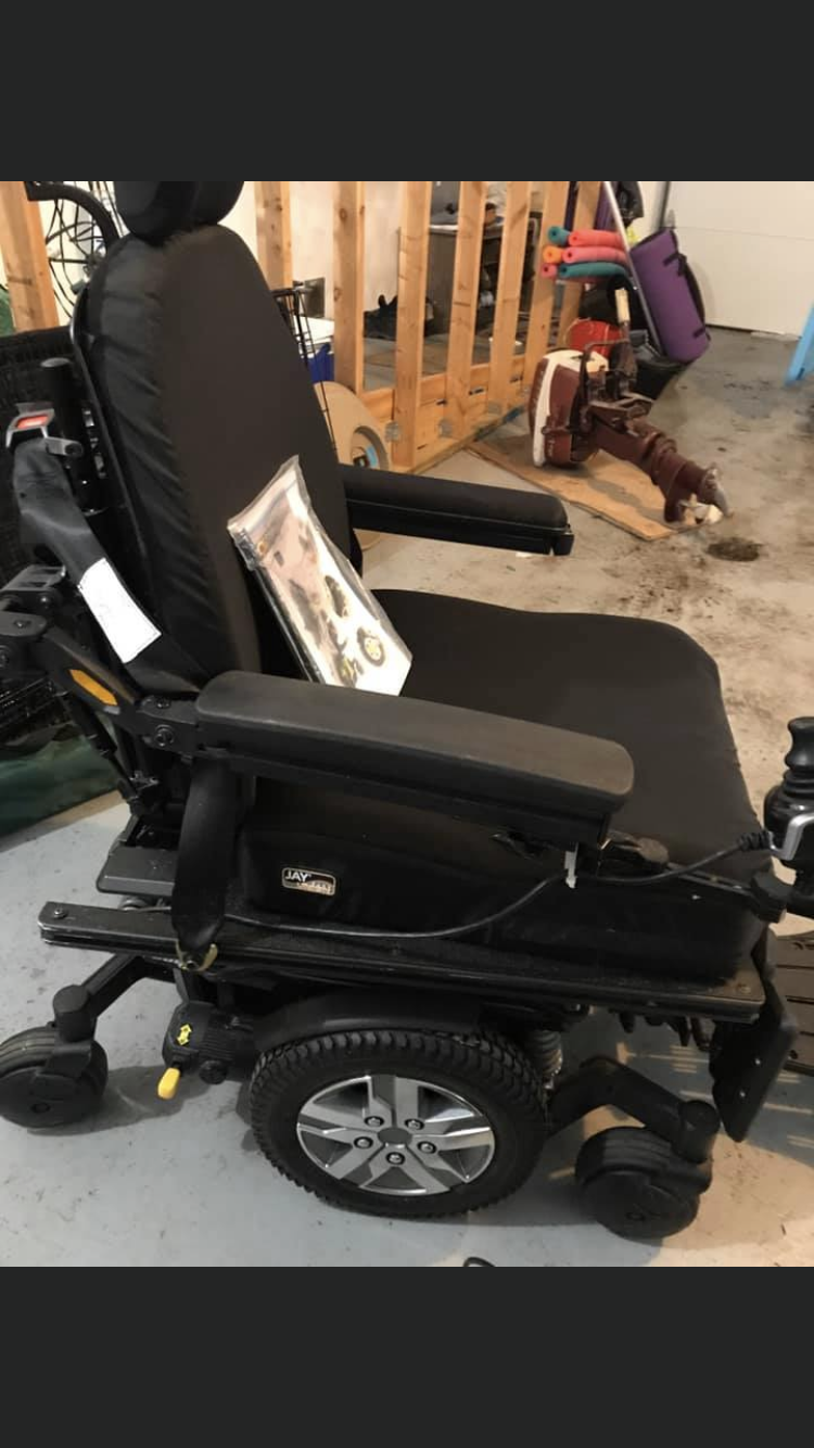 This electric wheelchair was customized with a large person in mind. It has a weight capacity for up to 450lbs, with the widest seat (25”) and extra support. It has the control arm in the right but is easily converted for left handed use. It has 14” drive wheels in the back and 6” caster wheels in front. The base width is 26.5” and it measures about 36” long without foot riggings. This is the lift and tilt model and has a maximum speed of about 4.5mph depending on passenger weight, tire pressure etc. it is 3” above the floor and 20” from the floor to the seat. The video below describes this same unit in minute detail (from Marcs mobility). It is comfortable and manageable, lift and recline features. This unit is in excellent condition. Original battery and tires only used indoors and not daily. The owner was in a nursing facility and never ventured outside.