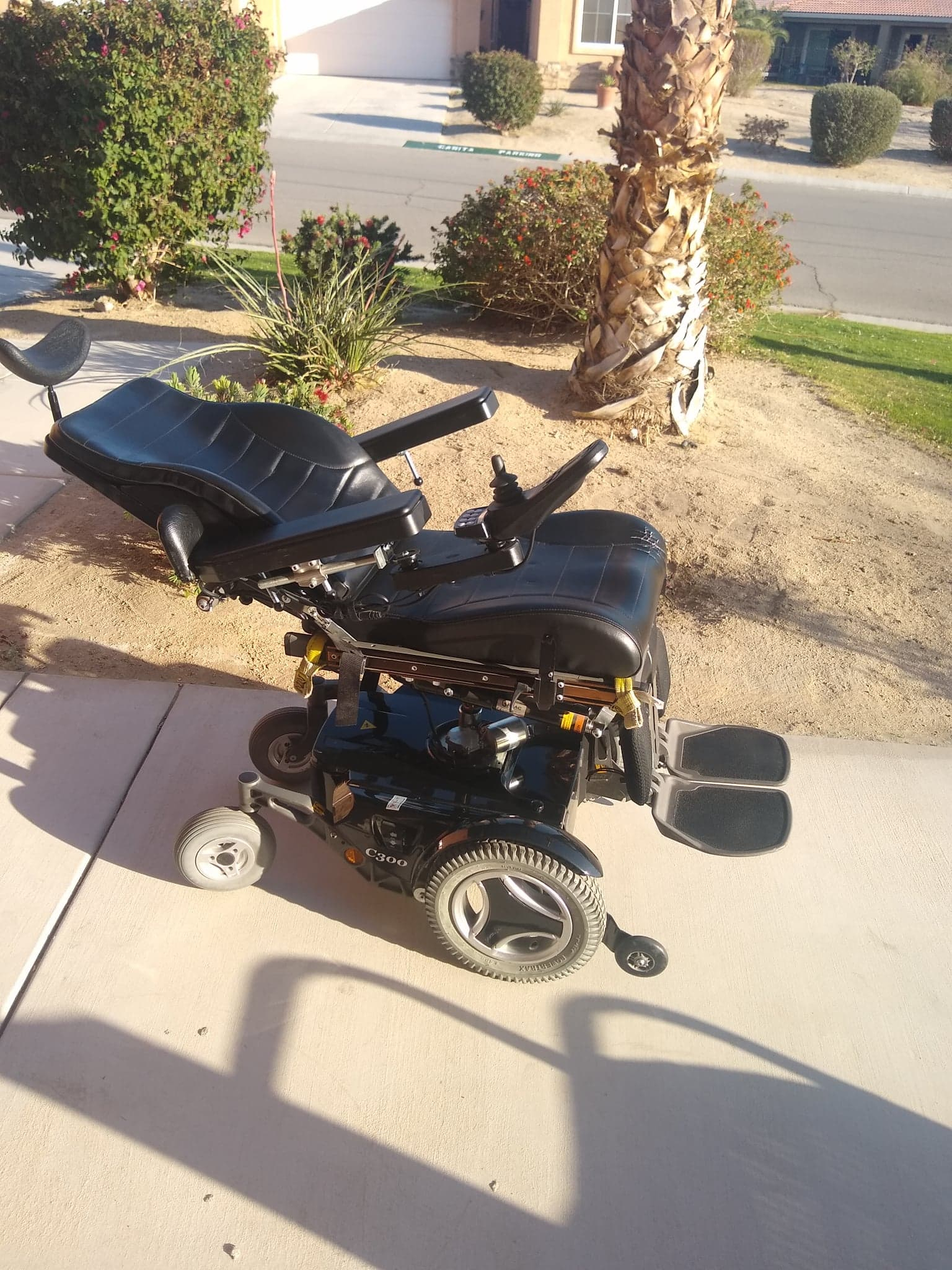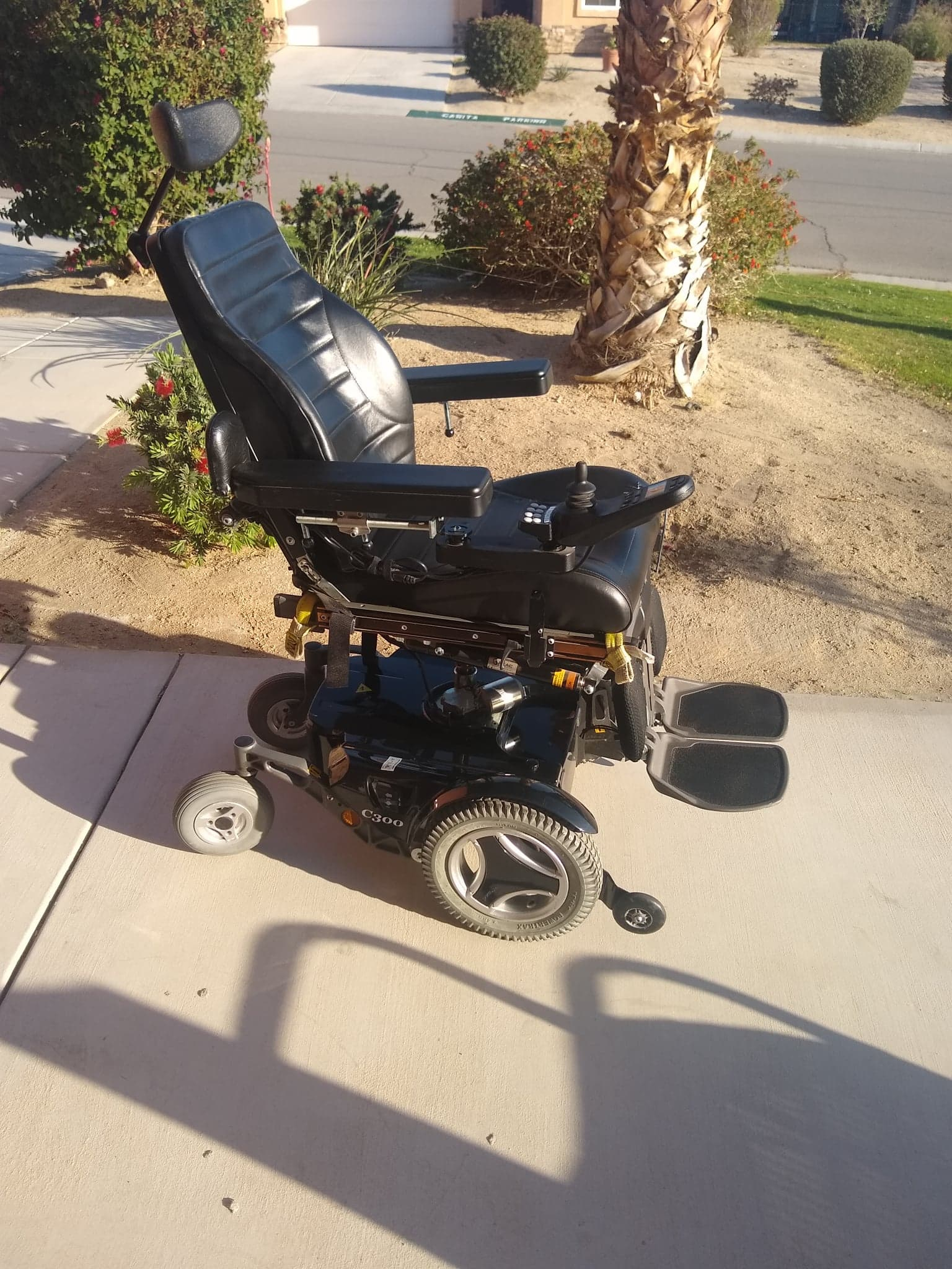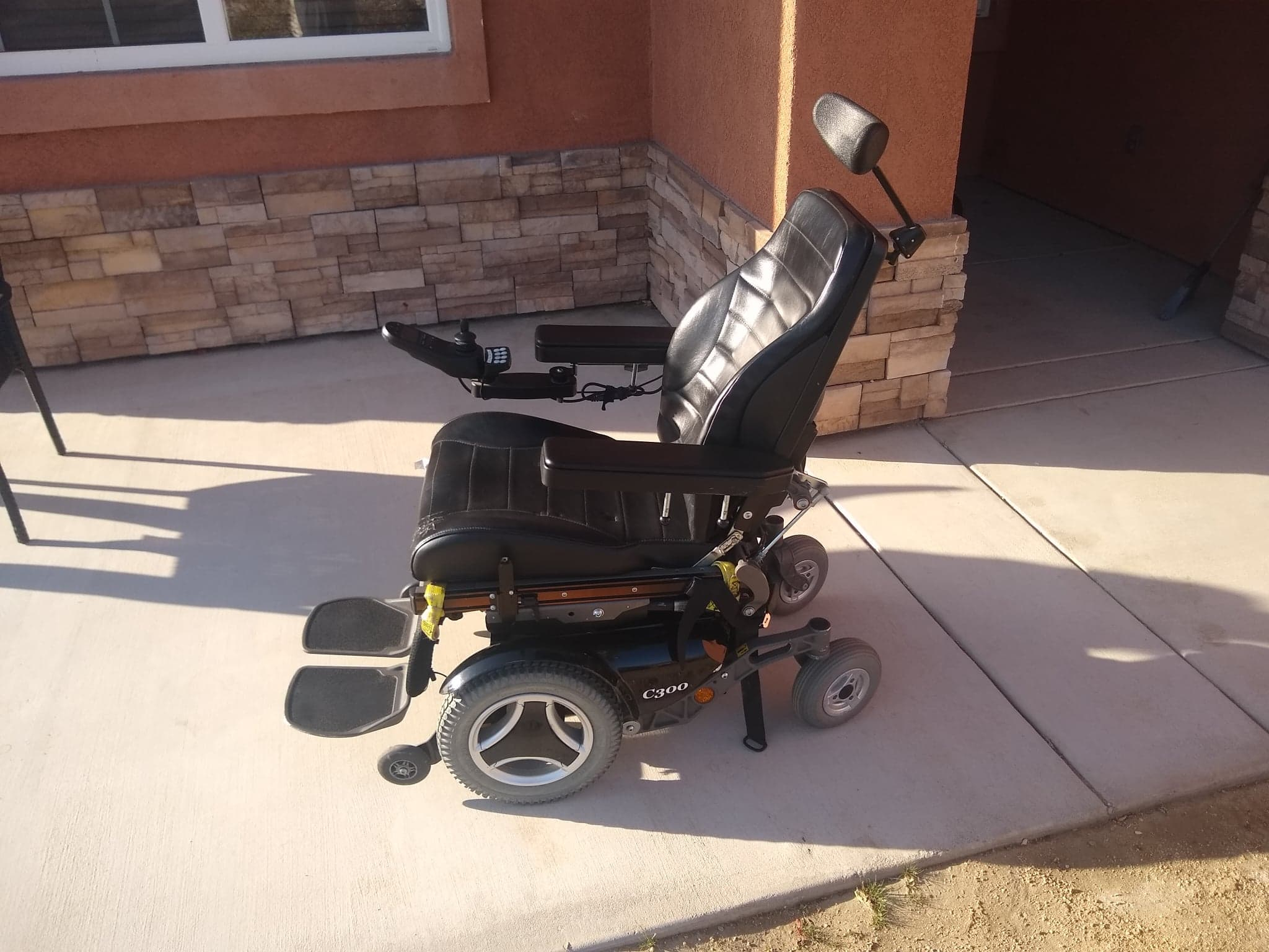 Fully functional Permobil C300 with elevation, recline & tilt, all functions electric and controlled via joystick. This wheelchair have been used as a backup since 2014. We put new Gel batteries in it last fall and have kept it charged ever since, the batteries was around 450$. The wheelchair is available for in person buying in The Coachella Valley in California. The seat has a little wear in the left front side but everything works as it should and hopefully someone who needs the special functions like seat elevation, leg lift tilt & recline can appreciate this nice fully electric Power wheelchair. If you live in the Coachella Valley but don't have the possibility to pick up the chair yourself, I can deliver it to your home. If you live more than 25 miles away I would charge a fee for transportation! Thank you for looking and feel free to ask my any questions. I only receive cash!