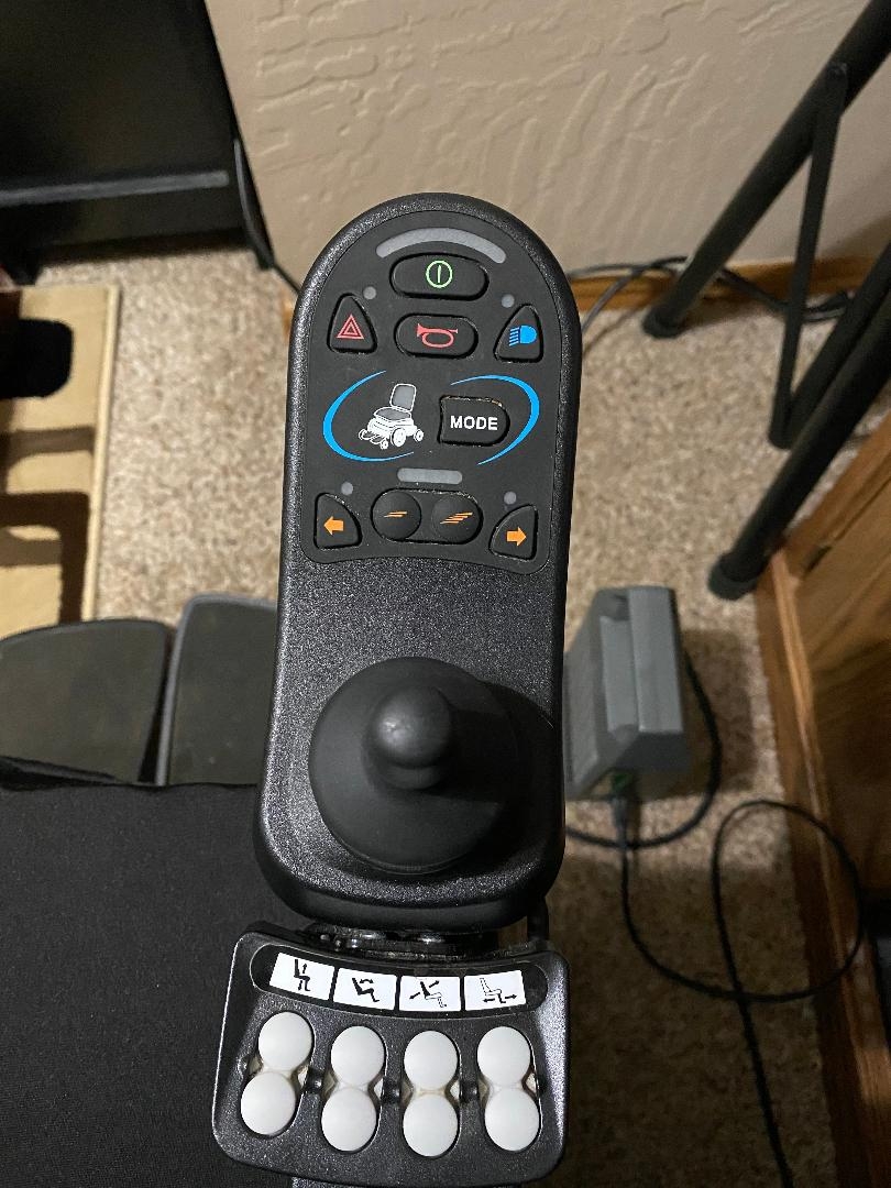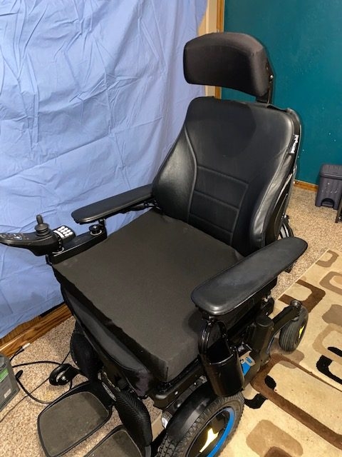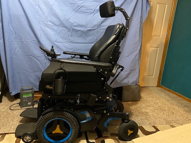 This blue trimmed Permobil F3 power chair was used for about three years prior to user's recent passing. It's in very good condition and is an excellent model. Includes charger.