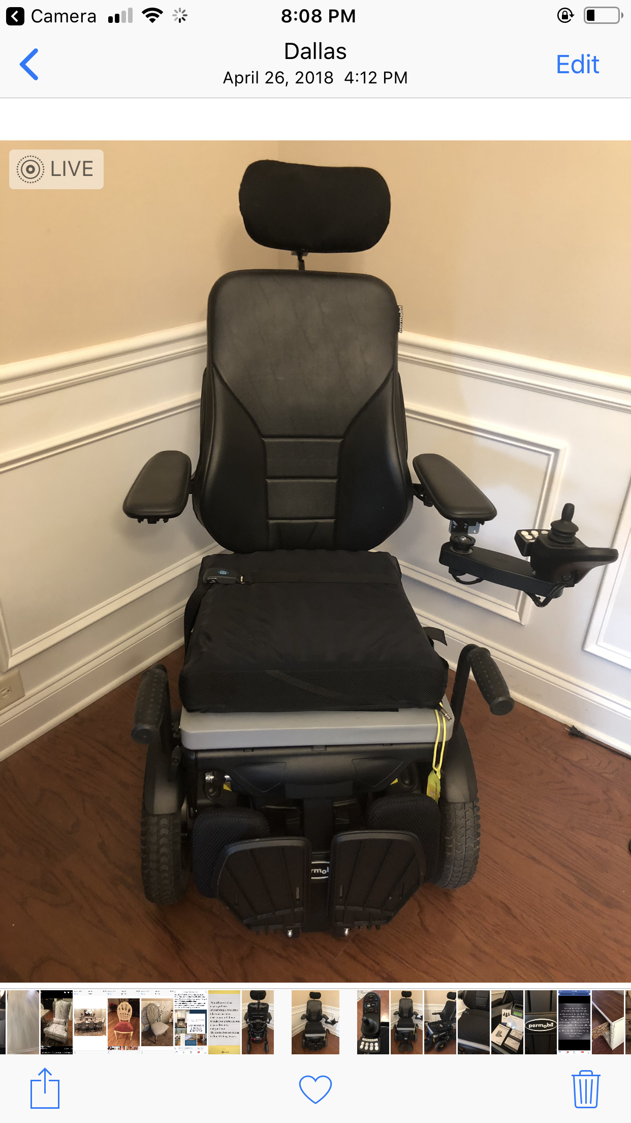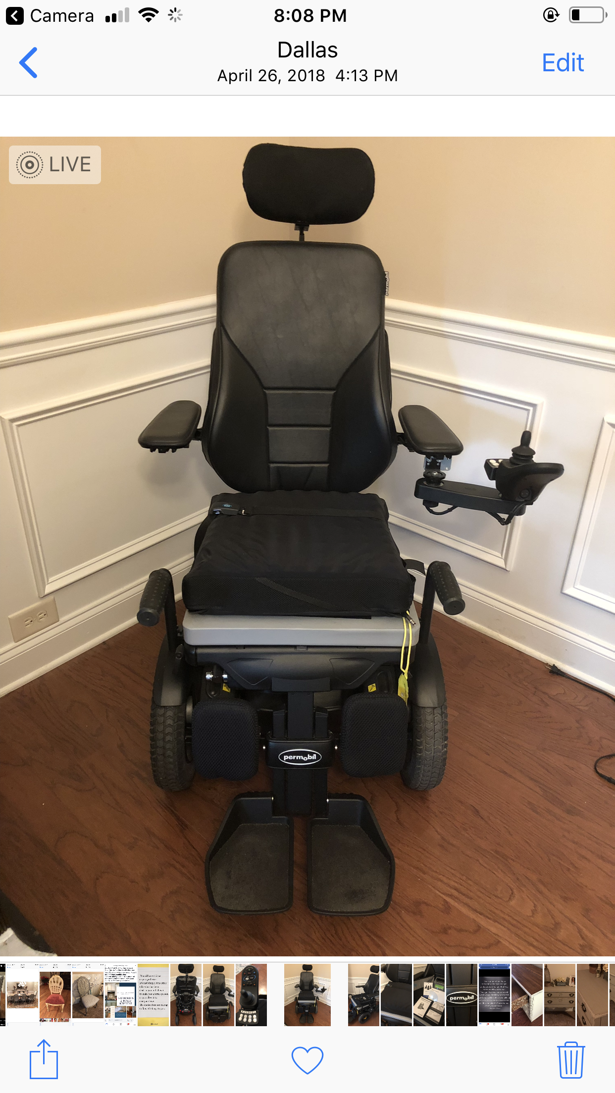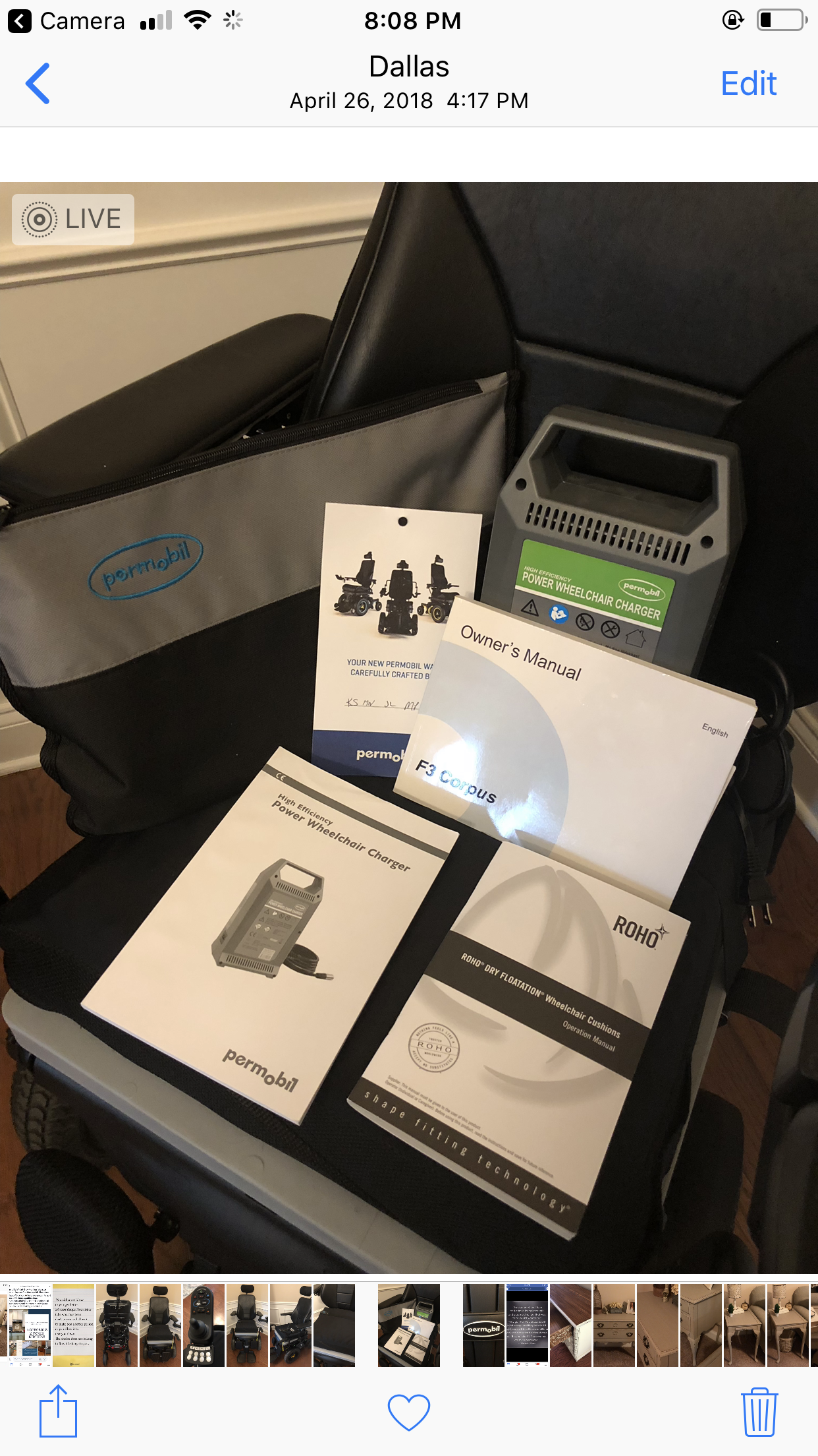 LIKE BRAND NEW F3 Corpus Power Wheelchair w/TILT, RECLINE & LEGS. Barely used and in mint condition; Features Padded w/Air Deluxe Rehab Seat Cushion w/Pump & Removable Cover ($200 value), Adjustable Headrest, Flip Up Foot Plates, Joy Stick Controls (can be attached to left or right armrests); Like New Tires; & Brand New Batteries. Comes w/EVERYTHING: Battery Charger, User manual & tool kit (never been used). This power chair's size, agility & suspension lets users move quickly in and out of tight spaces, with a smooth and stable ride to navigate the obstacles of life. Offers multiple tilt and recline positions. We will also provide a video upon request along with any measurements you may need as it is stored at a family member's home (in a temperature controlled environment & covered). We bought this for my husband brand new after an auto accident w/spinal cord injury, and he is the only owner. To give an idea of seat size/width, my husband is a small-medium frame and has used it weighing around 160-70 lbs. It was used around the house mainly and on a few outings so it is literally like brand new, no markings on it anywhere or stains on any of the fabric or seat. If interested, we will be glad to answer any questions you have that may not have been covered here.
