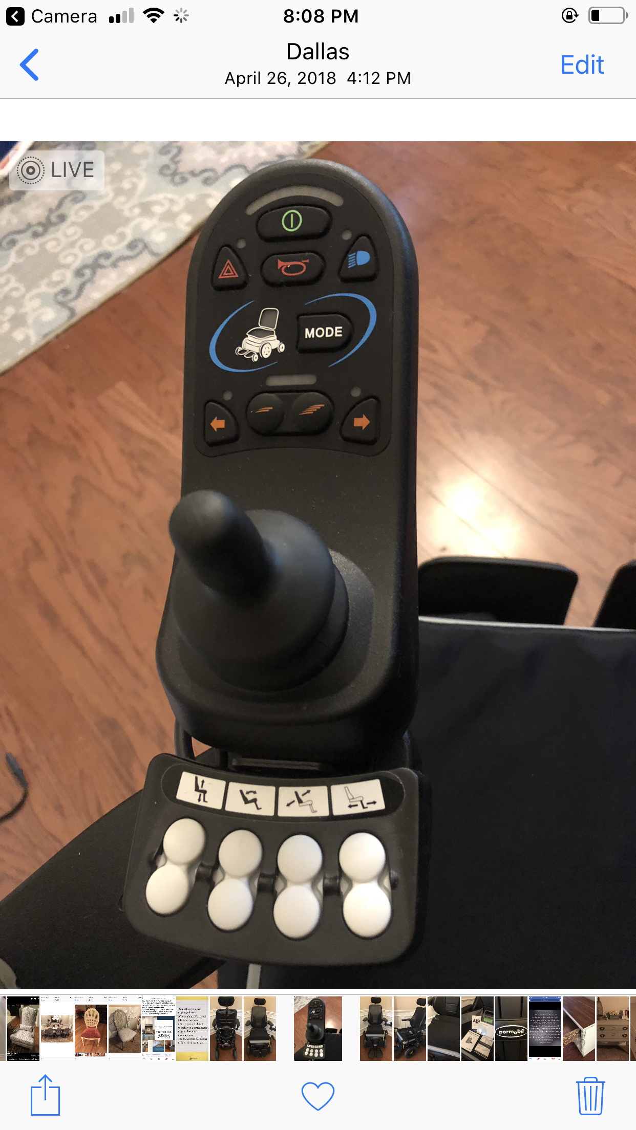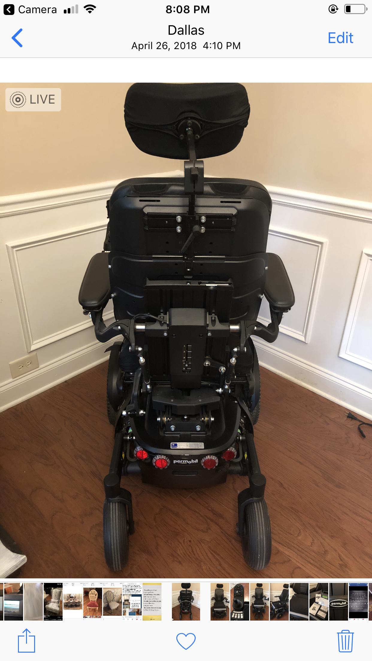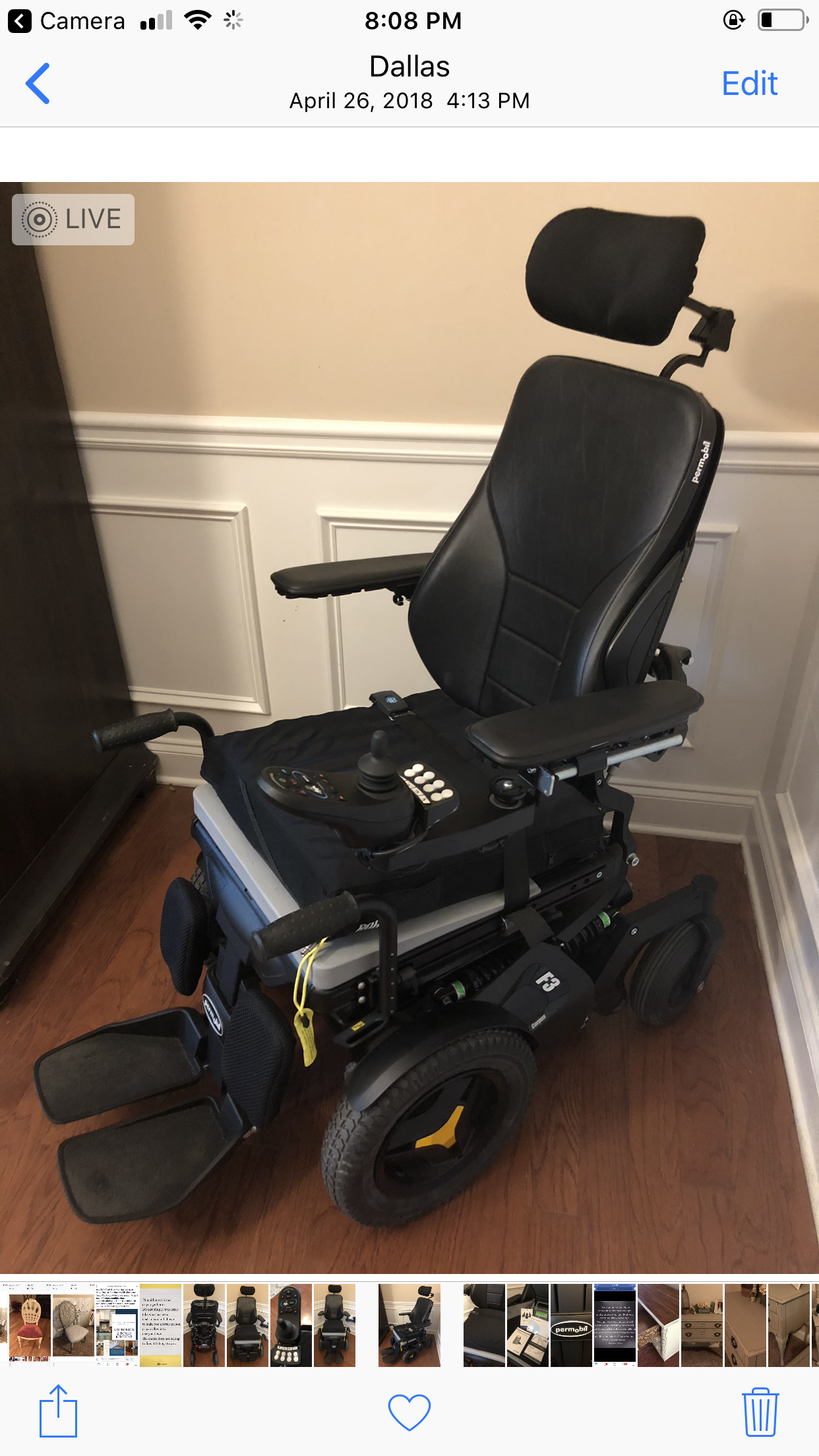 LIKE BRAND NEW F3 Corpus Power Wheelchair w/TILT, RECLINE & LEGS. Barely used and in mint condition; Features Padded w/Air Deluxe Rehab Seat Cushion w/Pump & Removable Cover ($200 value), Adjustable Headrest, Flip Up Foot Plates, Joy Stick Controls (can be attached to left or right armrests); Like New Tires; & Brand New Batteries. Comes w/EVERYTHING: Battery Charger, User manual & tool kit (never been used). This power chair's size, agility & suspension lets users move quickly in and out of tight spaces, with a smooth and stable ride to navigate the obstacles of life. Offers multiple tilt and recline positions. We will also provide a video upon request along with any measurements you may need as it is stored at a family member's home (in a temperature controlled environment & covered). We bought this for my husband brand new after an auto accident w/spinal cord injury, and he is the only owner. To give an idea of seat size/width, my husband is a small-medium frame and has used it weighing around 160-70 lbs. It was used around the house mainly and on a few outings so it is literally like brand new, no markings on it anywhere or stains on any of the fabric or seat. If interested, we will be glad to answer any questions you have that may not have been covered here.