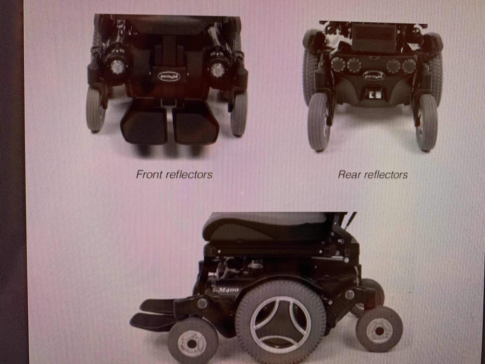 The wheelchair is equipped with reflectors on the front, rear and sides. Front/
