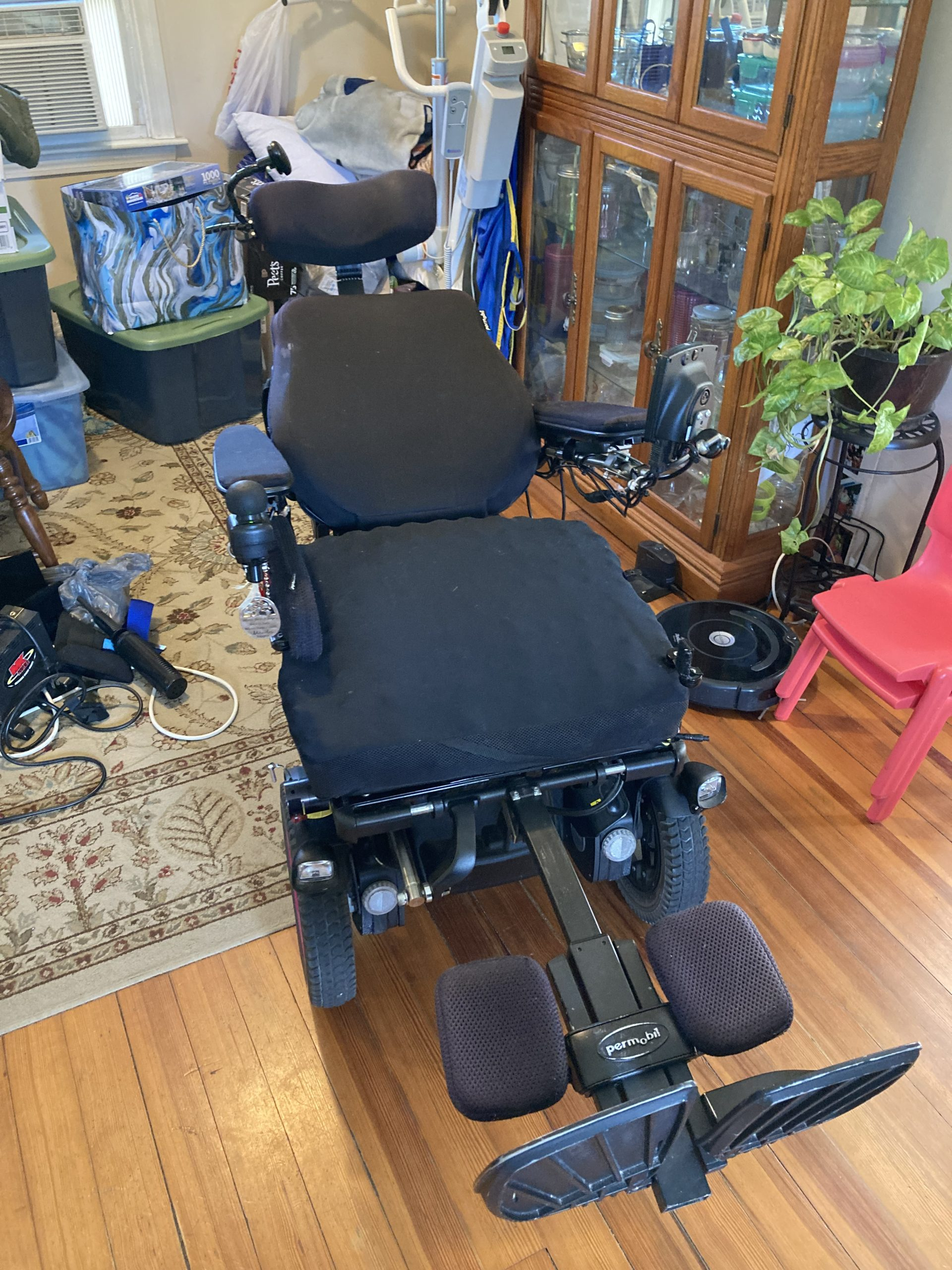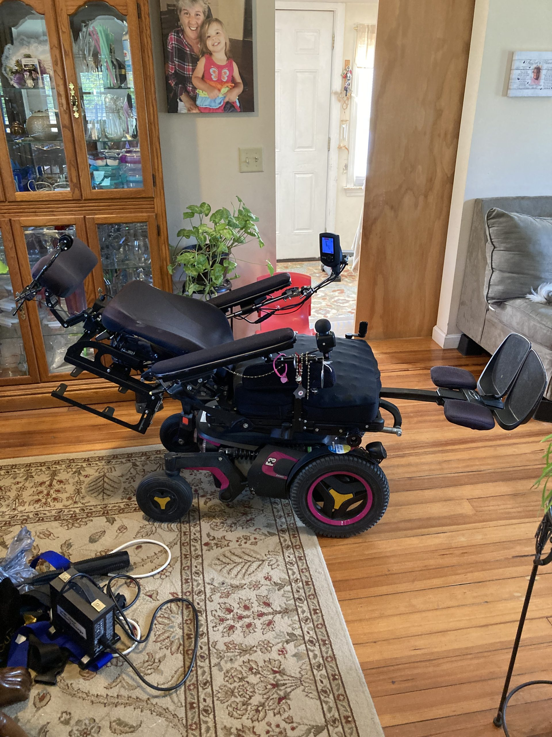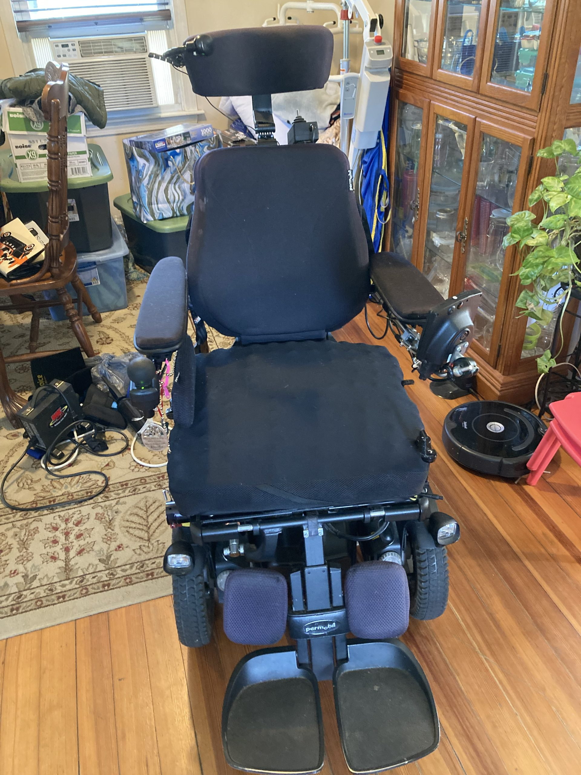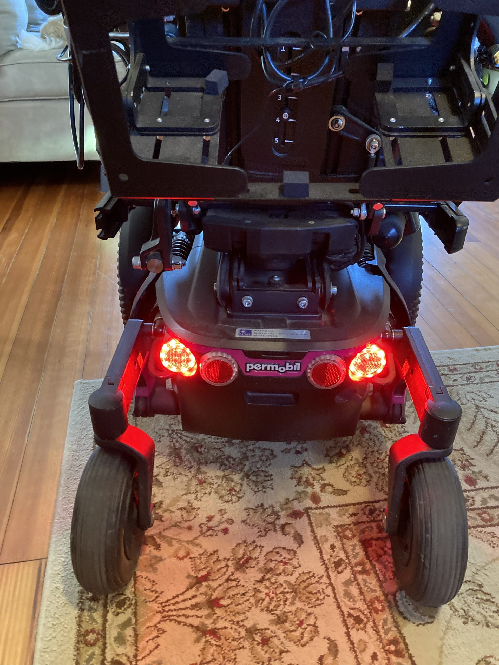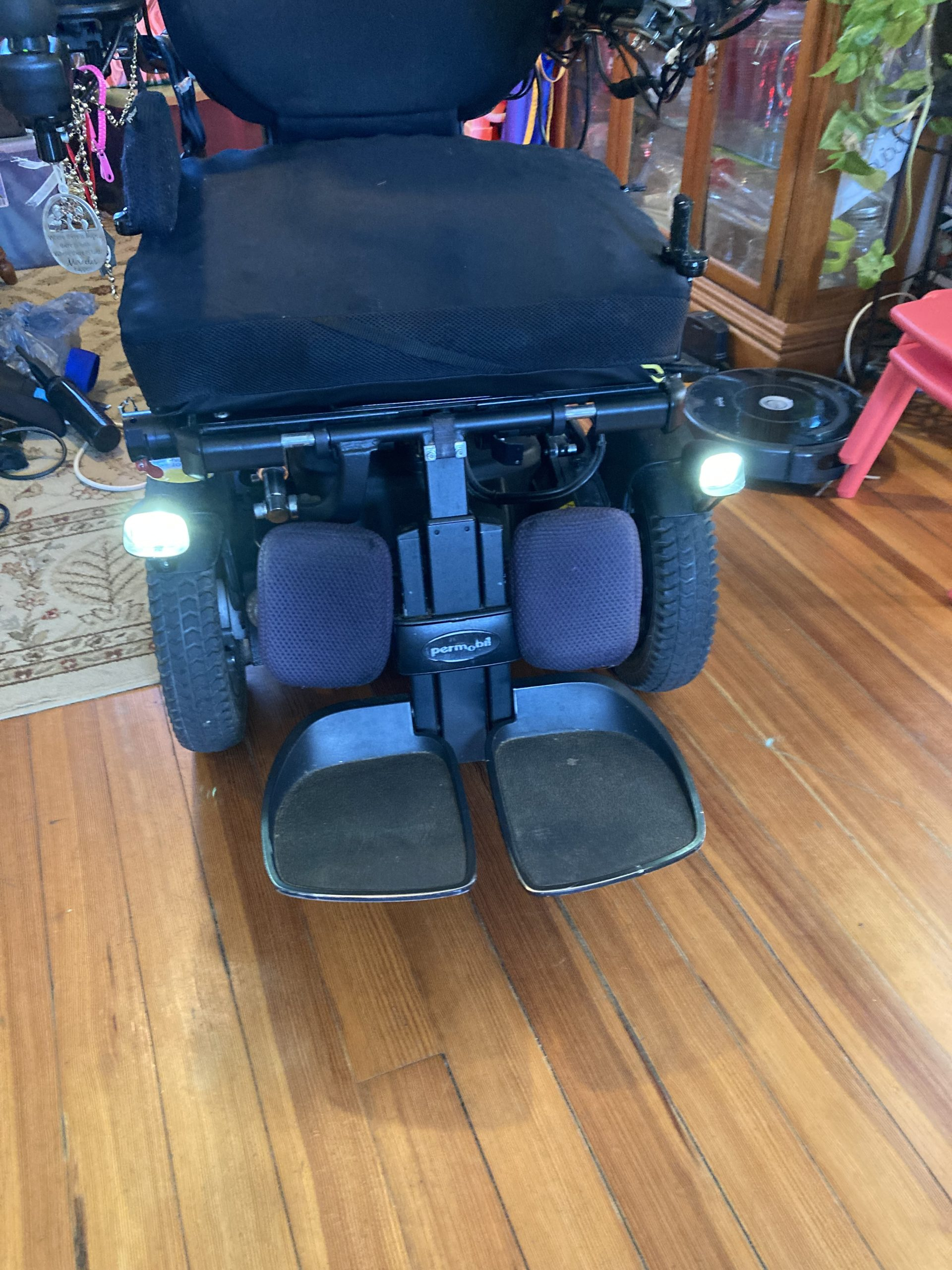 Permobil power wheelchair, black with pink. Has headlights, taillights, directionals, it can fully recline. It goes up vertically such as bar height in a restaurant. It was used for 6 years and it was $25,000 new but since has had added parts as well as extra to go with it. It has a newer battery.