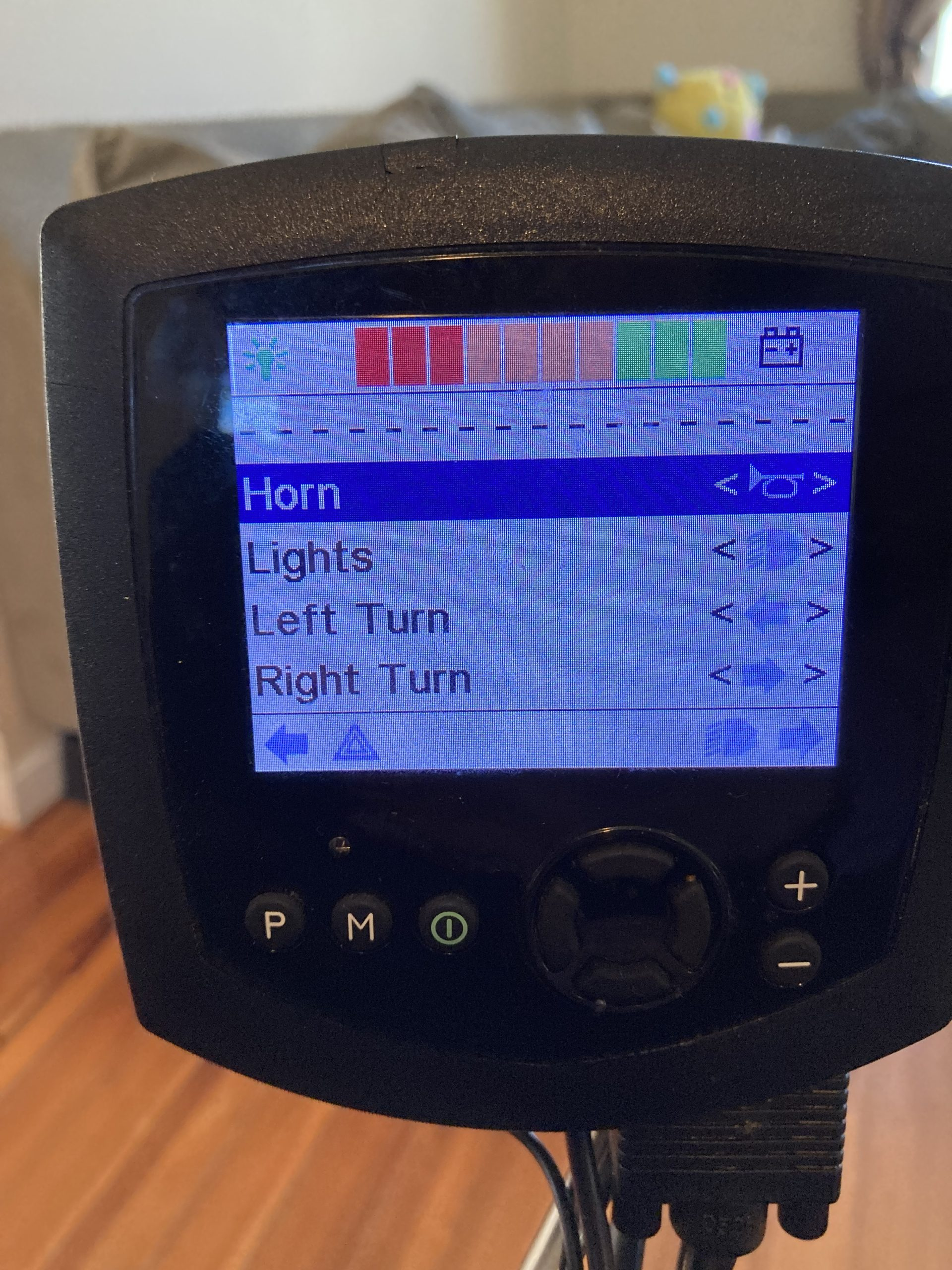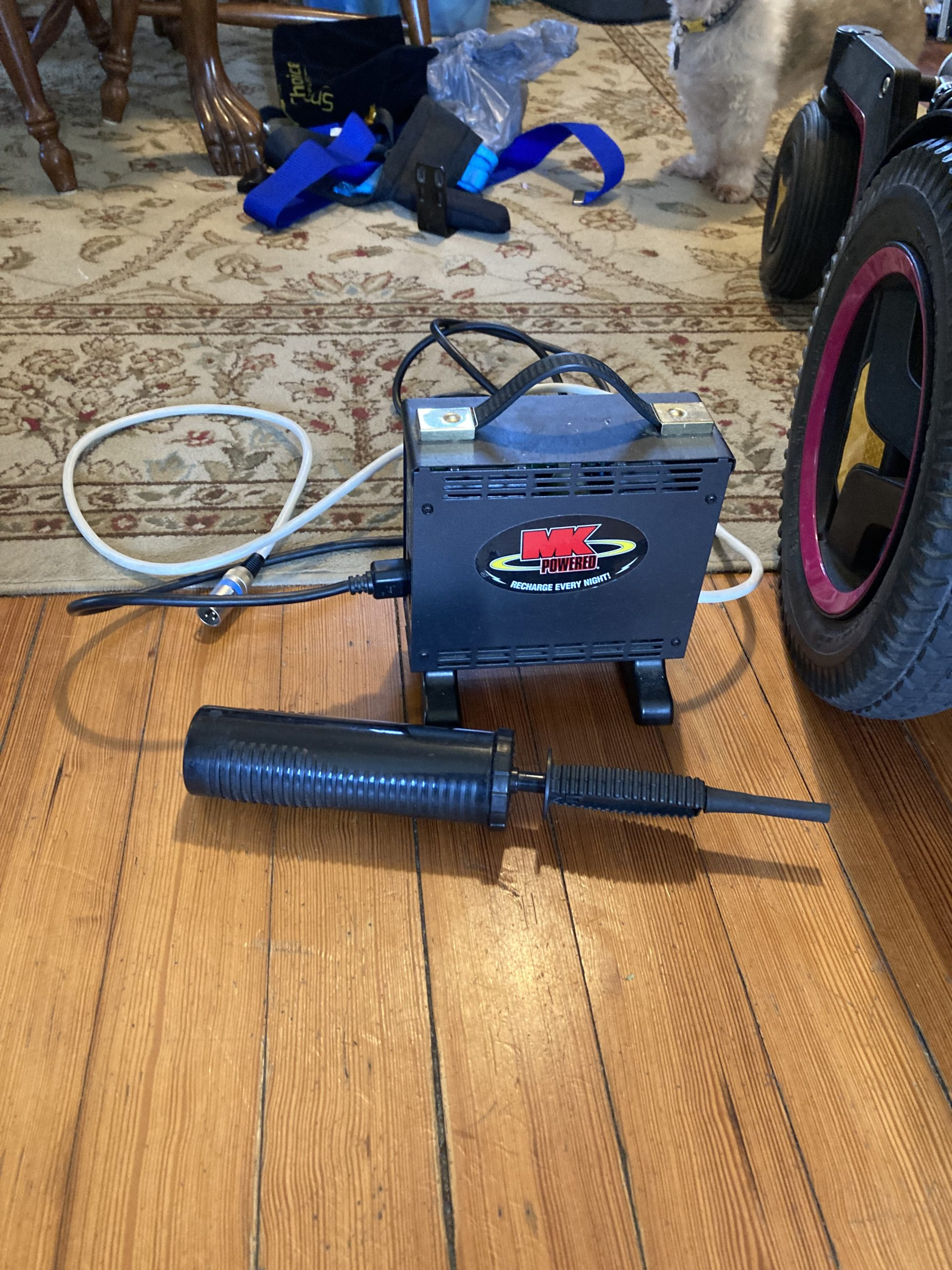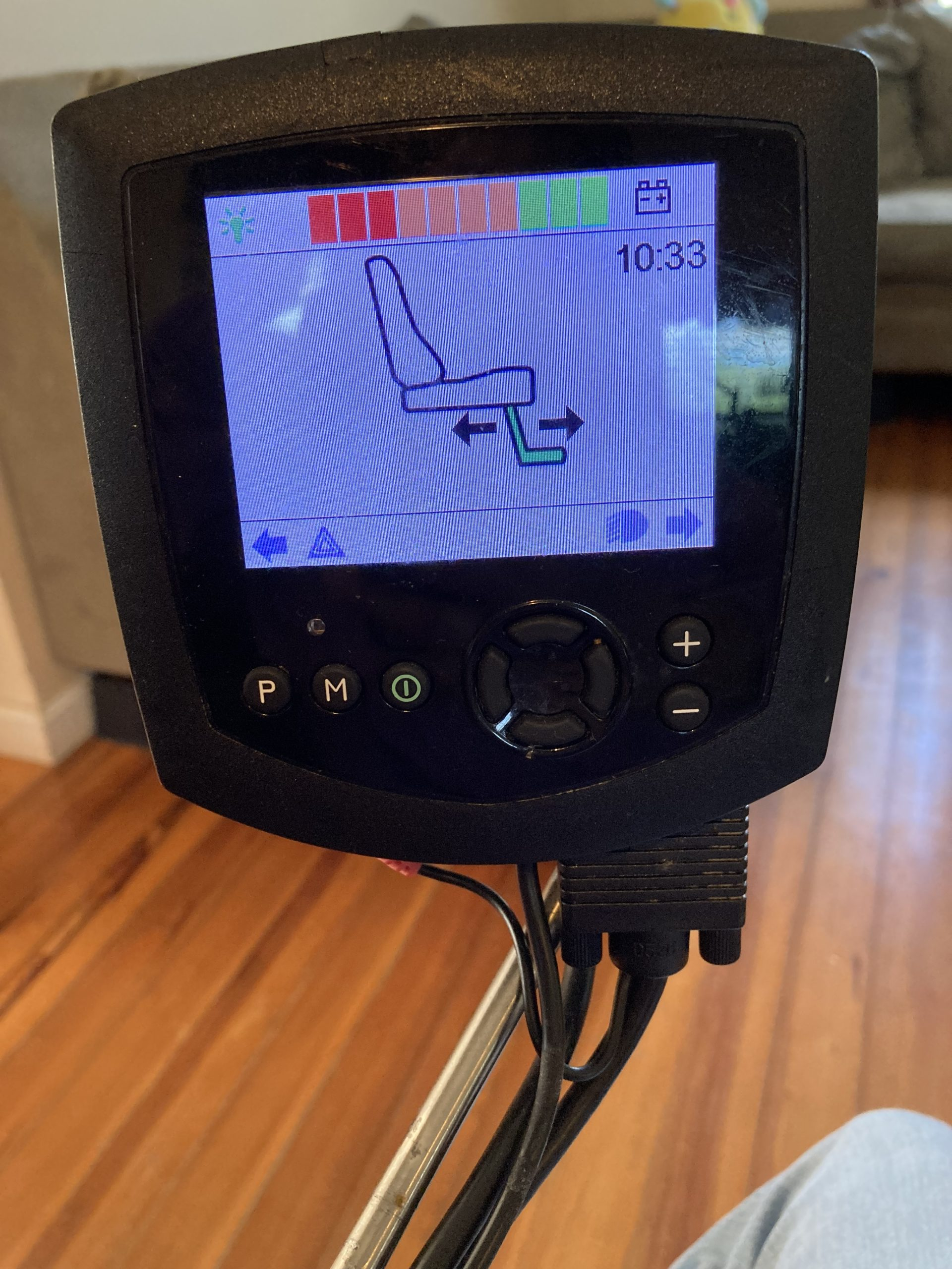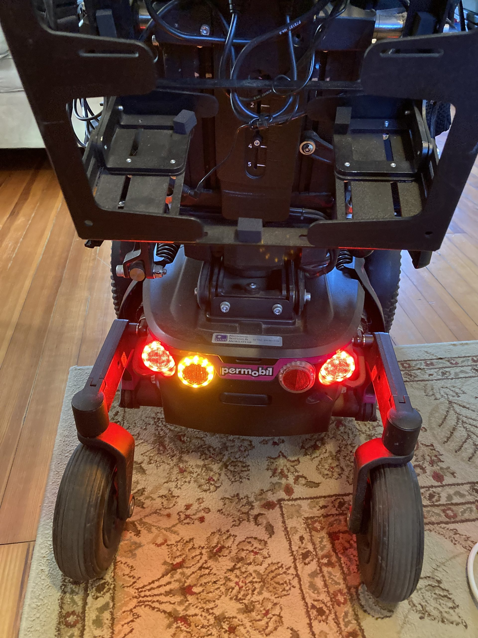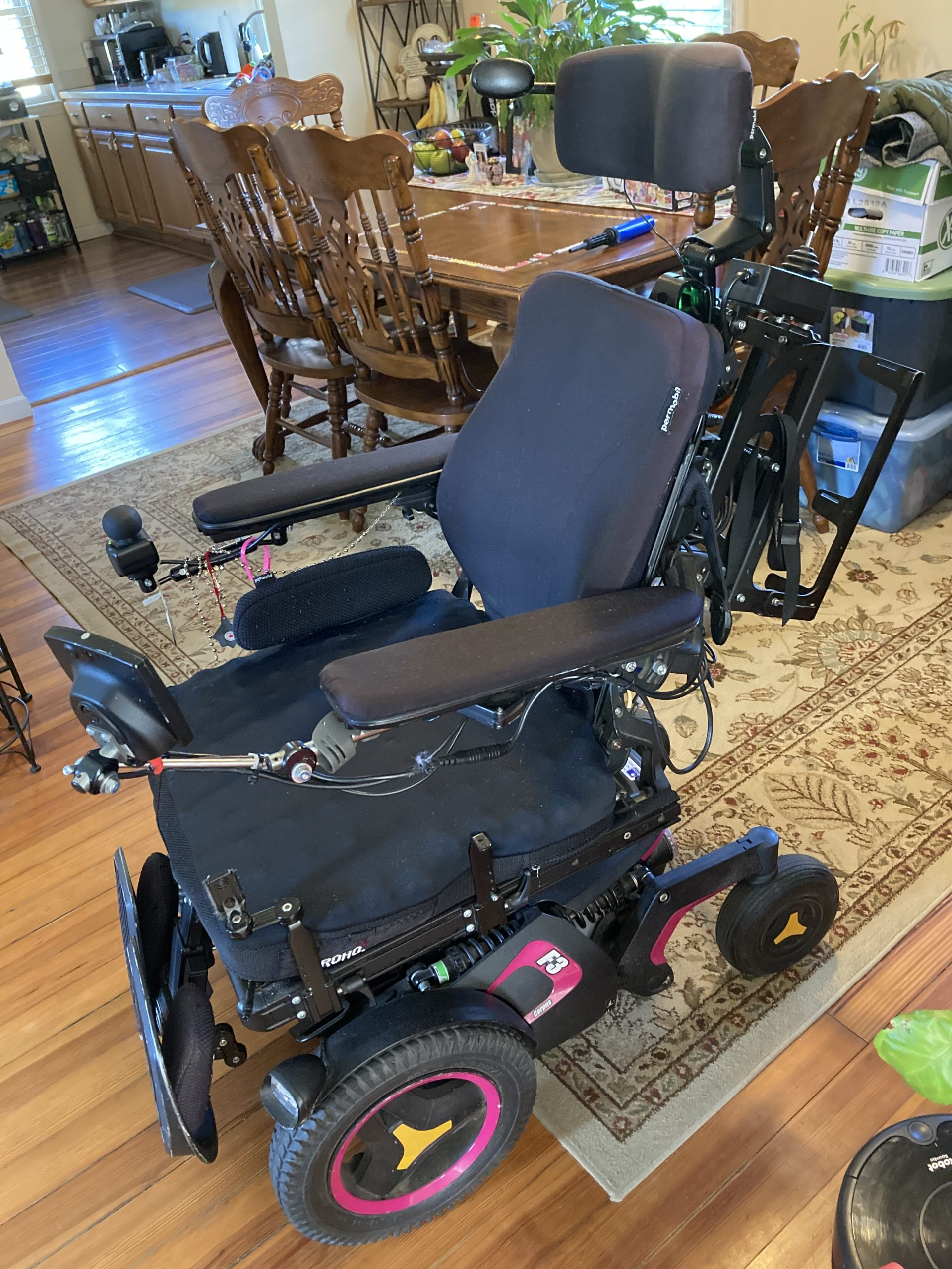 Permobil power wheelchair, black with pink. Has headlights, taillights, directionals, it can fully recline. It goes up vertically such as bar height in a restaurant. It was used for 6 years and it was $25,000 new but since has had added parts as well as extra to go with it. It has a newer battery.