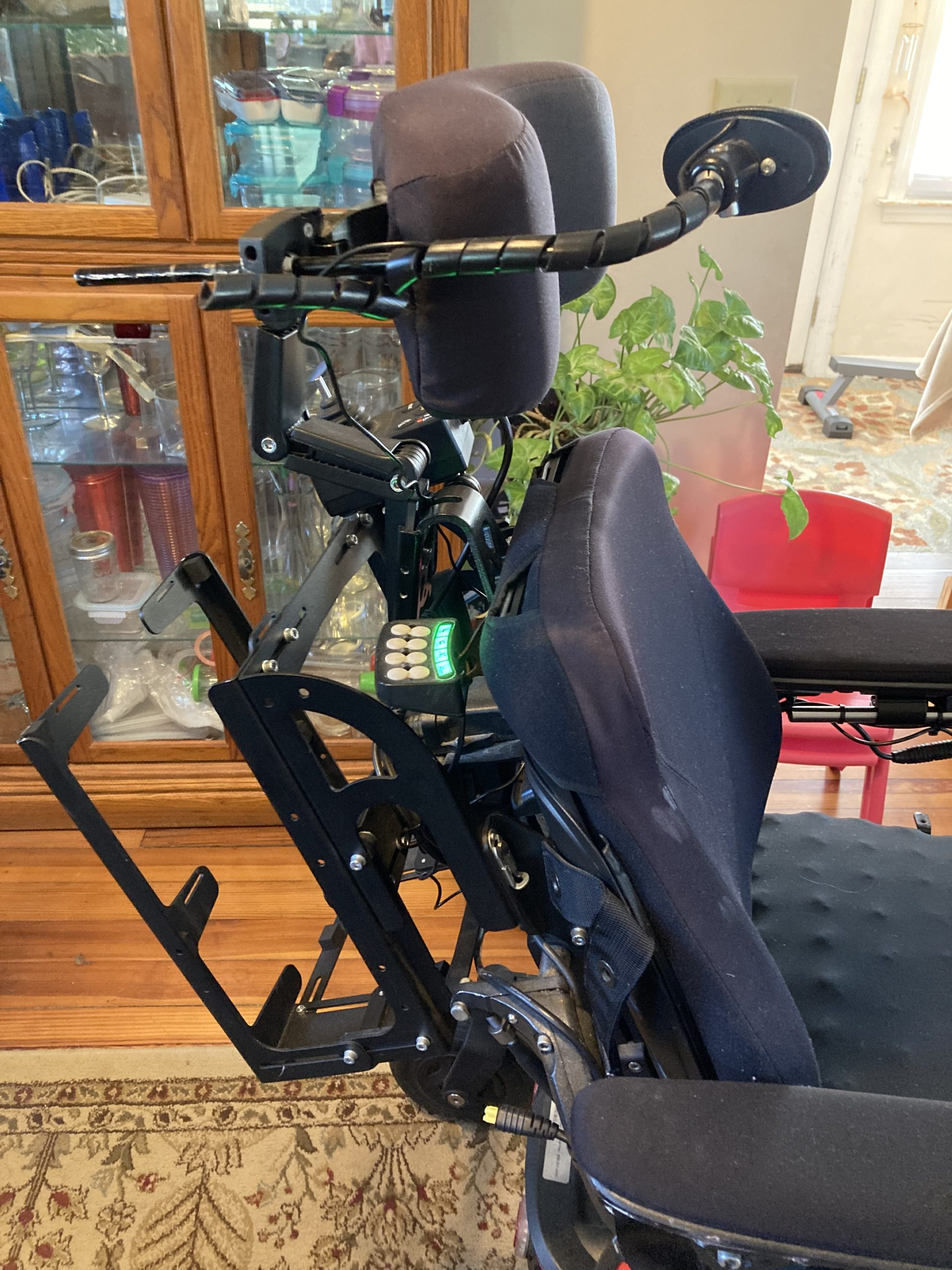 It does have extra parts included in making it fully dependent on head movement only as well. It has a rack on back for Trilogy 1000 ventilator which can be removed if not needed. It has good speed on it. You can adjust the feet height to fit the person using it.