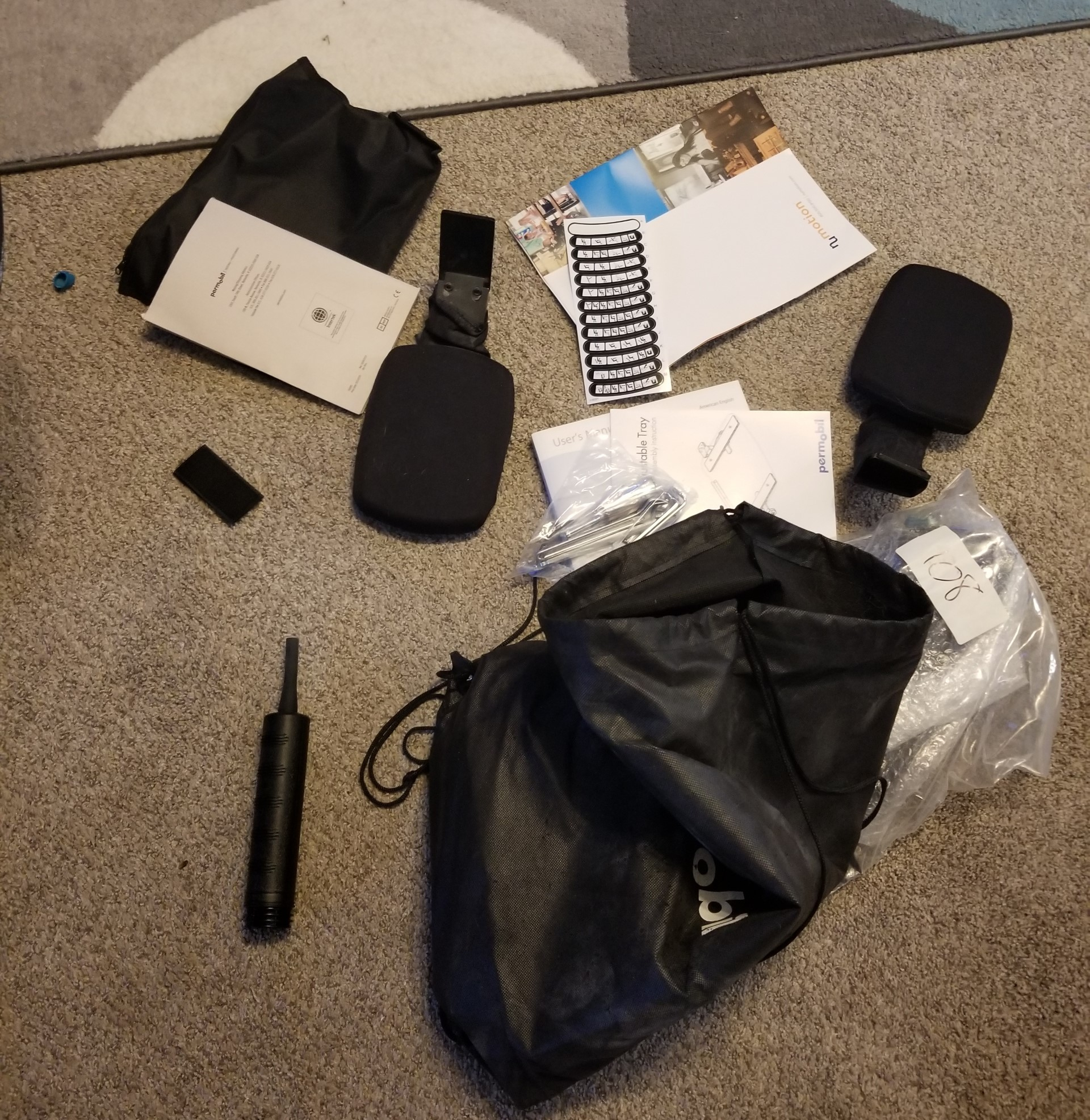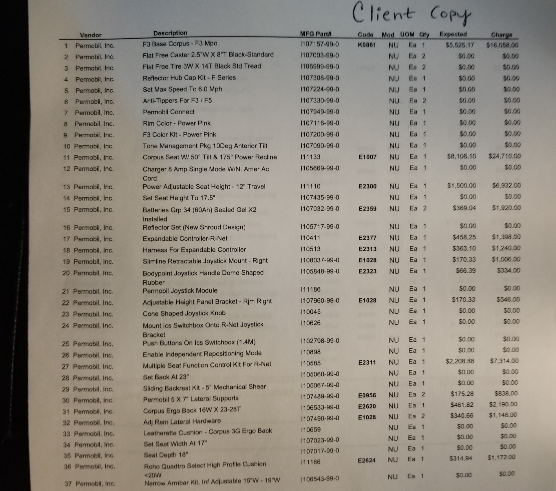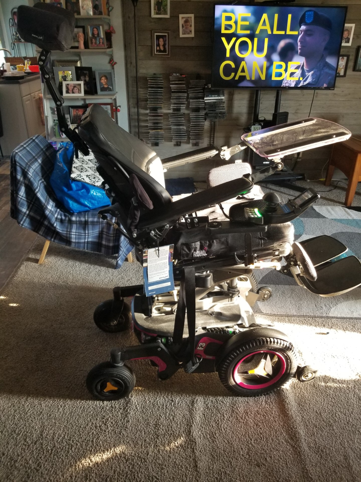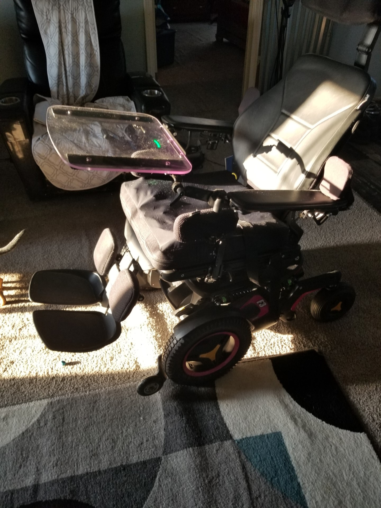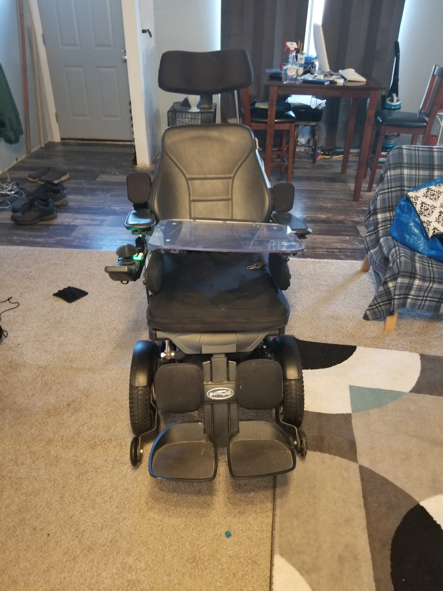 Permobile F3 Corpus. Lift seat. ROHO air seat. 2 chargers original and quick charge. Kit bag with accessories and tools. Adjustable tray. Only used for a few months. Battery still holds charge. Original tags and plastic cover on lights. Description of chair in pictures. 17" seat. 18" seat depth. Still in great shape and holds air. Chair lifts to kitchen cabinet height. Seat reclines. Foot base lifts and lowers as should. Owners manual and user instructions in kit bag. In my opinion this chair runs well and would be a great purchase at a reasonable price. Joystick controls are on the right hand side but I believe they can be moved or replace with controls that are not joystick based. Buyer will have to pick up at agreed location and must have vehicle large enough to load this powerchair. A ramp would be helpful as the chair is not light weight. I also think you can buy aftermarket products to change the color if you do not like pink.
