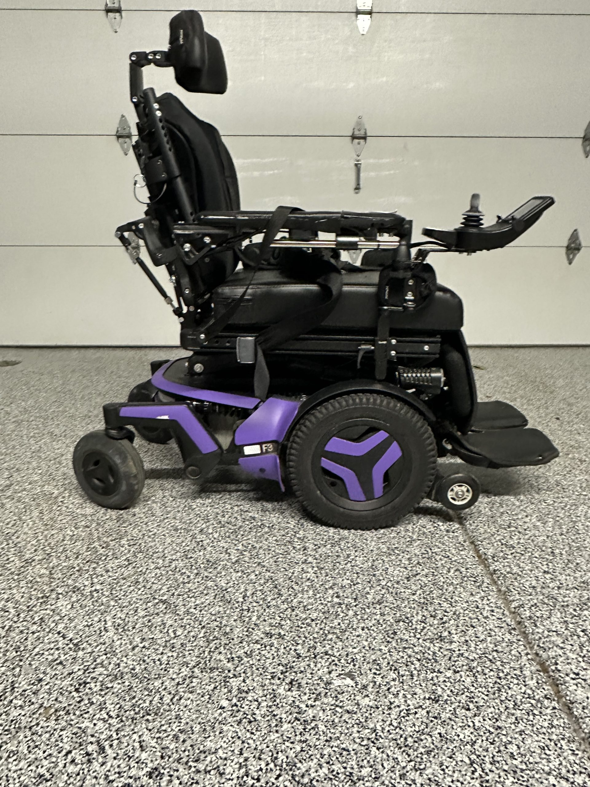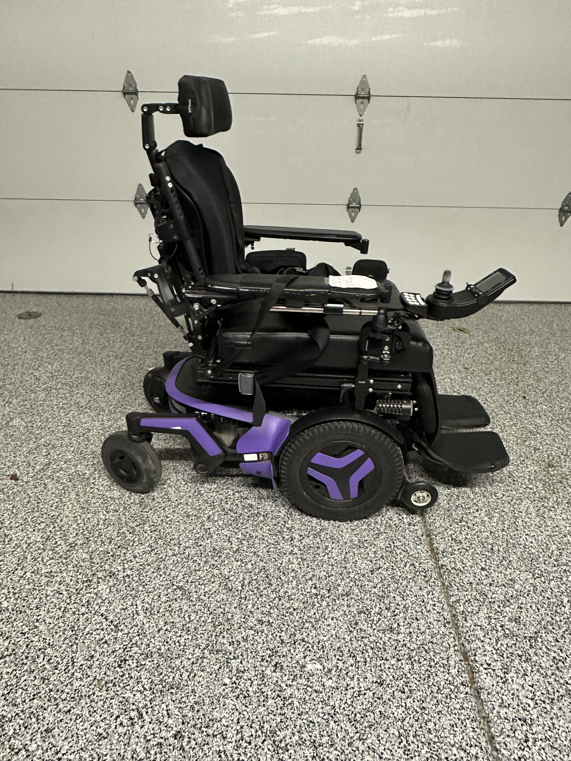 This Permobil F3 Corpus Power Wheelchair is in Like New Condition, This Permobil F3 Corpus Power Wheelchair features a 18 x 18 inch Cushion, Flip Up Foot Plate, R-Net Joystick, 14 inch Solid Drive Tires, a Battery Range up to 13 Miles, and has Power Tilt, Power Recline & Power Legs. Permobil offers the smallest footprint of this redesigned series of front-wheel drive F3 Corpus Power Wheelchairs. It's size and agility let users move quickly in and out of tight spaces like busy city streets and crowded areas like malls. The platform has a lower, repositioned center of gravity, which greatly improves stability while traversing inclines or declines. With its fully independent suspension, the F3 provides a comfortable ride and allows users to navigate the obstacles of life. The Permobil F3 Corpus is one of the best chairs you can buy for the money.