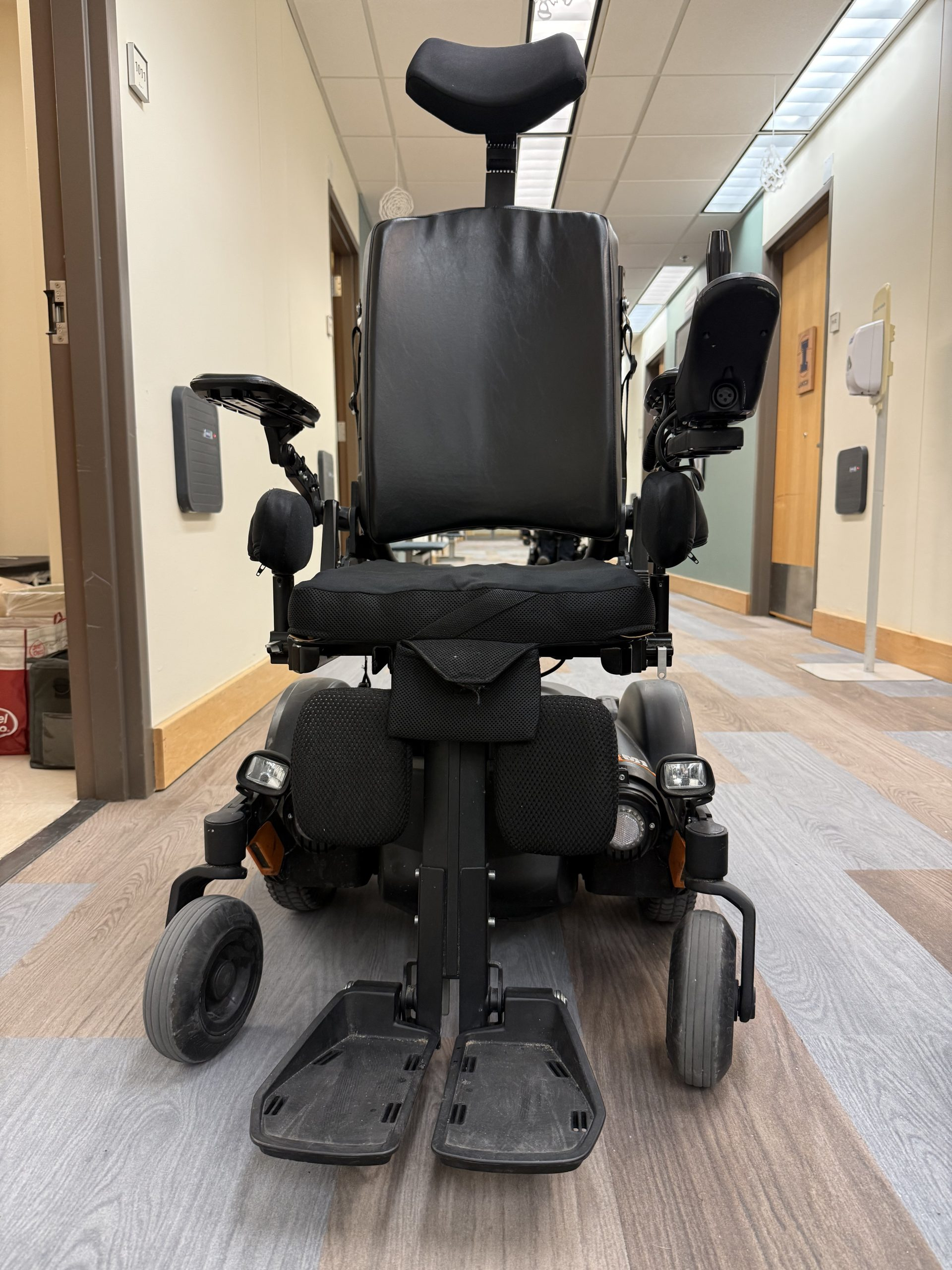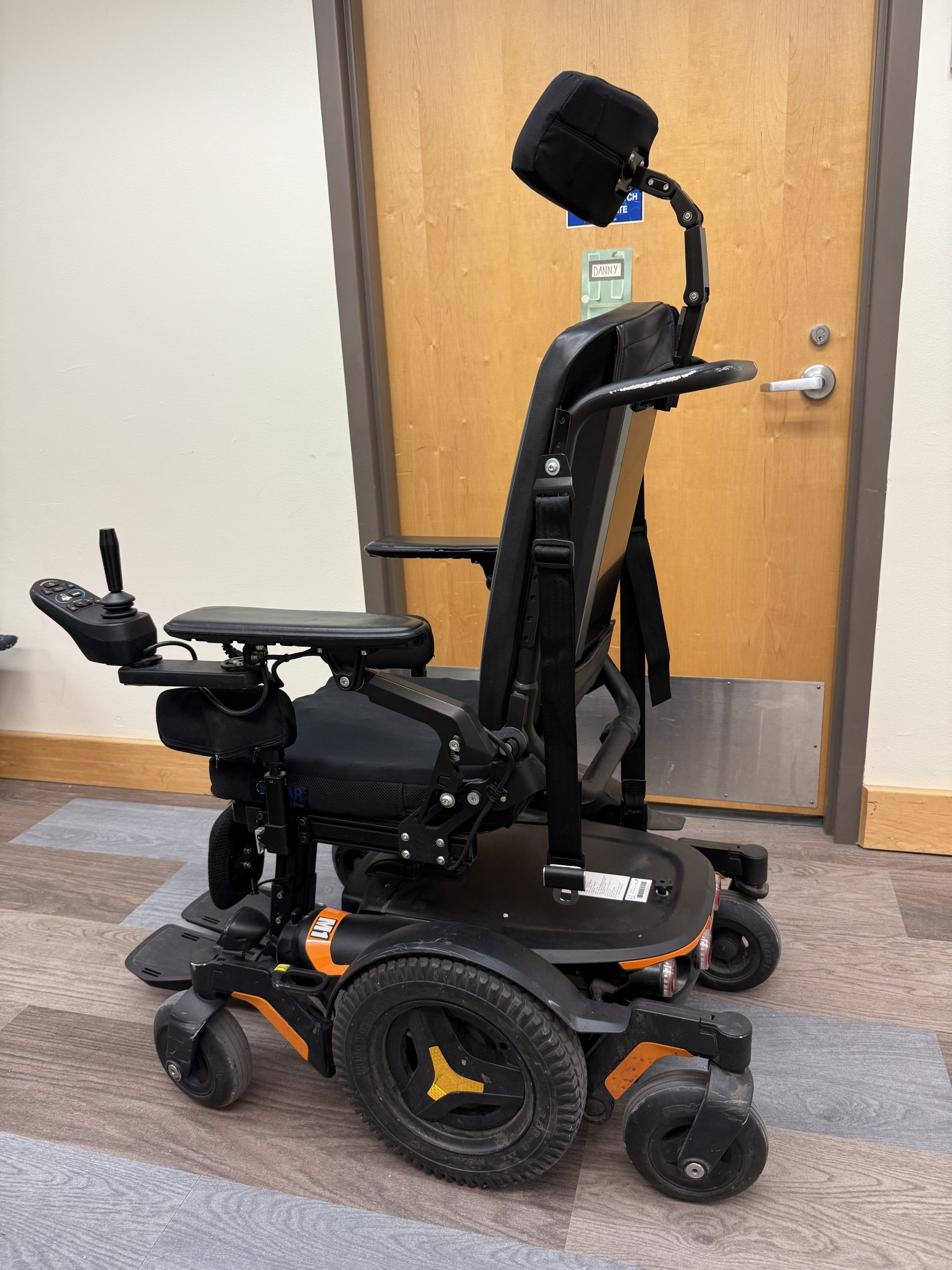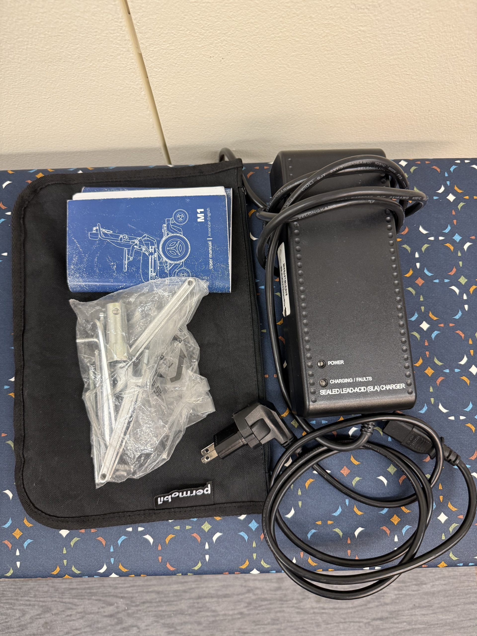 This M1 wheelchair is part of the premium Permobile brand and functions as a hybrid (somewhere between a light and heavy) wheelchair for individuals with all kinds of mobility impairments. Condition: used (few scrapes) but no impact on functionality