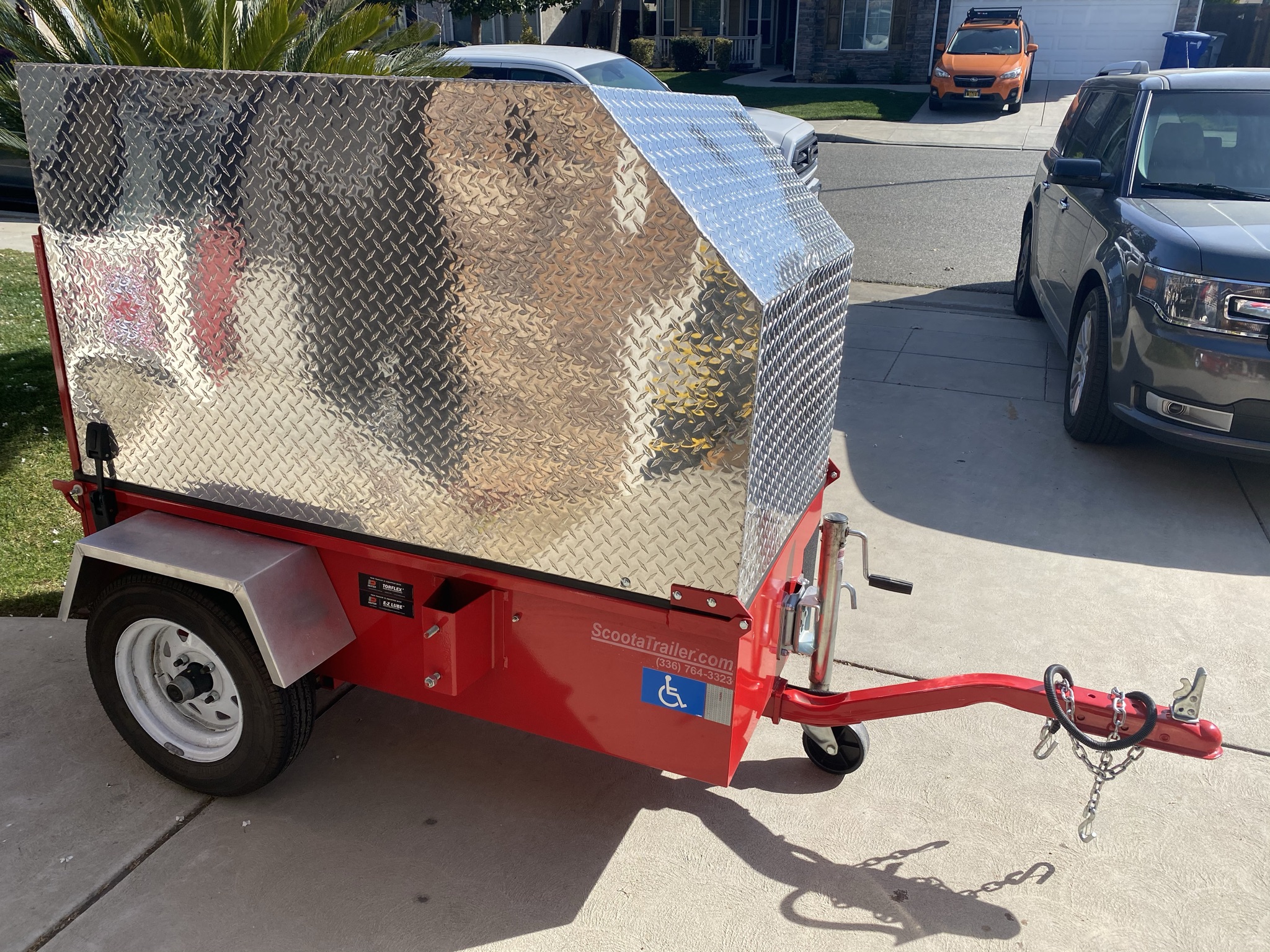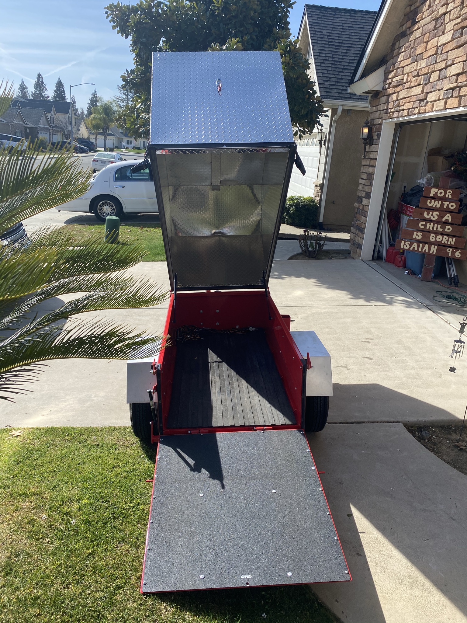 This is a scooter/wheelchair trailer we bought to haul my dads 400 lb wheelchair he passed and we need to sell new we paid $5600 for it it had less then a 100 road miles on it it is a great trailer totally weather proof you can check these out online total with the top because the top is an add on the cost new is $5600 the trailer is in like new condition the is one dent in the top front it was from the shipping strap other then that it is in like new condition we are in Fresno ca you can text me at the number list or email which ever is easier for you to do it come with a spare tire also which is not in the picture the specks are on the pictures that are attached phone number is 5593521328 text only I will not answer calls