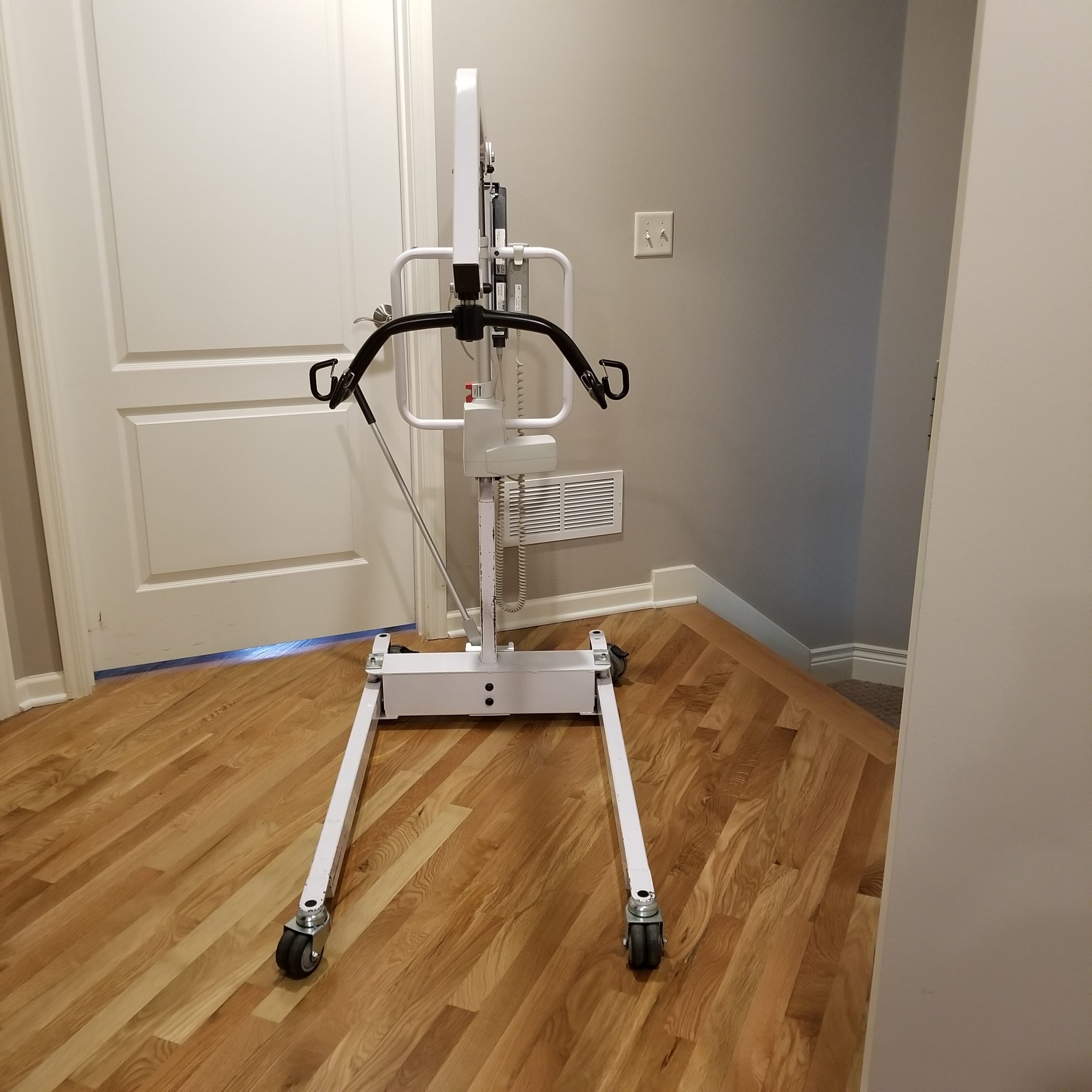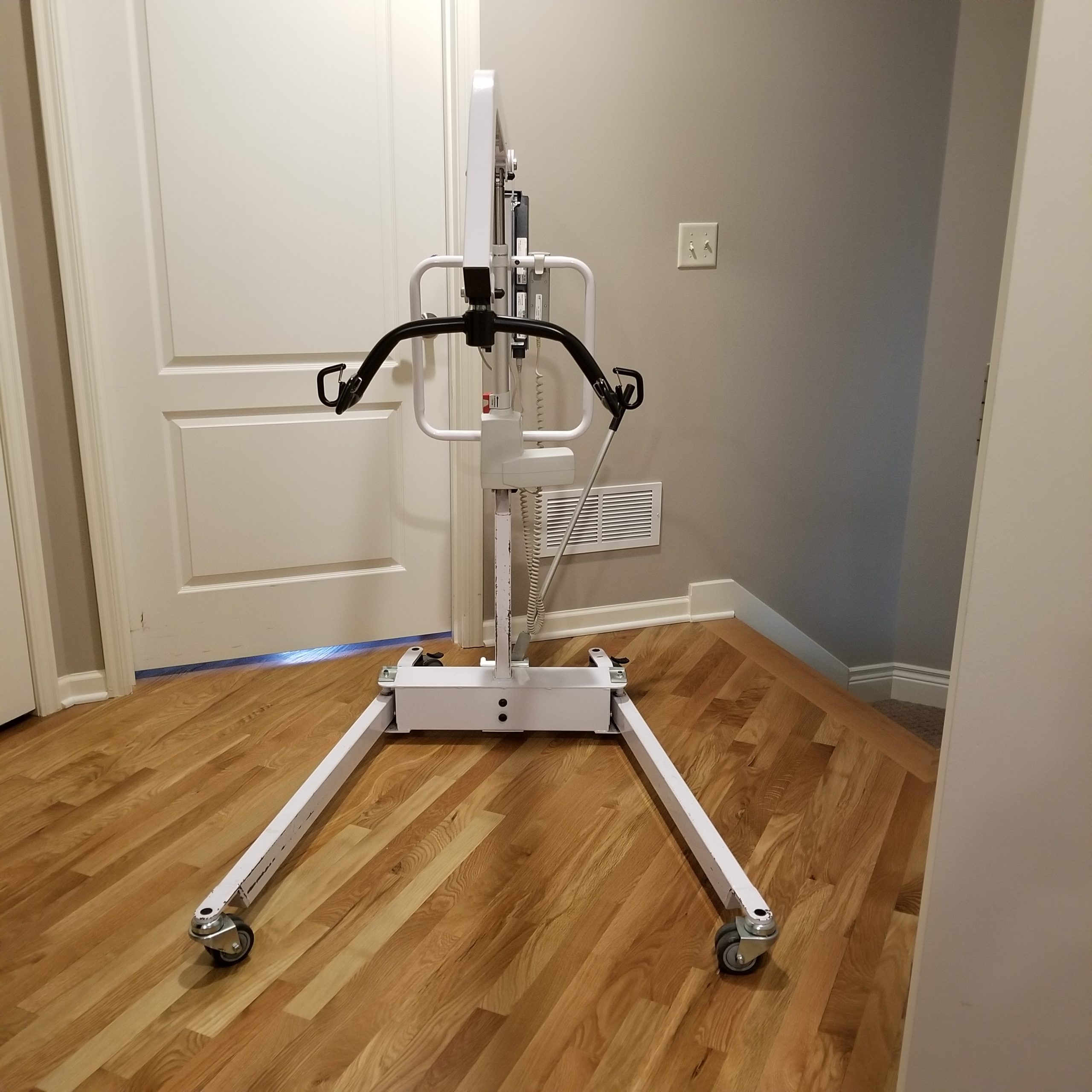 I purchased this lift along with the sling in Dec. 2009. It is in good condition and I also have an extra battery which is brand new. If you go to the following site it will give you all the specs. Although we had it since 2009 the only time it was used was to help him out of bed or into the shower chair. This is a product of Drive Medical, (Model No. 13240). The lift has an emergency manual lowering feature, a battery charge indicator and a pretty wide base. The base fit easily under the bed in order to position the body into the sling. I am a petite person and I had no problem maneuvering the lift around with my husband in the sling. The sling we bought for this lift was the Hoyer-4-Pt Padded U-Sling with head Support I paid $148 for it back in 2009. I won't be selling the sling with the Lift as it is used.
