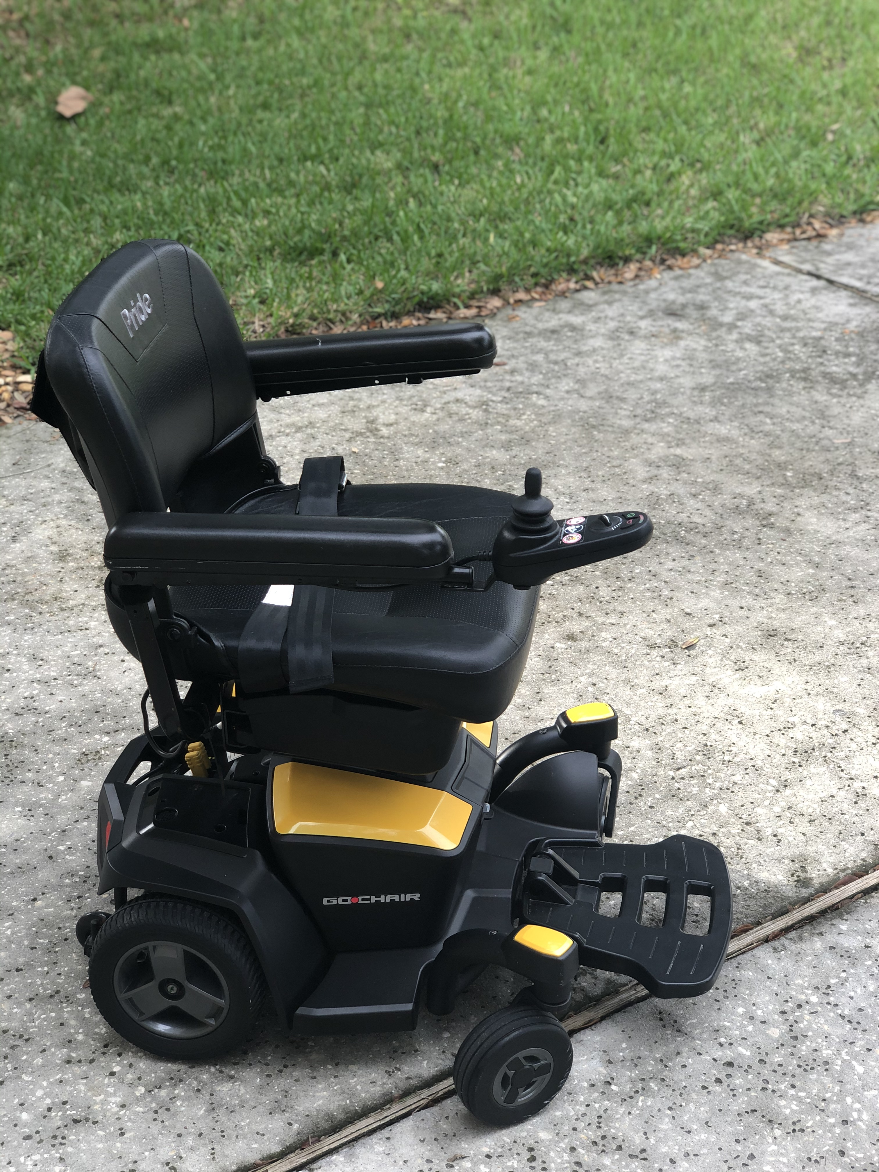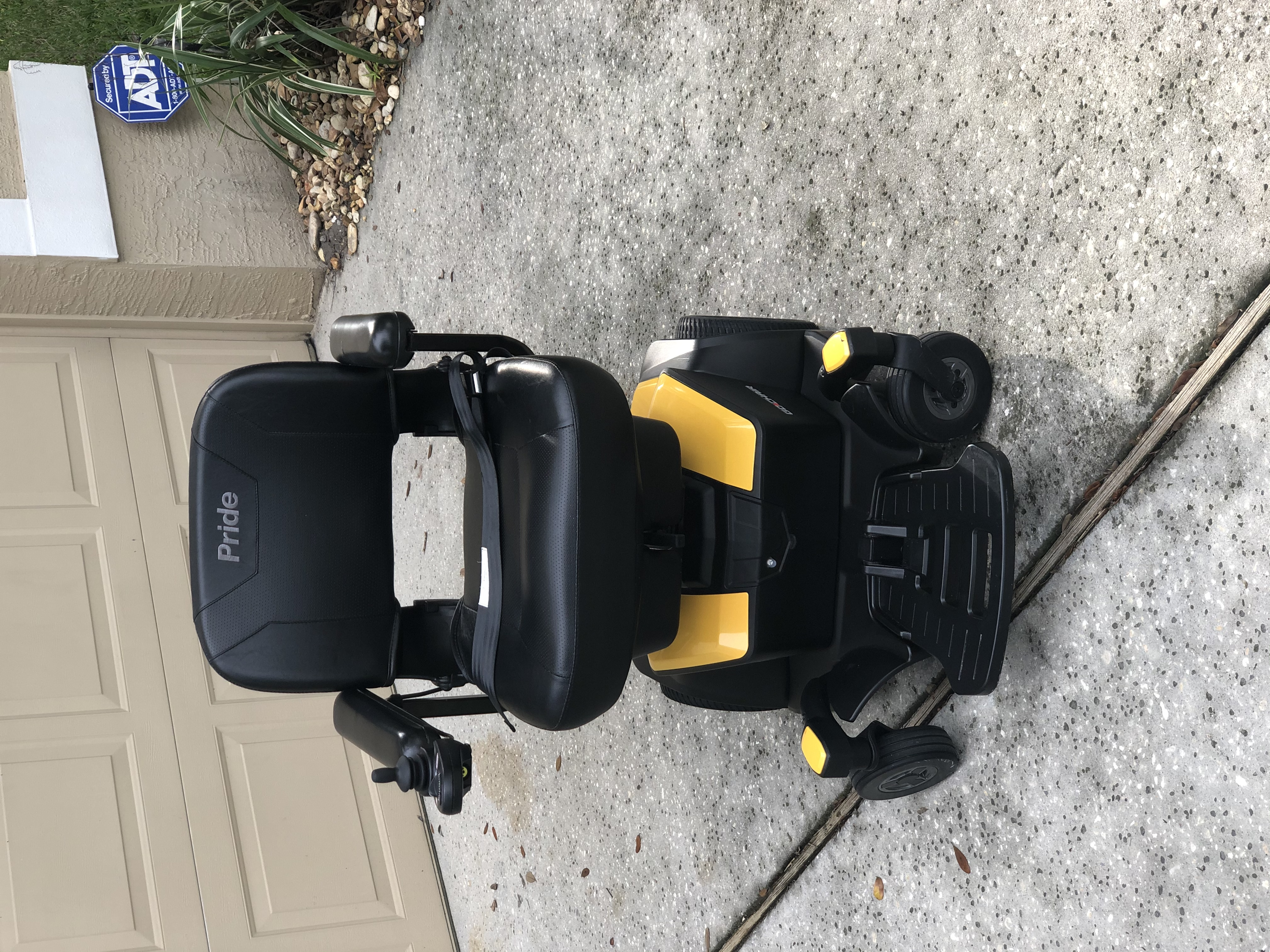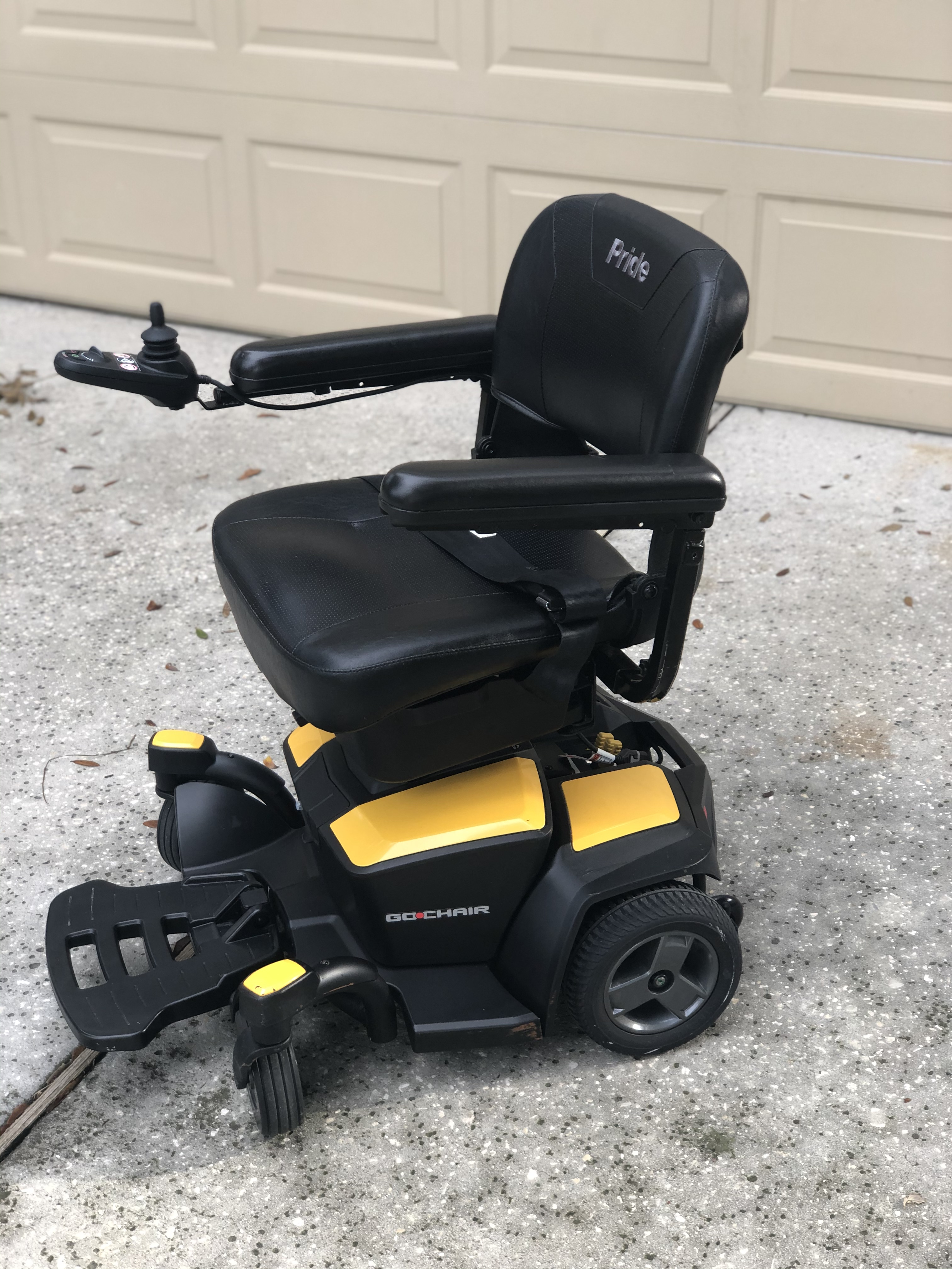 2017 Pride GoChair1001 is hardly used and is in great shape. New arm rests and shrouds. Manual and charging cable included. The seat has 2 storage areas, arm rests raise, and seat swivels 90 degrees left and right. The chair has a zero turn radius that makes it easy to travel down hallways, make tight turns around corners.