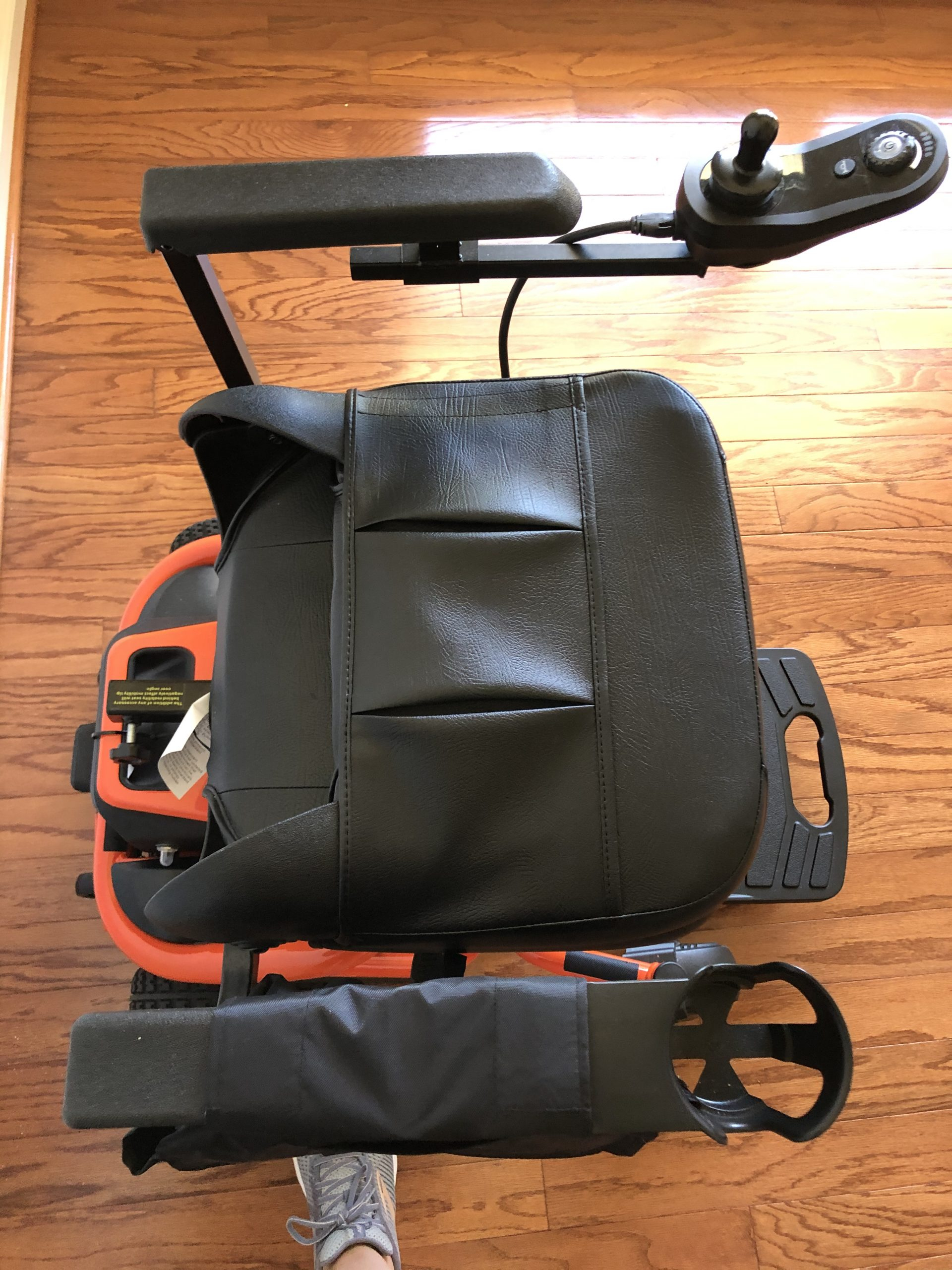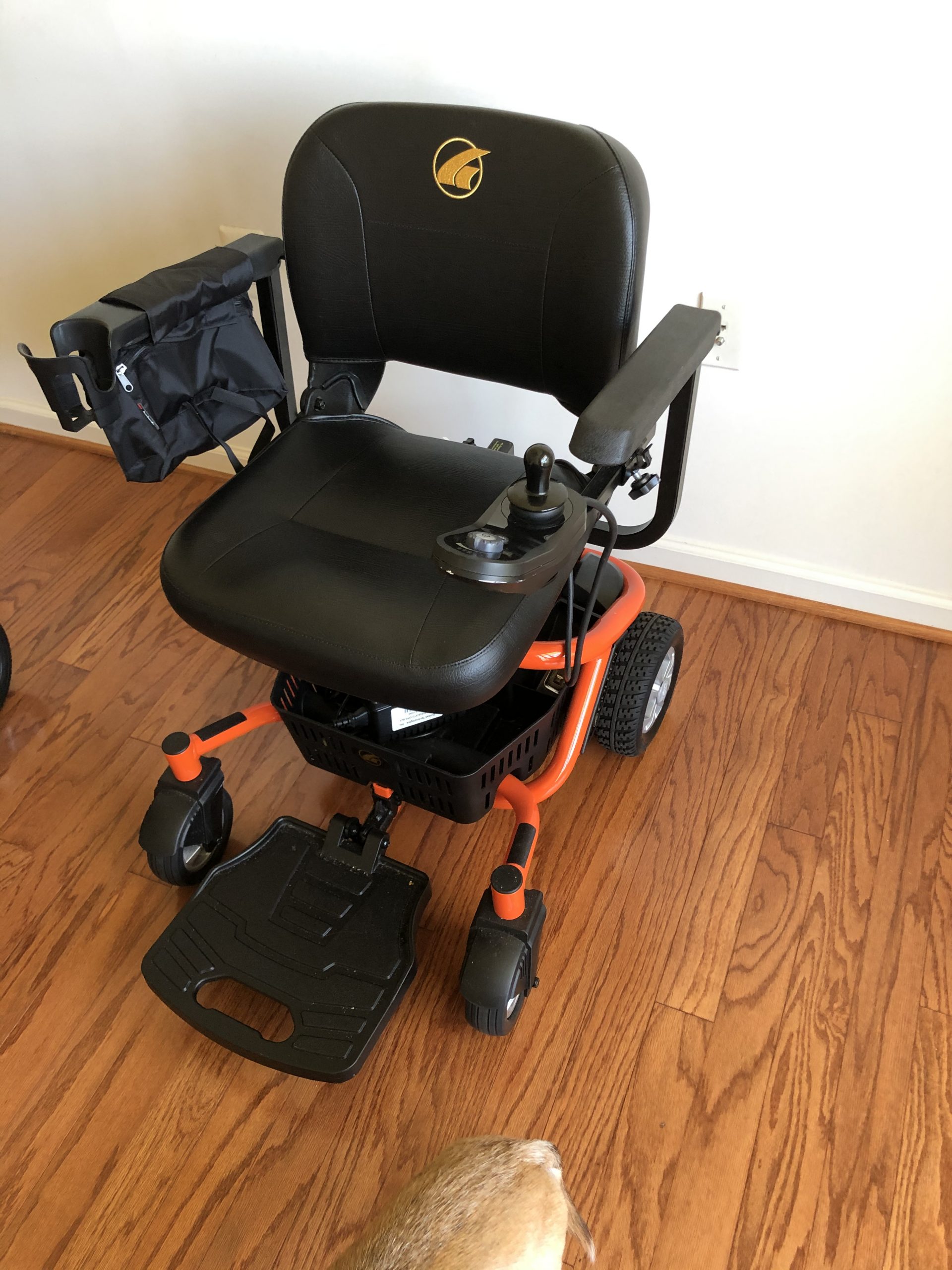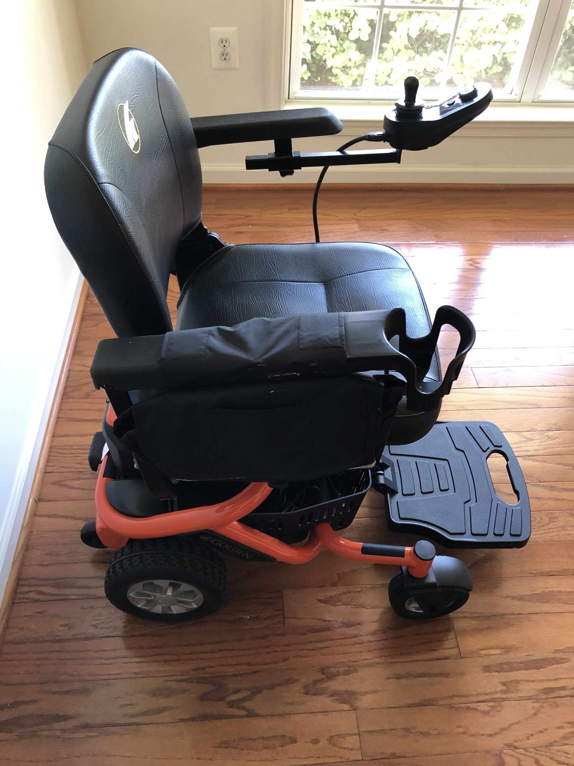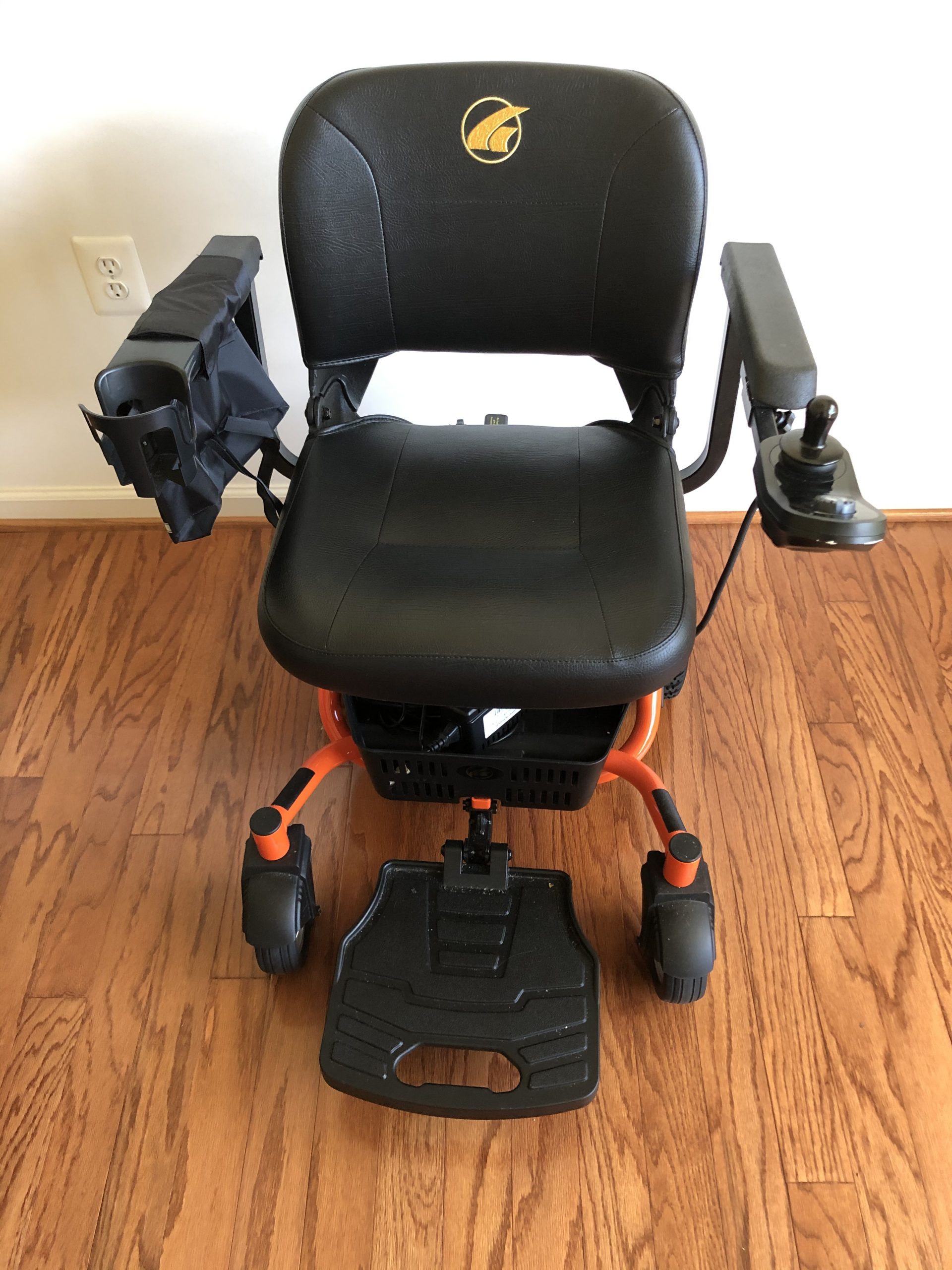 - Power Wheelchair for sale-almost brand new! Golden-Literider Envy-GP162-Power Chair. Purchased brand new in August 2020. Color is solar flare orange. The seat rotates to the right and left for easy on and off loading. Foot rest folds upward. Turning radius is 26 inches. Operating range is 15.5 miles. Top speed is 5 miles per hour. Speed setting can be regulated to make it slower or faster. Disassembles into three pieces in minutes. Brand new battery. Manual and charger included. Under seat storage basket and cup holder. Located in Fredericksburg, Virginia. Will deliver within a 1.5 hour radius. If you would like to try it out you will need to come to us. This wheelchair was only used a few times. It is very light and easy to maneuver. It’s wonderful for seniors or anyone with mobility issues and can greatly increase their independence. It maneuvers especially well in smaller settings, including hallways and elevators. Our hope is that someone who needs it can make good use of it for years to come.