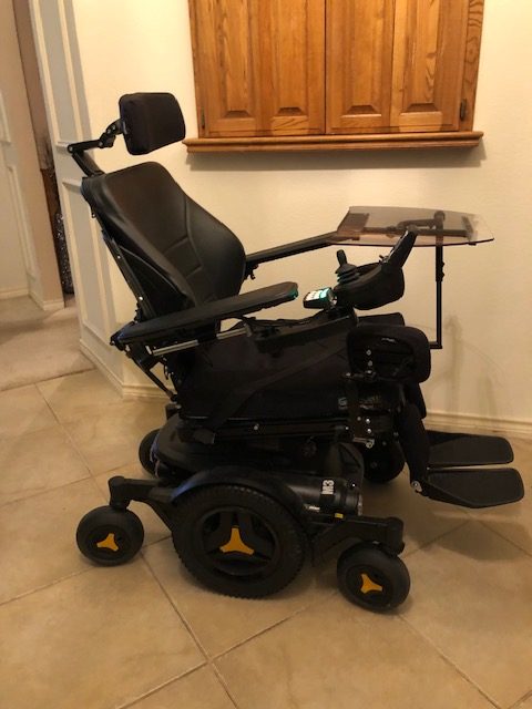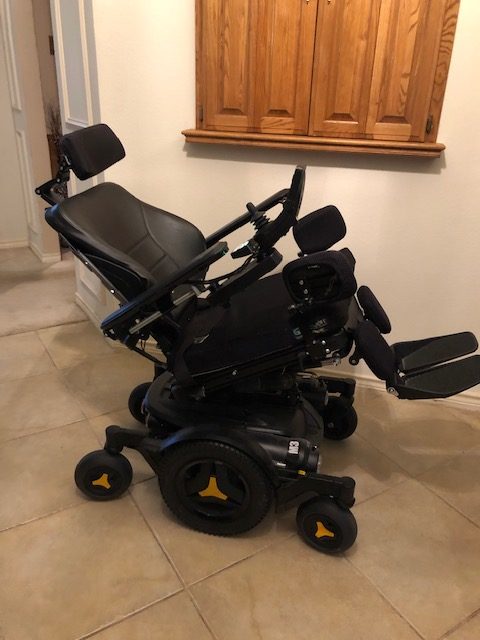 Excellent condition. Rarely used. Our adult with Duchenne's Muscular Dystrophy recently passed away. He was primarily bedridden when we got the chair new. He used the chair to go to doctor appointments and for occasional short family outings.