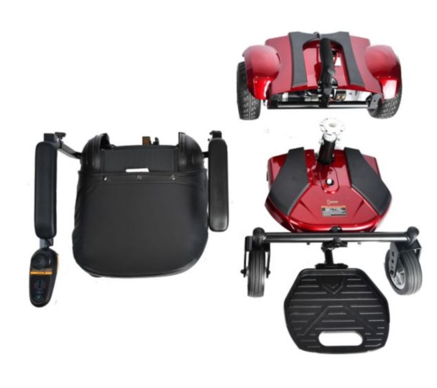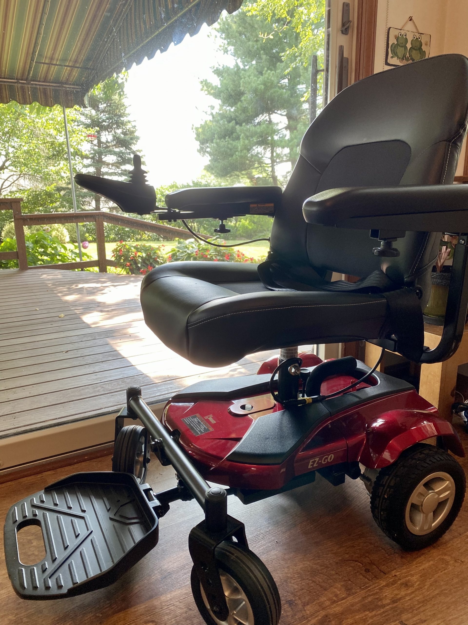 2020 Merits EZ-Go Power Chair is almost new. The new-battery powerbase chair is great for home and easy for car travel with a 3-Piece quick-connect assembly. Each piece has an easy way to pick up the unit and put into a trunk or even the back seat of a car. You are in control of the chair with a fun joystick to help you maneuver in tight spaces. With its 23” turning circle, it basically turns in place making it a great selection for small rooms and elevators. You can also drive right up to any dinner table without chair interference since the armrests will flip back out of your way. Charge the chair overnight using a standard wall outlet. Other features: high-back cushion seat, an optional oxygen tank holder goes behind seat, chair’s weight capacity 250 lbs., hinged foot plate, H 18.7-20.7” L 35.6” W 21.5,” battery charge up to 9 miles. This chair shipped after Assisted Living Residence Covid lock-down restricting almost all use—VERY lightly used only during a 2-month span. We just purchased a brand-new Duracell battery after chair sat idle. This is a Deal. Original Purchase price: was $1,600 included $99 oxygen tank holder. Handsome red color with black trim (pictured). Now selling for $975.