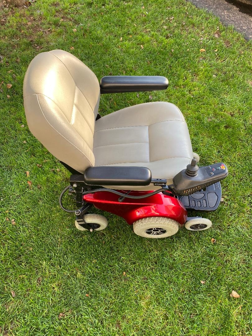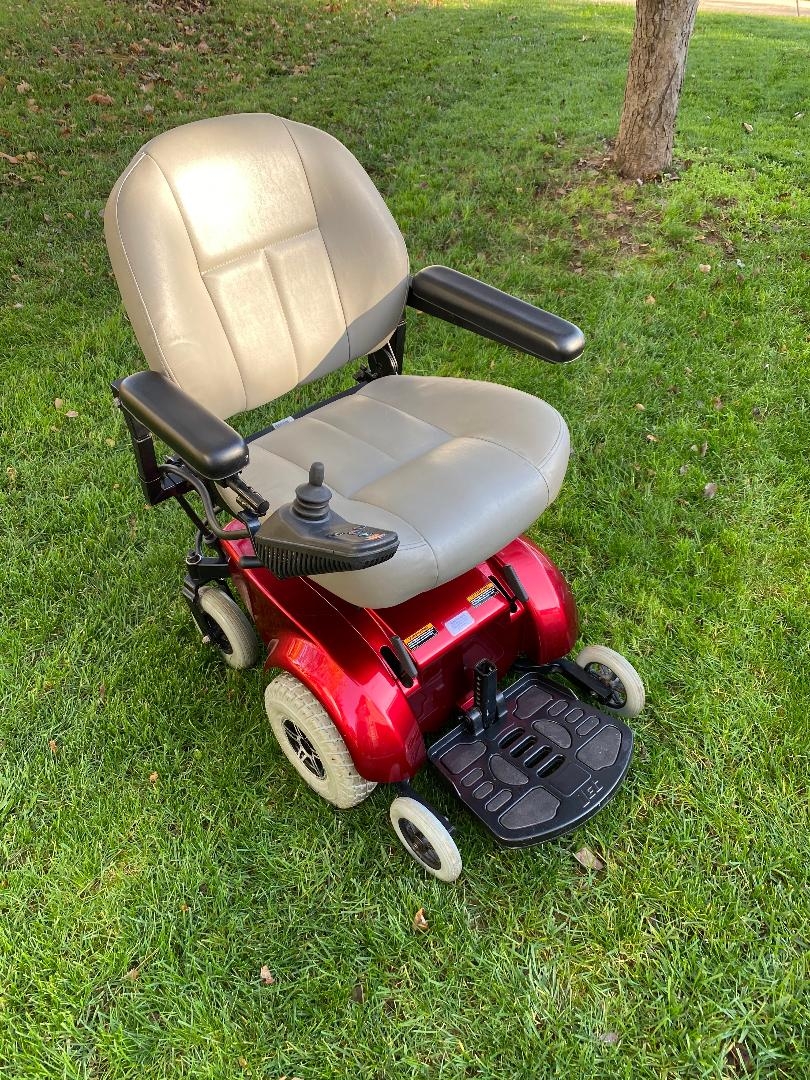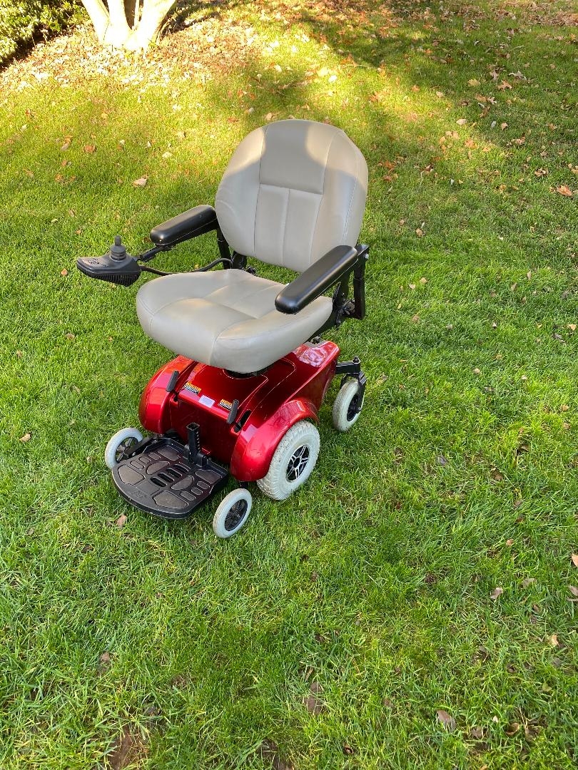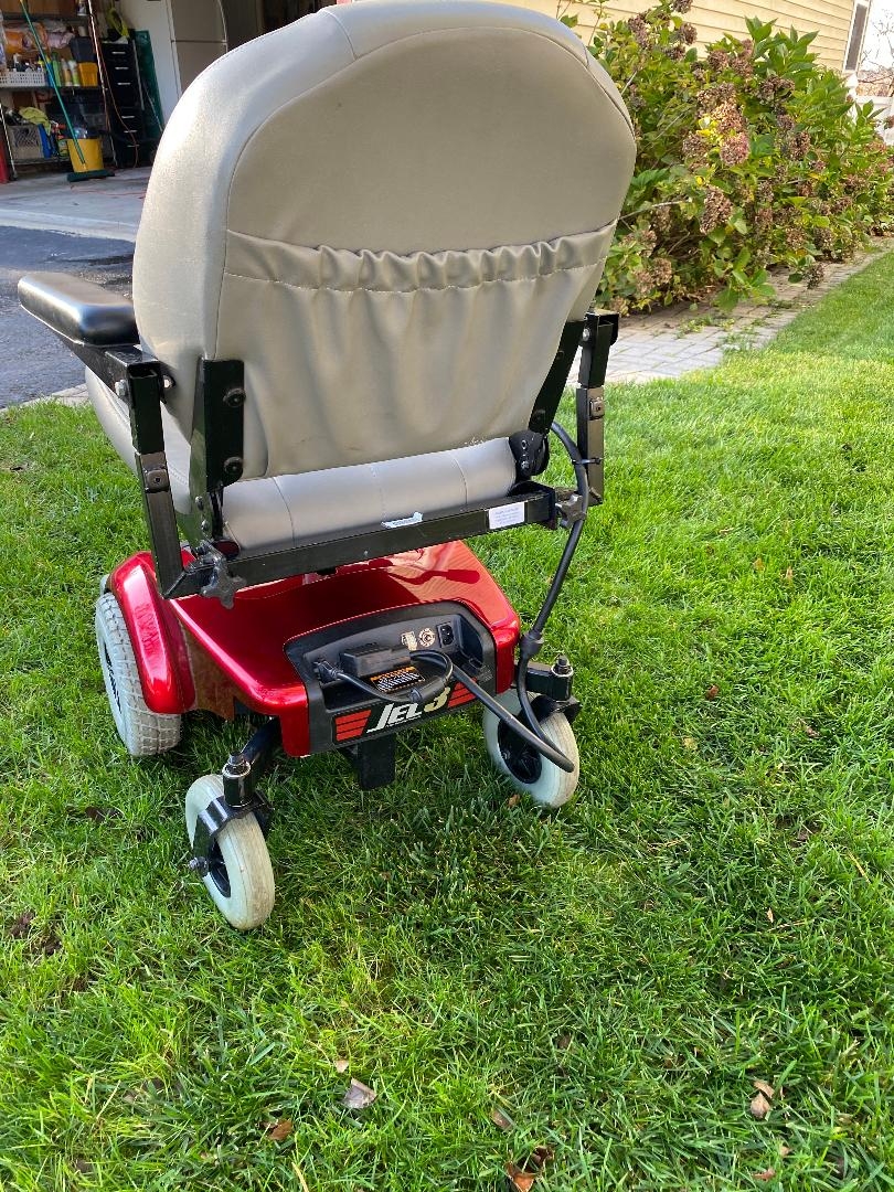 This Pre-owned Pride Mobility Jet 3 Power Wheelchair is in Great Condition. It has been in storage for 12 years and has 2 new batteries (November 2020). This Jet 3 Power Chair features a Built in Battery Charger, VSI Joystick, 14 inch Solid Drive Tires, and has a Battery Range up to 25 Miles! The Jet 3 delivers superb close-quarter maneuverability, sleek styling and high-performance technology - all at a great value. With a shorter wheel base the Jet 3 Ultra offers an excellent turning radius of only 19.5 inches and is only 24.5 inches wide, making it easy to fit into tight spaces. Combine all of that and you get a Power Chair that performs just as well outdoors as indoors! Plus, the style is fresh, exciting and contemporary. These things combine with a truly economical price to make the Jet 3 an excellent overall value in personal mobility.
