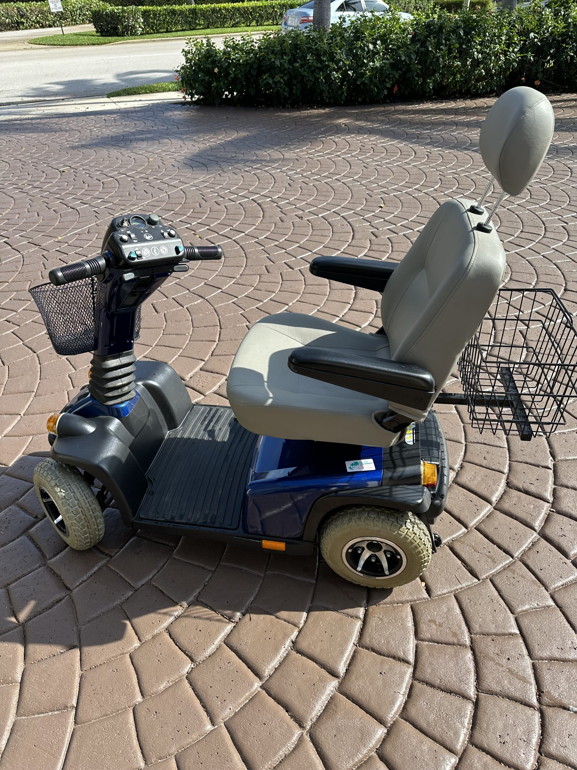The Pride Legend XL - 4 wheel heavy duty scooter offers a full complement of all-new luxury and convenience features such as: full suspension, durable high- impact bumpers and fenders and a full lighting package, including fender mounted directional headlights. The fully adjustable, deluxe reclining seat with full range sliding mechanism, adjustable headrest and flip-up arms provide the ultimate in seating comfort. The four-pole motor and 110-amp controller give exceptional power, torque and efficiency. The large 13 inch pneumatic front and rear tires and the 4 inch ground clearance allow you to travel with ease and comfort. The XL offers the best of true rugged outdoor durability, luxury features and stylish elegance. New batteries recently fitted, in good working order.