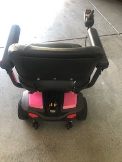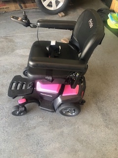 2018 Pride Mobility Go Chair, 4 wheels. Pink and black in color, seat folds, arms are easily removed for transportation if needed, storage bins. Was used twice so is brand new. Perfect condition, no flaws. This is a steal at $1100.00. 2 batteries that are rechargeable. A charging cord is provided to charge the batteries. Do not charge for more than 24 hours at a time. The charge cord plugs into a standard outlet. The seat and the arms are adjustable, this seat has a seat belt. The joystick controls the direction that you wish to go and there is a speed control lever. There are anti tip wheels on the back of the unit. The battery pack can be removed if needed to charge it, or leave it in the chair and charge the battery that way. The foot platform is adjustable as well as the seat height and arm rest heights.