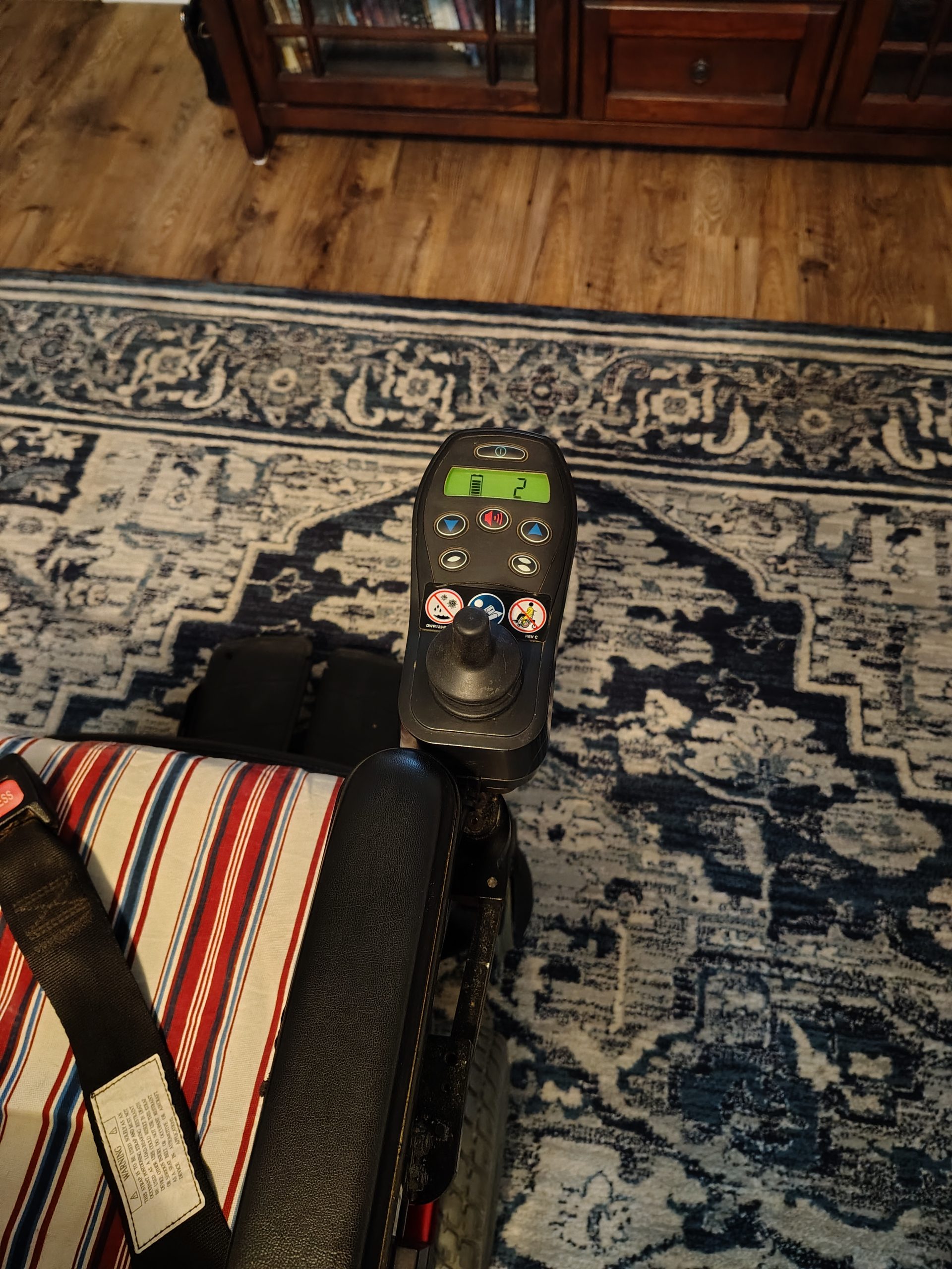 Tru-Balance 2 power elevating seat. Tru- Comfort hand grips to push if the battery dies, the wheelchair can be pushed like a manual chair. 4- Speed full battery charge joy stick controller, right-handed. The chair will lift, recline back. Legs can be lifted to a higher position.