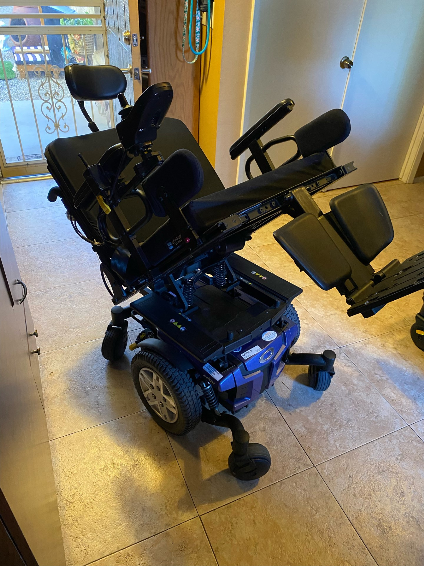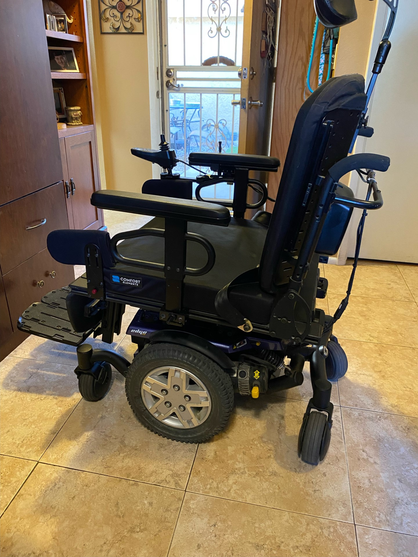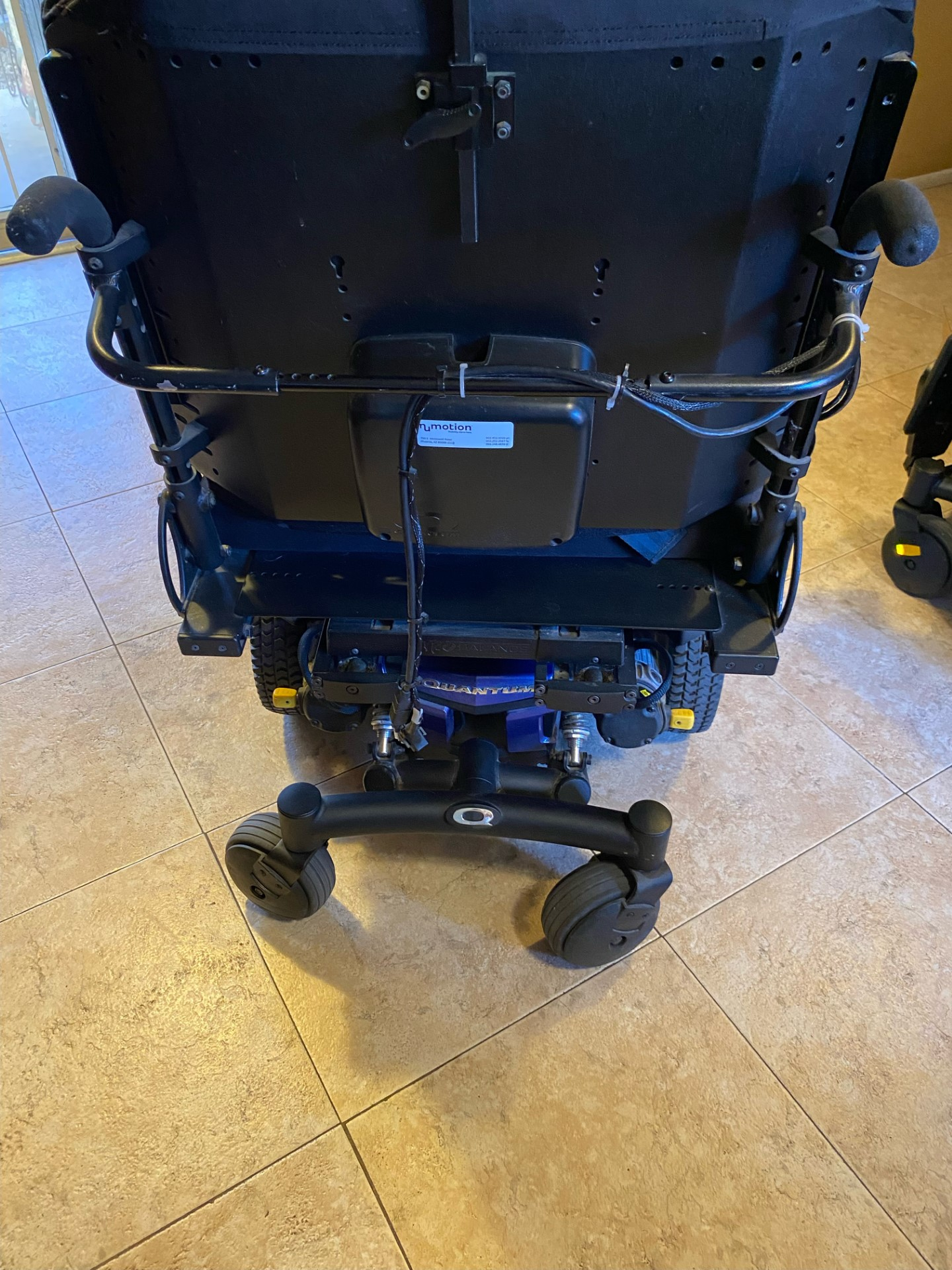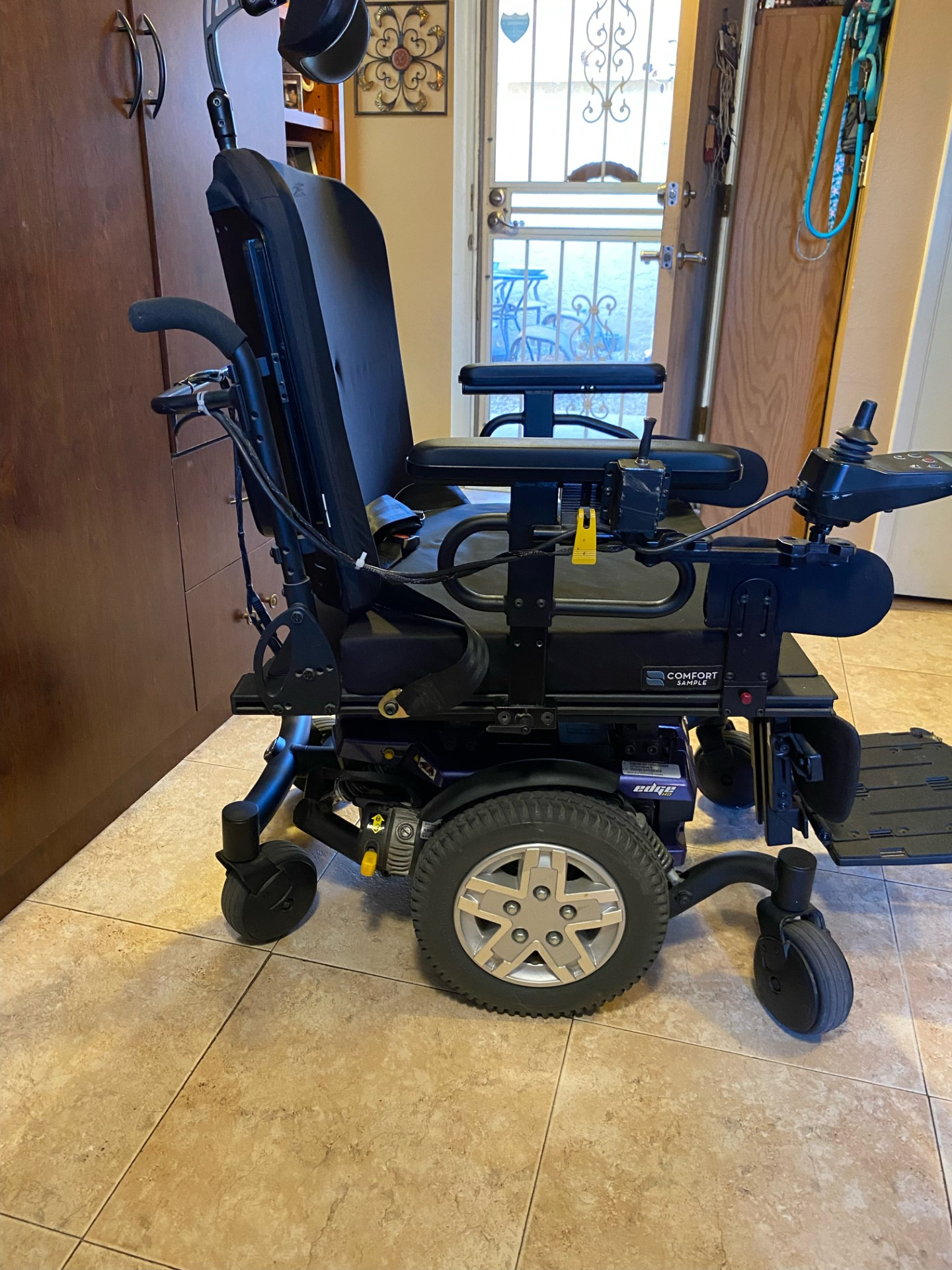 This is a Pride Quantum Edge HD power chair. This chair was built for a large person. The seat is 24 inches across. The chair was sold by and has been serviced by NUmotion since new. The batteries are approximately 6 months old. The chair is in excellent condition. Everything works as it should. I am the original owner. The legs don't lift. The tires are also like new. There are no rips or tears in the upholstery. The seat cushion is a deluxe version and was very expensive. All of the controls are in excellent condition and work as they should. The chair has a separate switch for the reclining operation. The battery charger is a new version and the chair is capable of traveling a long distance. This power chair has always been stored inside when not in use. The headrest and back cushions were also upgrades. I cannot ship this item. You must come pick it up. The terms are cash only. I will consider all offers on the chair. One of the photographs I have included provides a good description and shows the initial cost of the chair. If you need more information please feel free to contact me. Thank you.