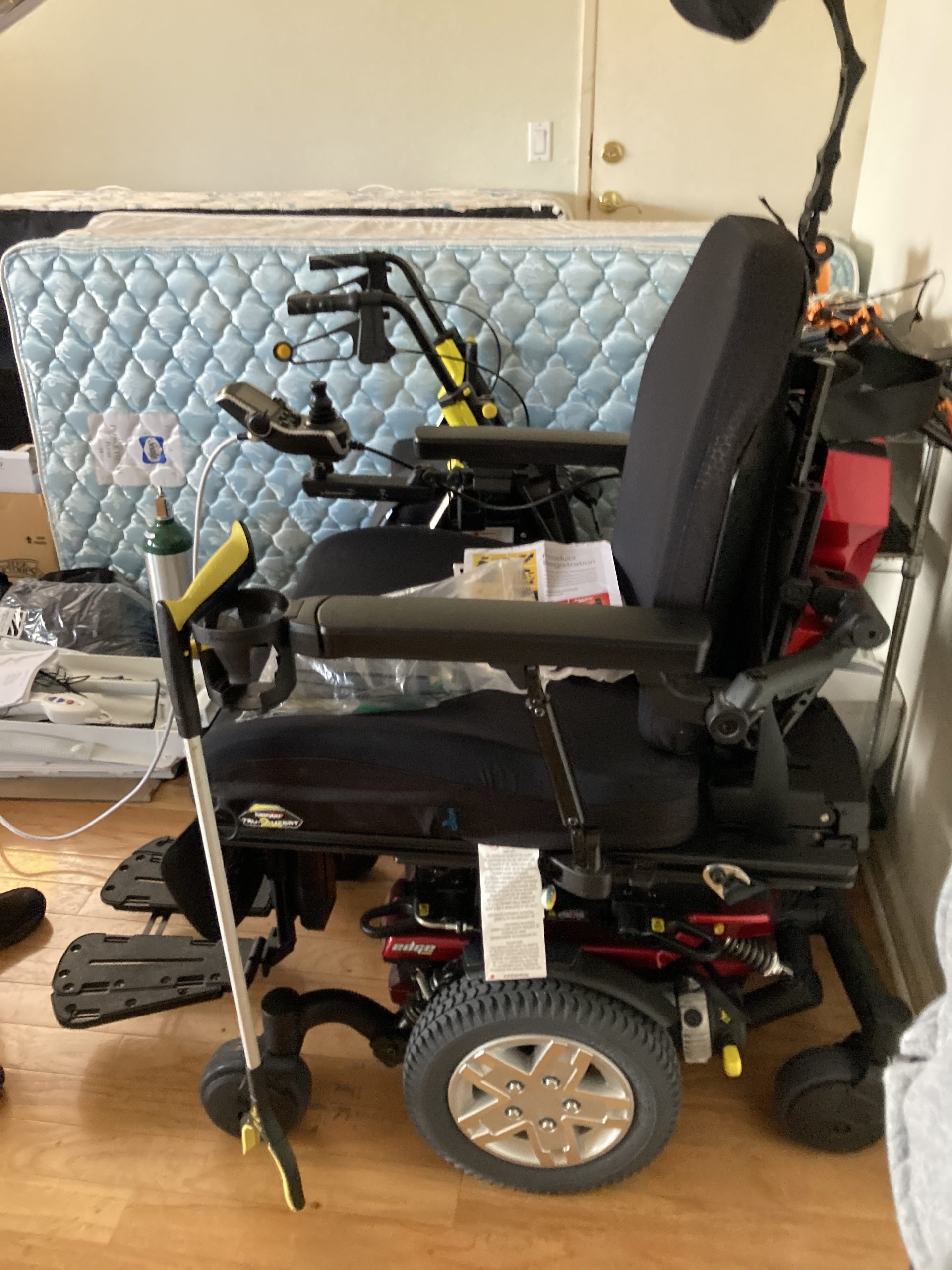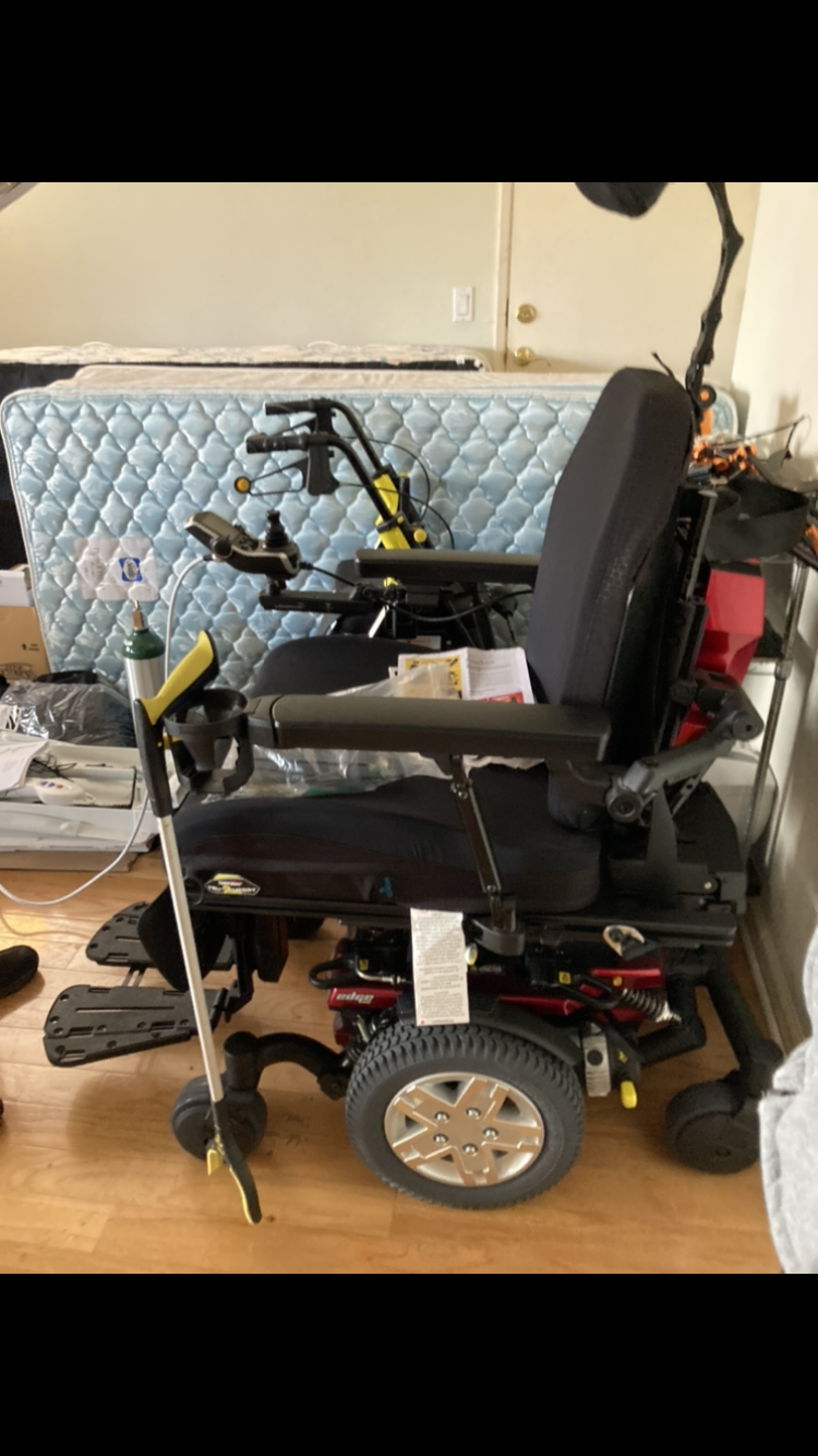 This is a state of the art top-of-the-line Life enhancement power chair made to increase mobility. The chair is equipped with pneumatic tires. The chair is equipped with two powerful brake systems including disc brake and regenerative brakes that use electricity to quickly stop chair. Desk parking brakes activate automatically when regenerative brakes slow. It is equipped with front and back caster wheels. These are considered anti-tipping wheels. Has 6 mph motor and synergy seating system. Attendant control and mounting brackets. NE plus Joystick can control up to two power functions. Two egg switches can be used as an alternate access for on or mode or tilt functions. The person this chair was purchased for was over 6‘3“ tall and 340 pounds. This is the perfect chair for a bigger toer person. This chair was purchased in June of last year for over $32,000 and was never used. Unfortunately the person who the chair was purchased for passed away before they could use it. We are also including two brand new ramps with chair. Look on factory manufacturer‘s website and YouTube for videos. This chair is absolutely incredible and will change someone’s life. We are located in Rohnert Park Sonoma County California