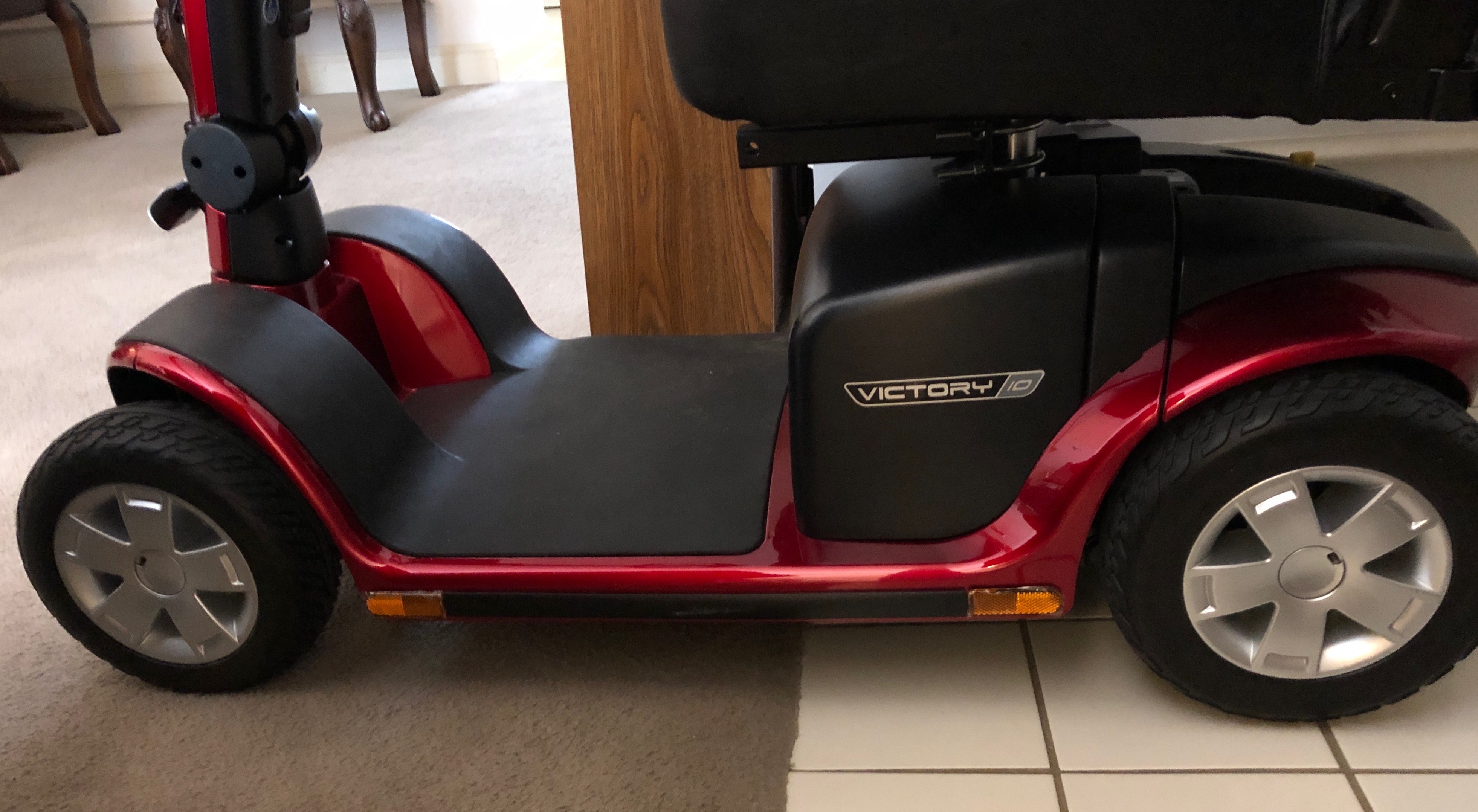 This Candy Apple Red “Pride Victory 10” 4-wheel scooter is practically brand new. Originally purchased October 2018, it was very lightly used until February 2019, (4 months of use/has only required a recharge once/stored inside home). Vehicle lift for scooter available as well.