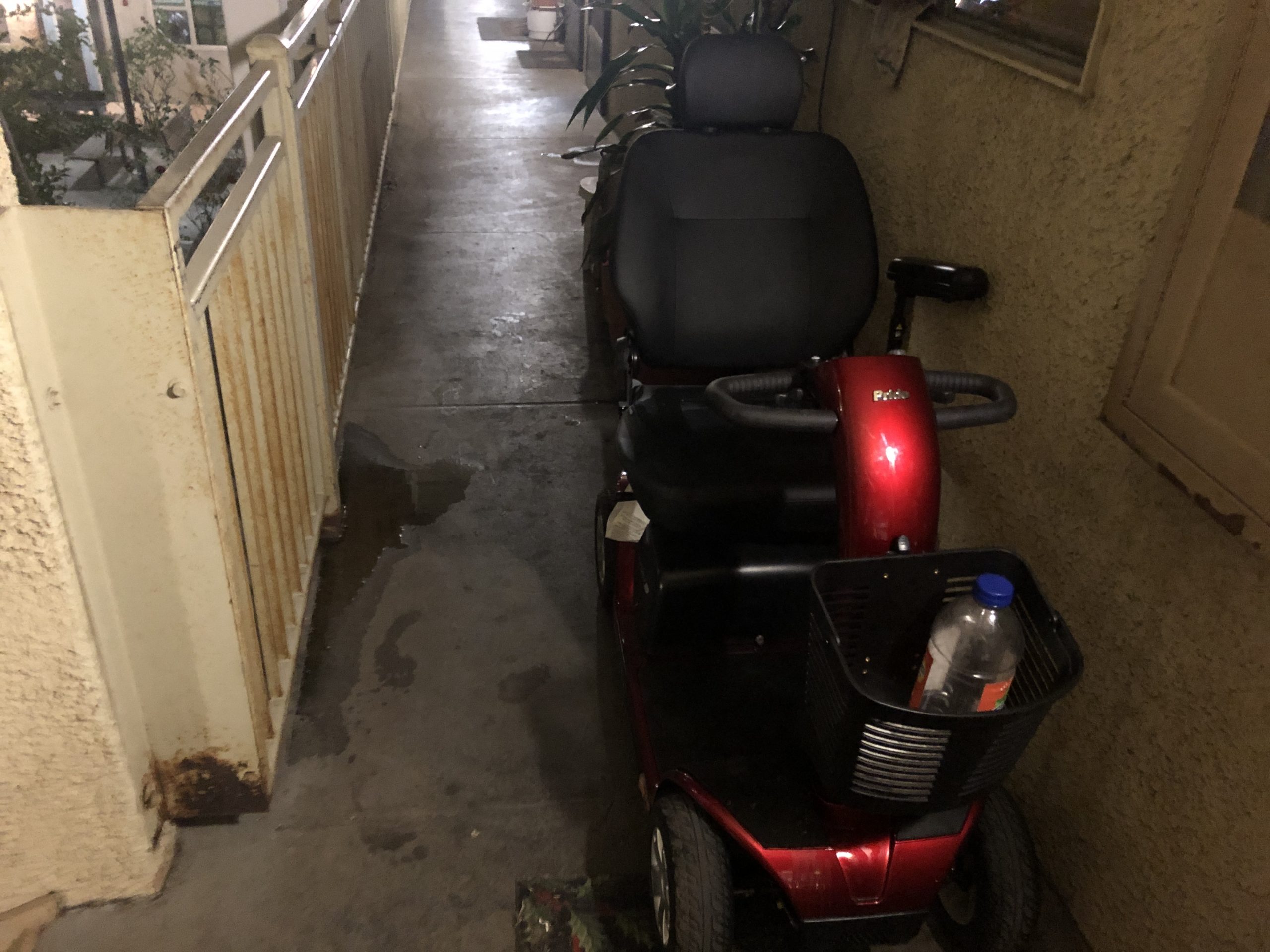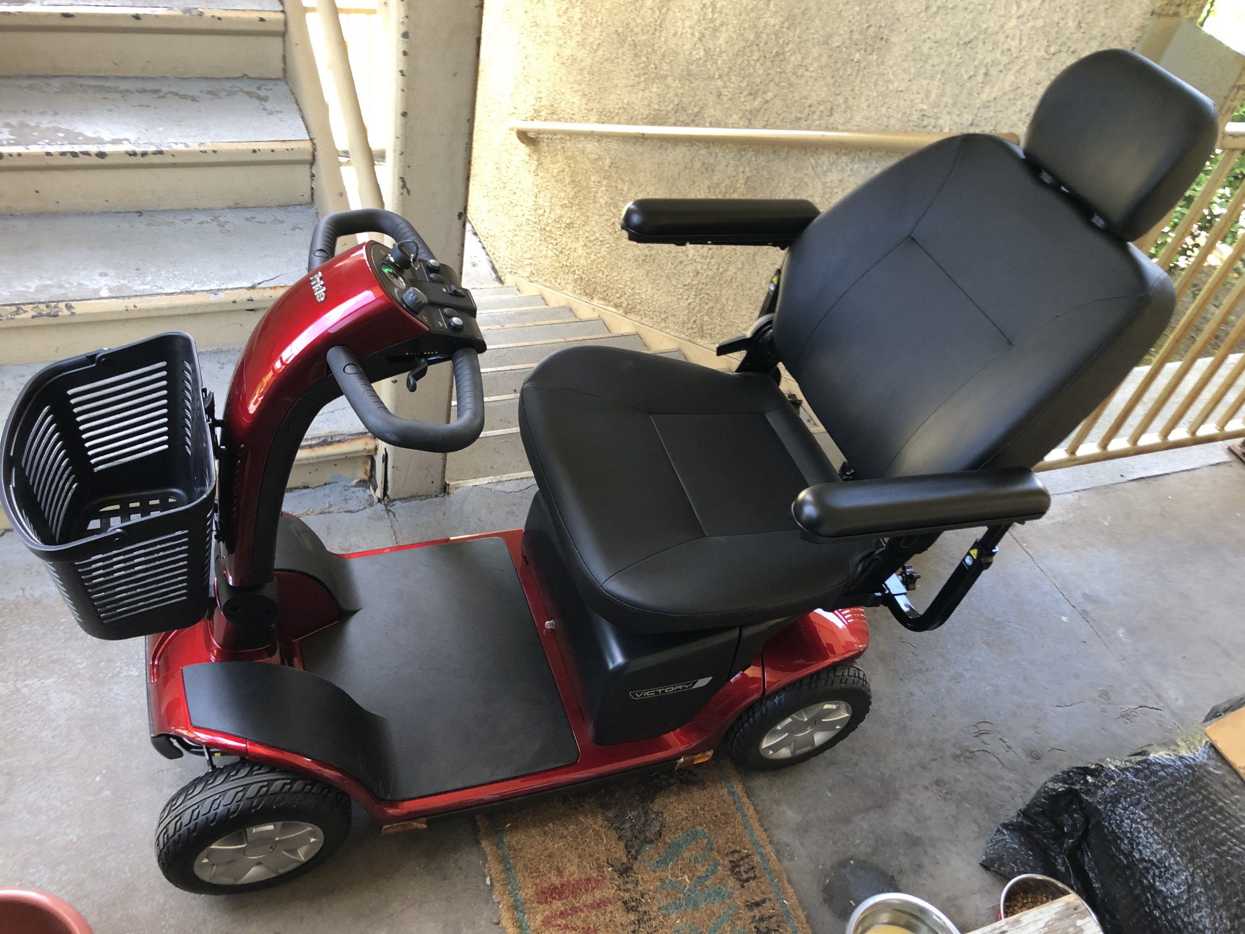 IT NEEDS A NEW ARMREST THAT HAS COSMETIC DAMAGE AS A PIECE OF PLASTIC CAME OFF WHEN I WAS FIRST USING IT AND HIT THE BALCONY RAILING BUT NOW AM VERY PROFICIENT IN GETTING IT ON AND OFF MY BALCONY. I WILL SEND THE BUYER A NEW ARMREST AT MY EXPENSE WHEN SOLD. OTHERWISE THIS SCOOTER IS IN PERFECT CONDITION. I ONLY RODE IT AROUND DOWNTOWN HERE IN MARTINEZ, TO FEED THE CATS I FEED EVERY DAY & TO GO ONE MILE TO SAFEWAY & BACK TO GET FOOD. MY CATS & THE OTHER FOUR I FEED ARE SHOWN IN A VIDEO BELOW. MY CATS DO NOT SIT ON THE SCOOTER & IGNORE IT. IT IS TAKING UP MY LIVING ROOM & I AM DISABLED & NEED TO SELL IT TO BUY A SMALLER ONE AS I HAVE TWO BAD KNEES.