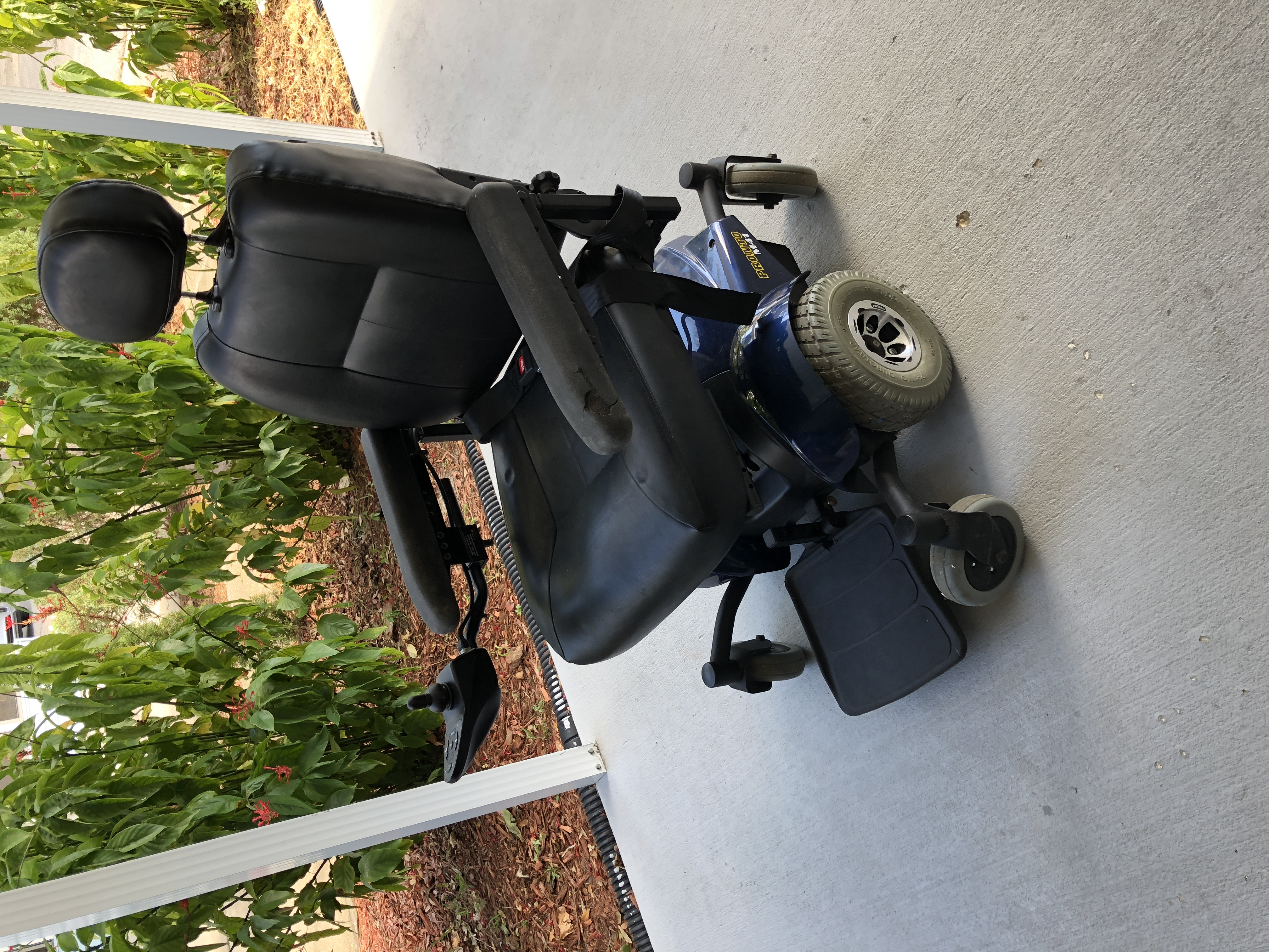 This is a beautiful blue and black seated Electric wheelchair, that was barley used by my mom. She also only used it inside of our home on wood floors. It works very well and is a very smooth ride. It has an elongated back and it’s very comfortable and supportive to the wheelchair user. It’s very roomy and comfortable.