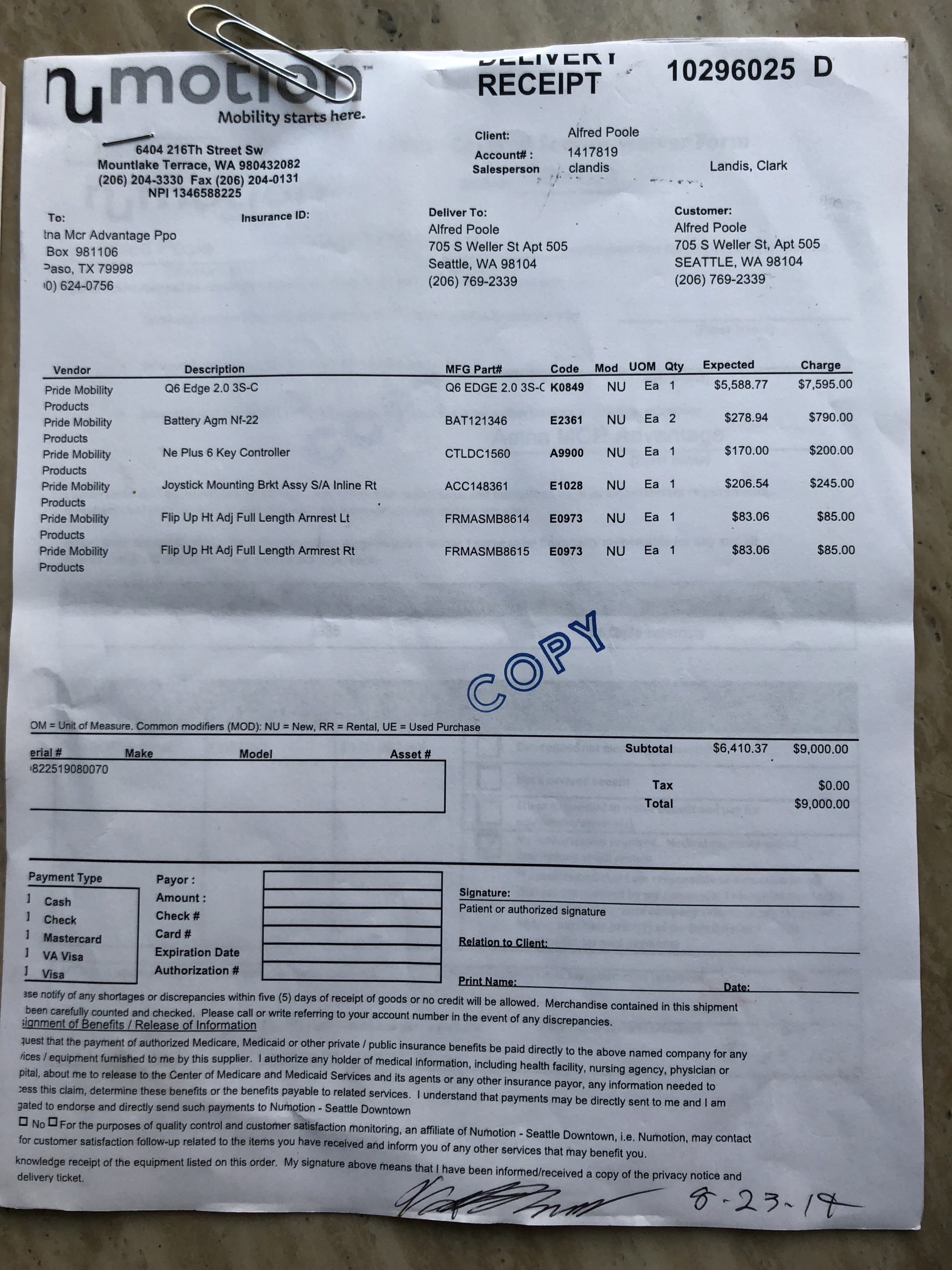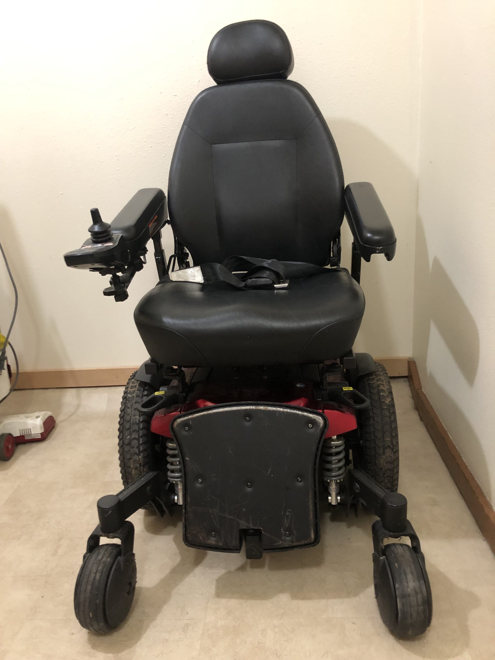 This wheel chair is in good condition. We purchased it for my father in 2019 and he used it until he passed away in 2021. We were orignally holding on to it for my mother but decided that her need is still far off. There are a few scratches but otherwise its in tip top shape. Tires and battery in good condition. Very easy to used. My father was 190 pounts and he zoomed around the city. I have manual and original invoice still with me. We purchesed the wheelchair for $9000. I am located in Seattle, please contact me by phone or email if you want to come and try it out. If you wish for me to take a video and send it to you, I could do that as well. Please let me know if you have any doubts or questions, I would be happy to answer all.