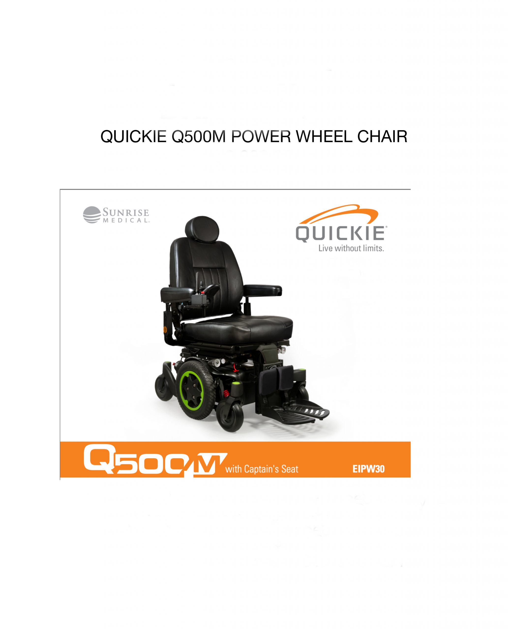 Quickie Q500M Power Wheel chair was purchased in 2019 and used for one day. It has been in storage for the last year and a half because of the pandemic. Chair comes with a Captains Seat and does not appear to have the ability to recline. Comes with Charger that came with the chair. Weight is approximately 300lbs. Right Handed standard Joystick controls. Adjustable Foot plate with back leg pads. Trim color is Black.