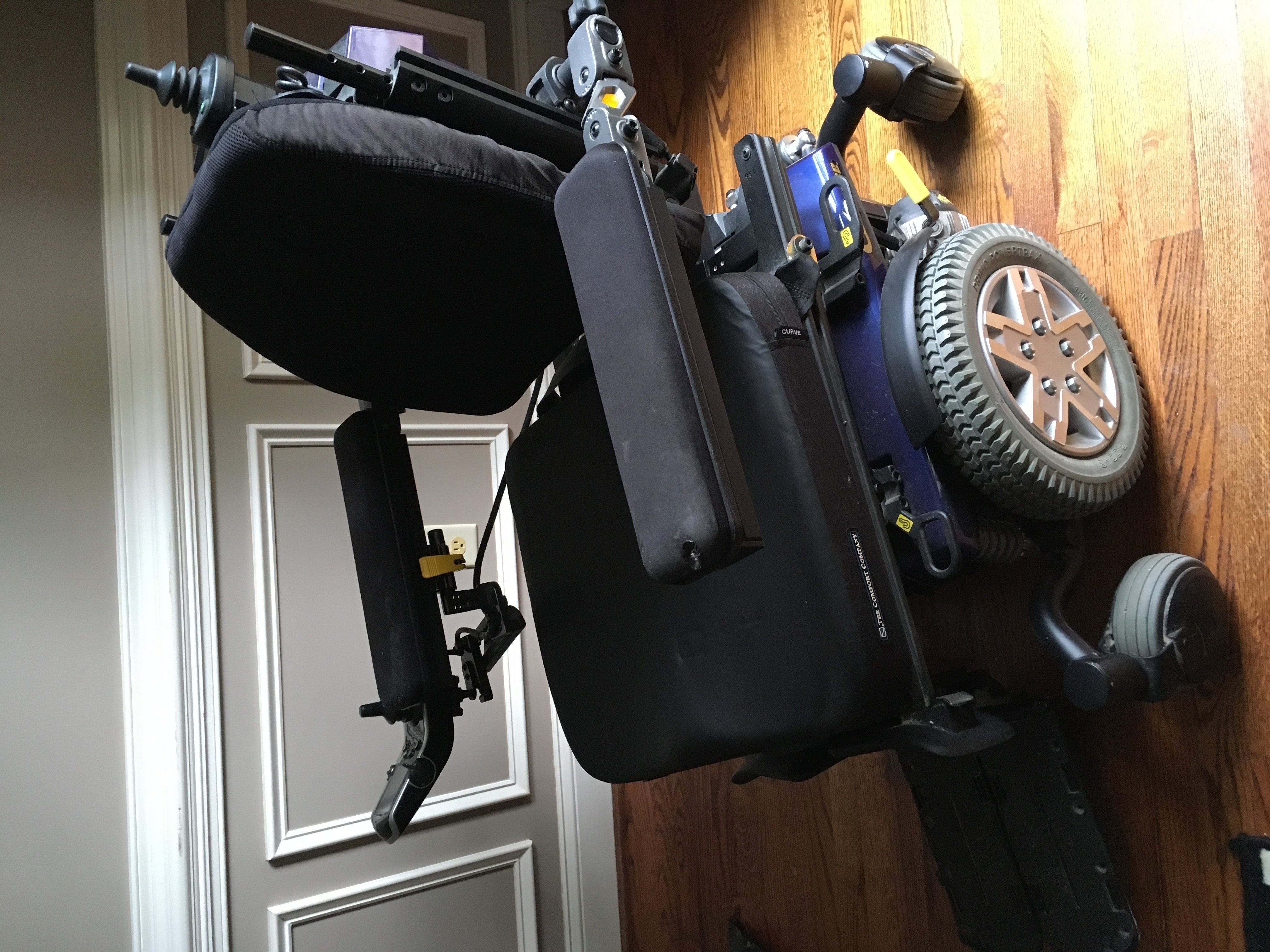 This chair was originally purchased late in 2013. It was used for less than a year by our daughter. We have taken it to New York City, and it went to college with her for a few weeks. It has a joystick on the right side for maneuvering, but it can be moved to the left side for a left-handed person. There is another joystick on the back of the chair to allow another person to guide the chair. It has Tru Comfort TB3 Rehab seating and retractable joystick mounting. There are center mount leg rests and a Permobil ergo cushion. Also included are a Tru comfort backrest, and Falcon gel full length arm rests. The chair comes with a battery charger and power lift for a vehicle. We will gladly Skype or post a you tube video to prove that it works for anyone interested. The color is actually purple, but it looks blue in some light and purple in others. We also have the original purchase paperwork.
