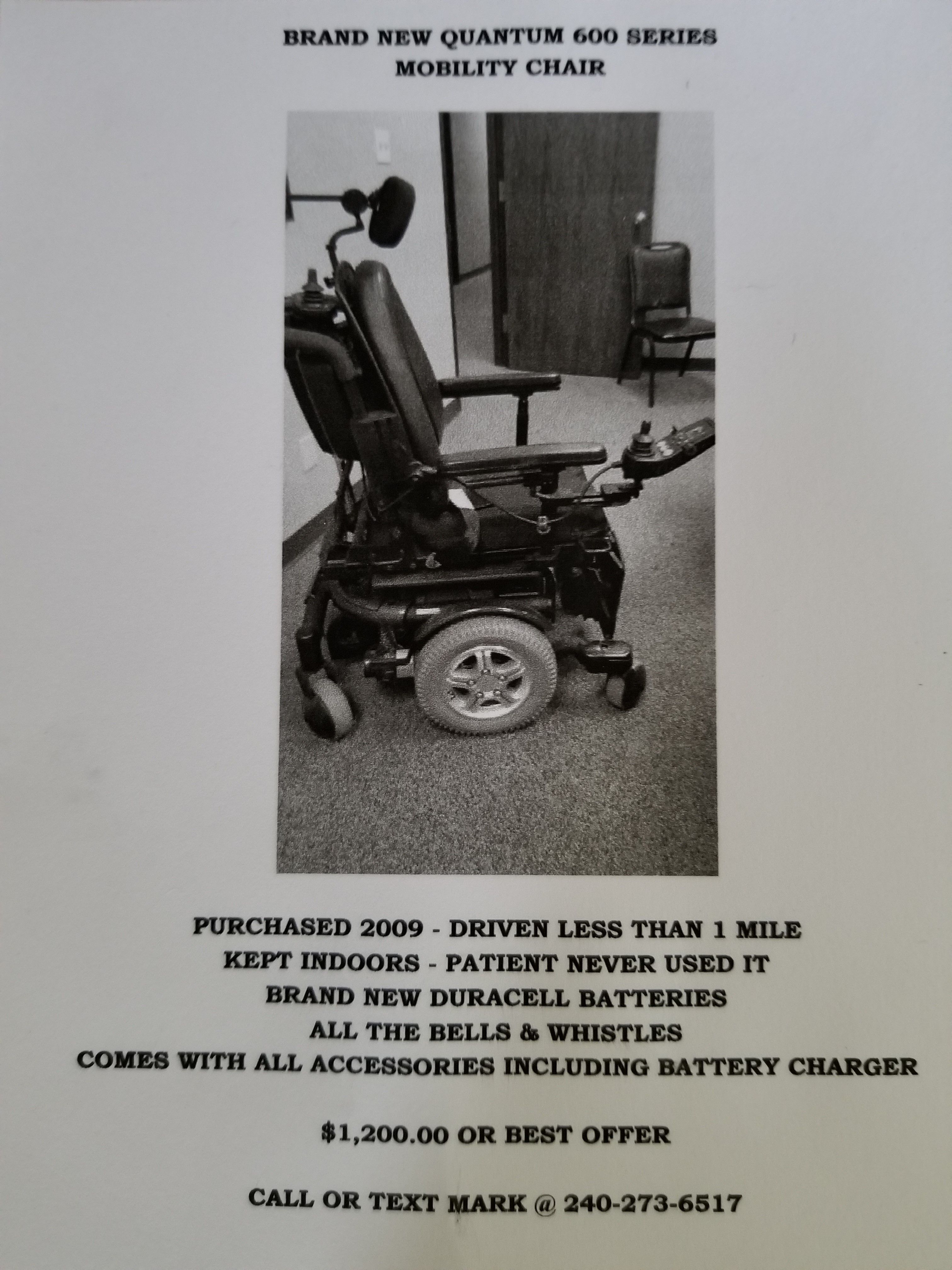 THIS CHAIR WAS PURCHASED IN 2009 WHEN THE PATIENT WAS DIAGNOSED WITH MYASTHENA GRAVIS AND COULD NOT WALK, HOLD HIS HEAD UP OR HIS UPPER BODY. HE ENDED UP NEVER HAVING TO USE IT DUE TO HIS PRIDE, STUBBORNESS, PERSISTENCY, AND DETERMINATION TO NOT BE WHEEL-CHAIR BOUND, ALONG WITH NEW MEDICATIONS AND GREAT SPECIALISTS.