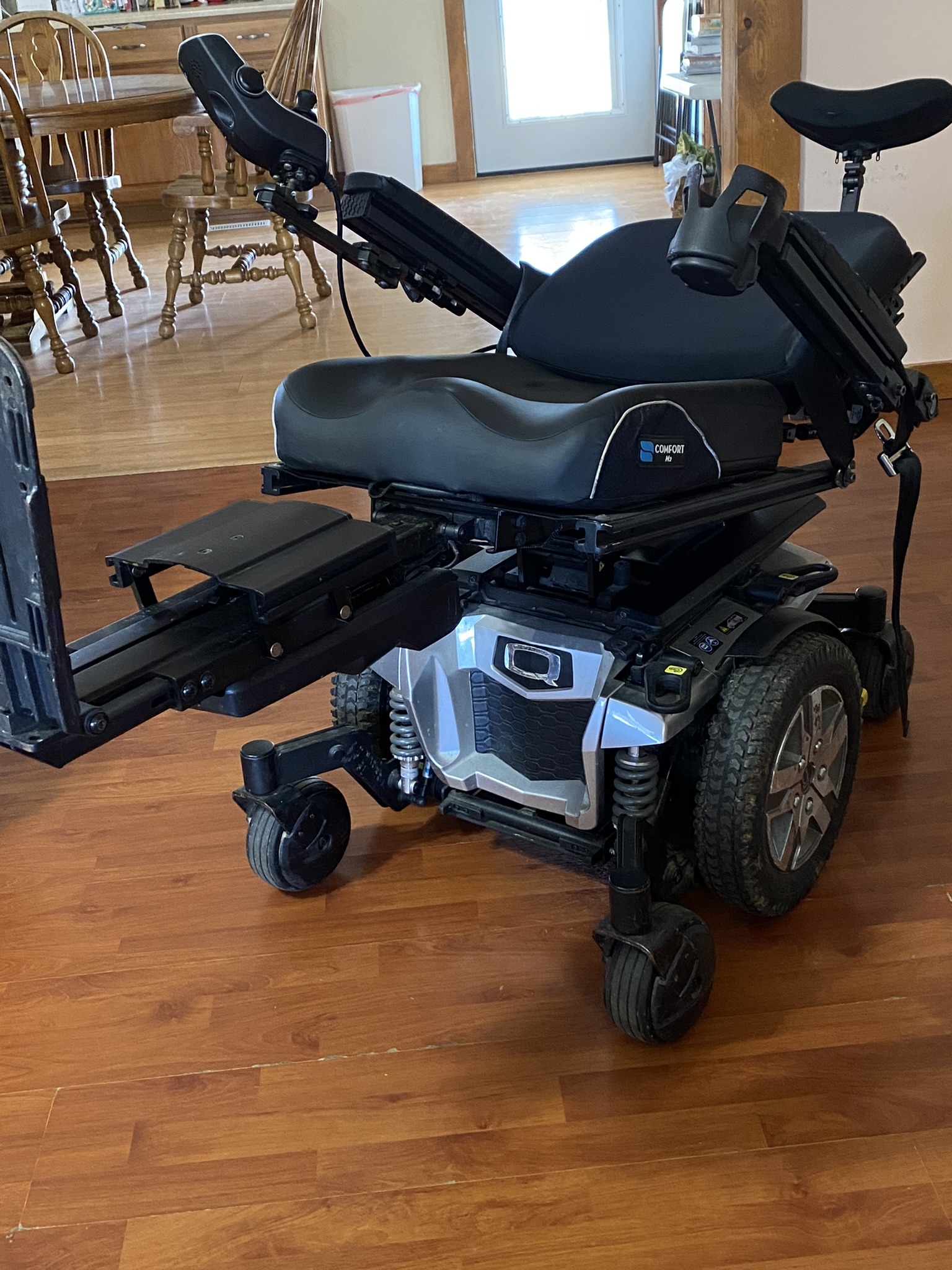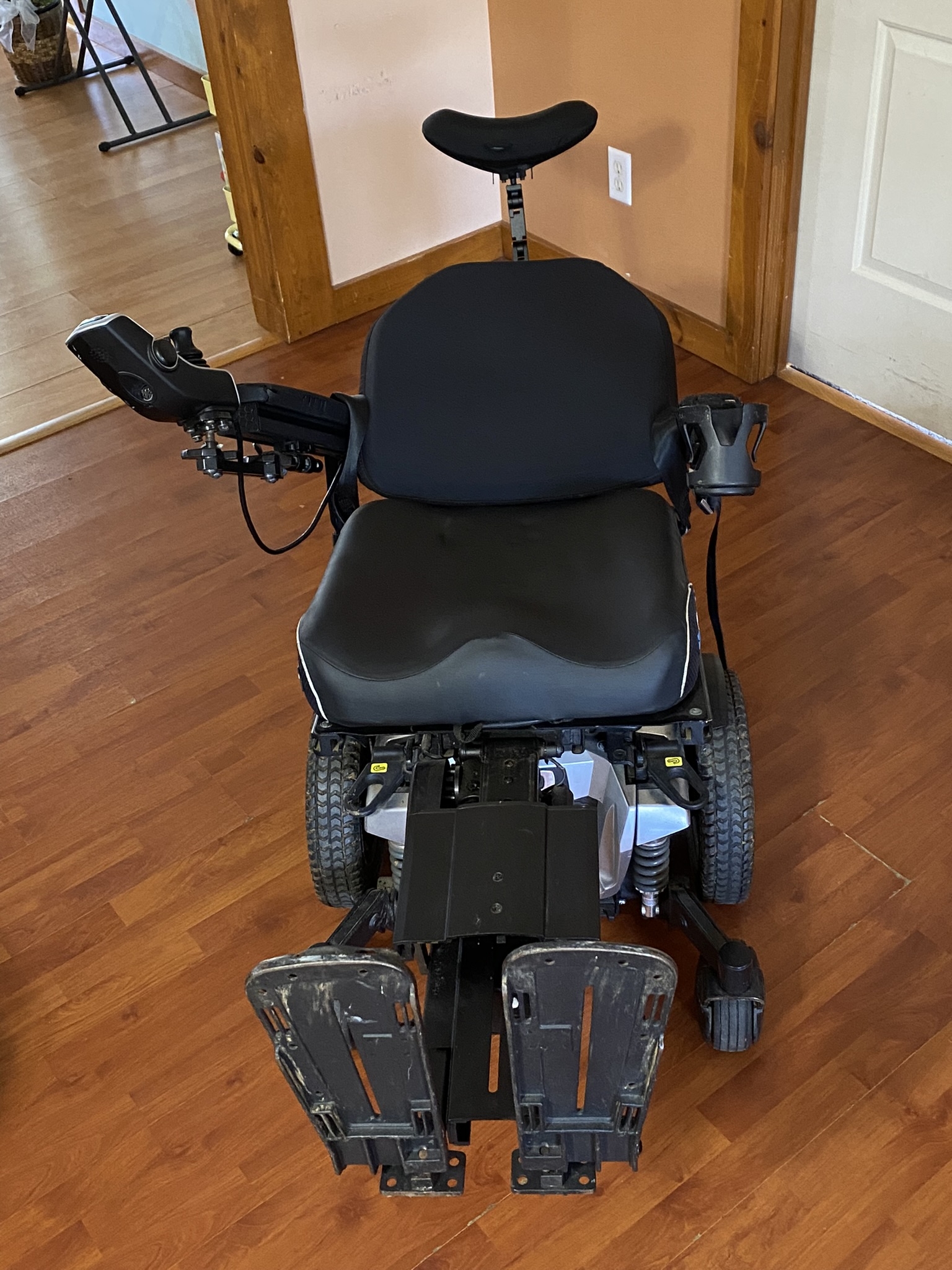 This wheelchair is in very good used condition; the battery holds for several days at a time; the chair has several different indoor/outdoor speeds; it also has headlights, a horn (which is nice when backing up), a headrest; and a cup holder, which is extremely valuable to a paraplegic as the cup holder frees up the arms for another use.