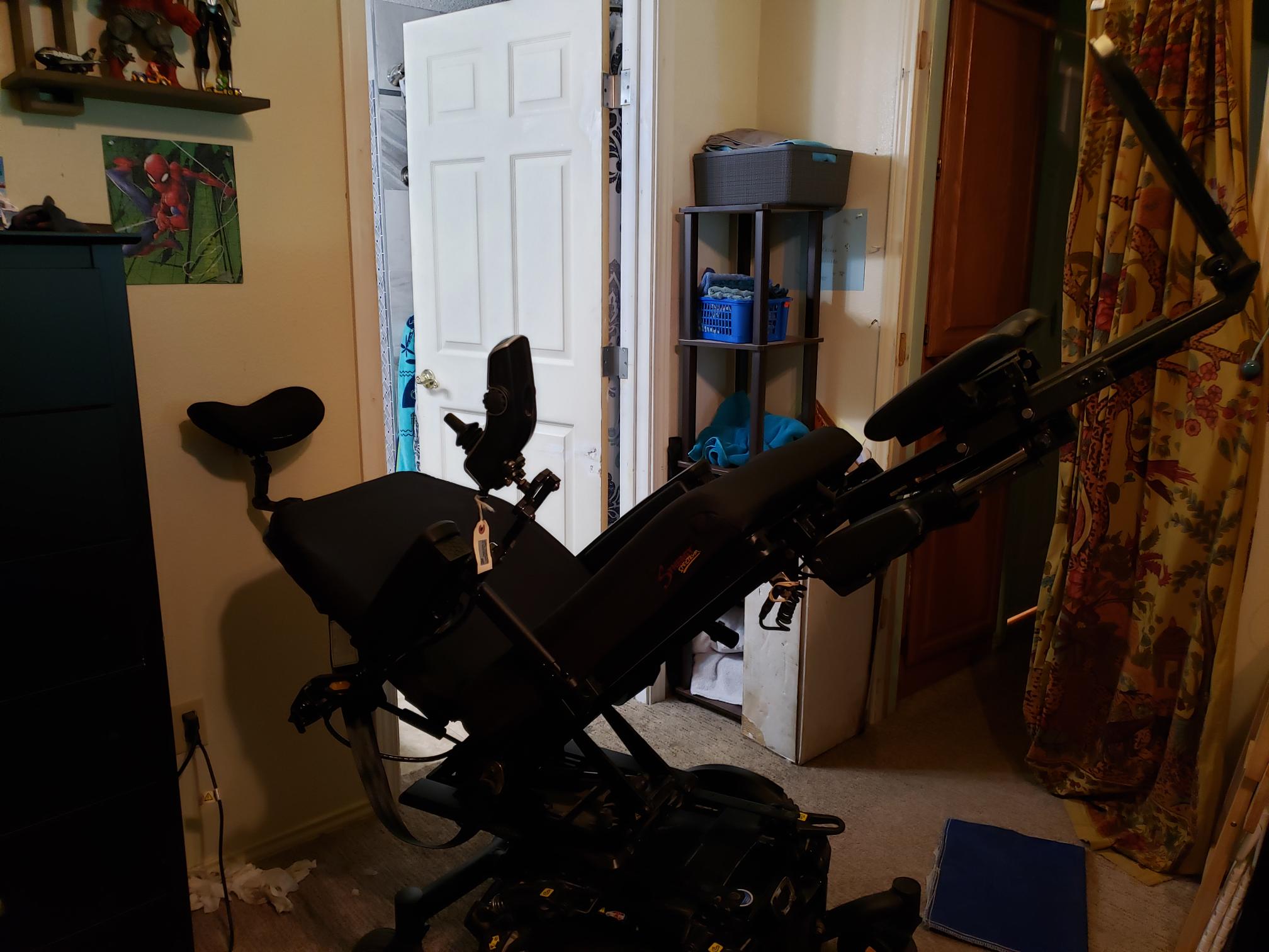 Quantum Edge HD Full tilt, power chair that reclines backwards appx. 30 to 40 degrees. This chair was specially built for my 6 ft 4 inch, 330 lb husband, by National Mobility and Seating. The chair is heavy duty, holds up to 450 lb adult. The seat is 21 1/2 inches wide on the inside, entire chair width is 27 inches wide, total. It has always been used indoors and not very often, over the years. We have had this chair appx 5 years. However, the battery is appx. 6 months old, it was recently replaced with a very expensive, new one. We have kept the chair in good condition. It has a little wear and tear, but less then expected for its age. It still has all of its accessories, it comes with seat belt, head rest & knee pads. The foot rest is in good condition. It has no broken parts, only a small tear in the back corner of the arm rest. No other visible issues, other then a little dust. This chair is located in Mansfield Texas and will require local pick up, please call if interested in looking at it, serious buyers only please. Send me an email if you want more pics or to set up an appointment. My husband was a disabled veteran and has now passed on. Thank you.