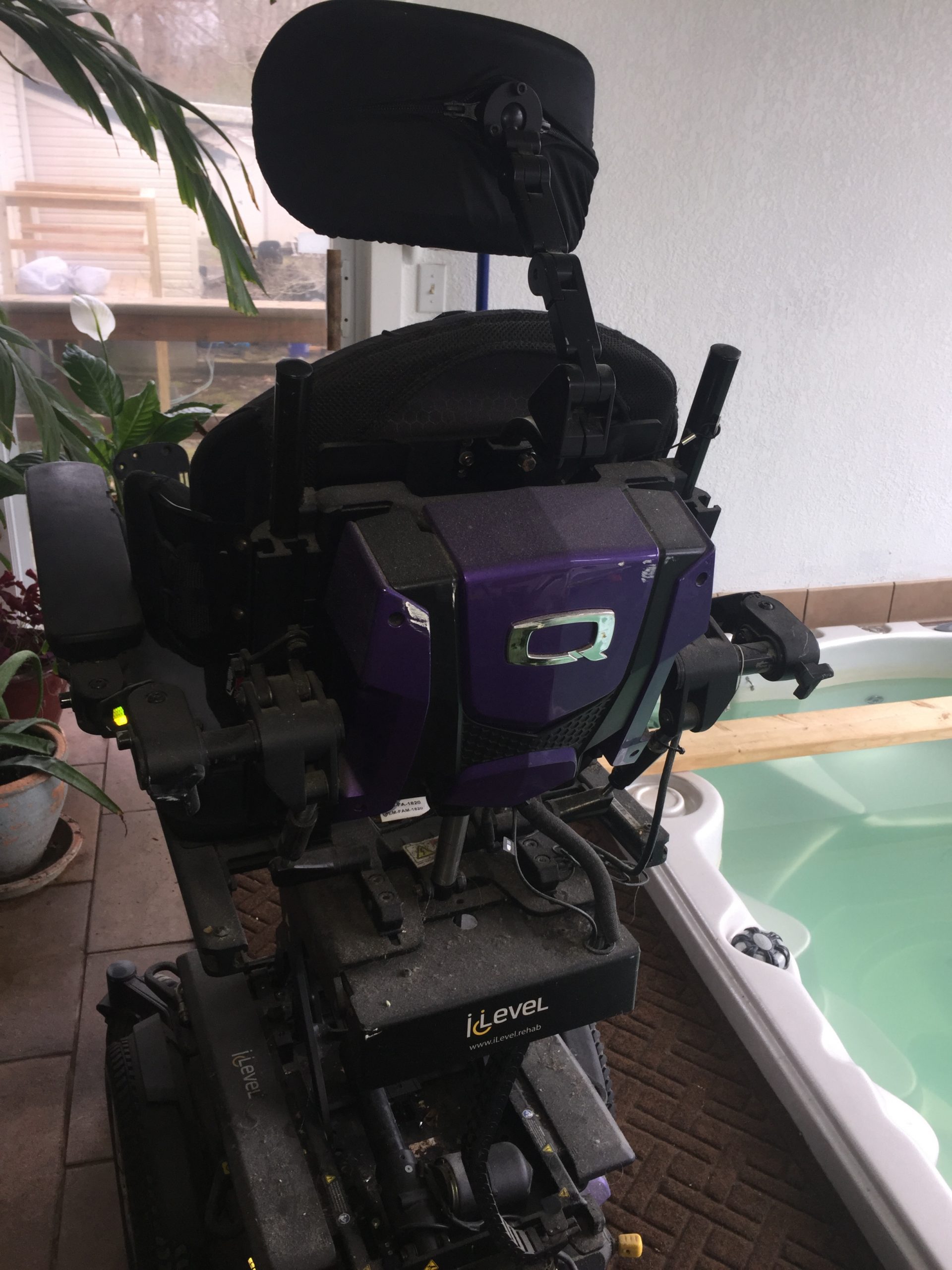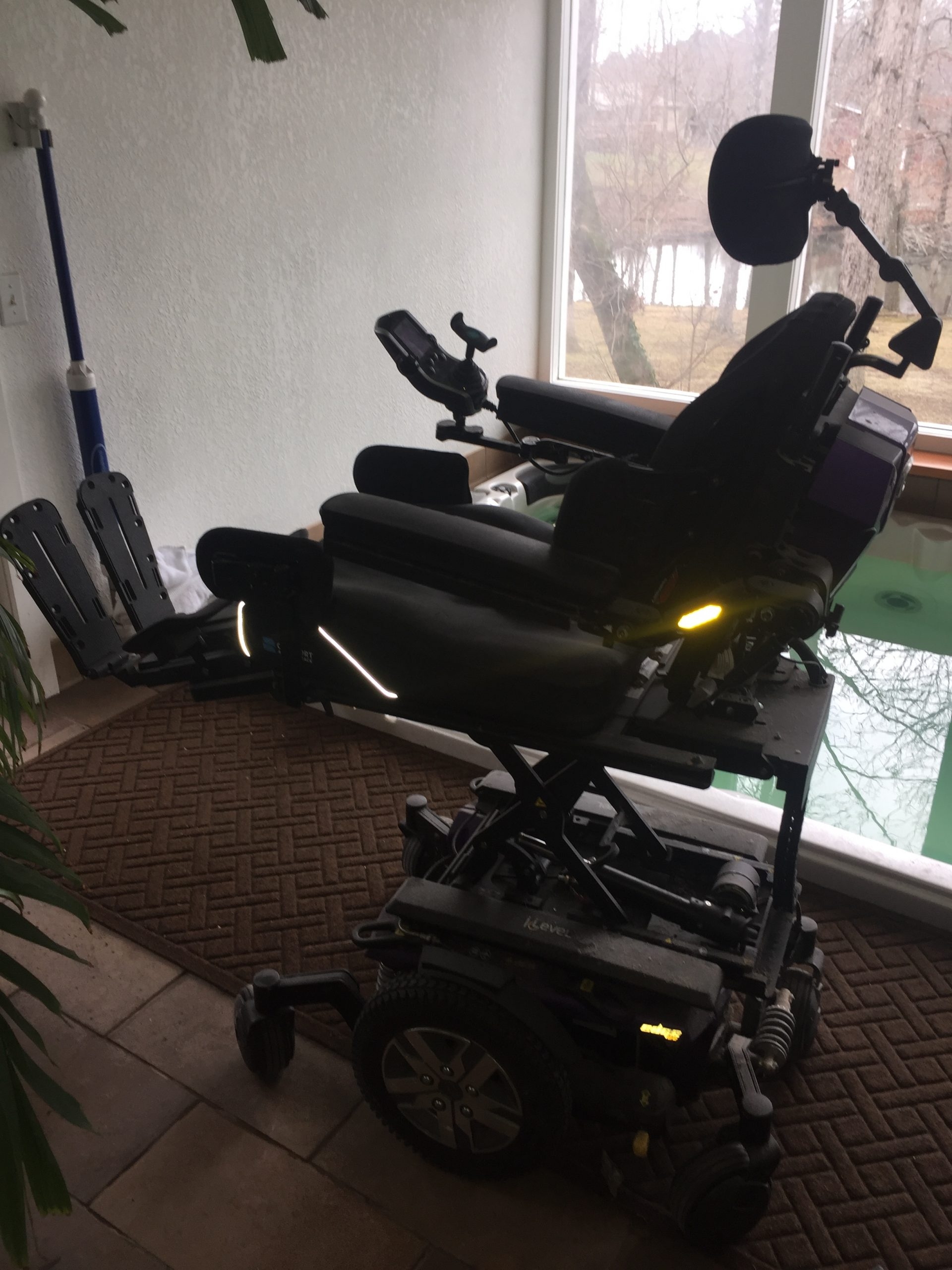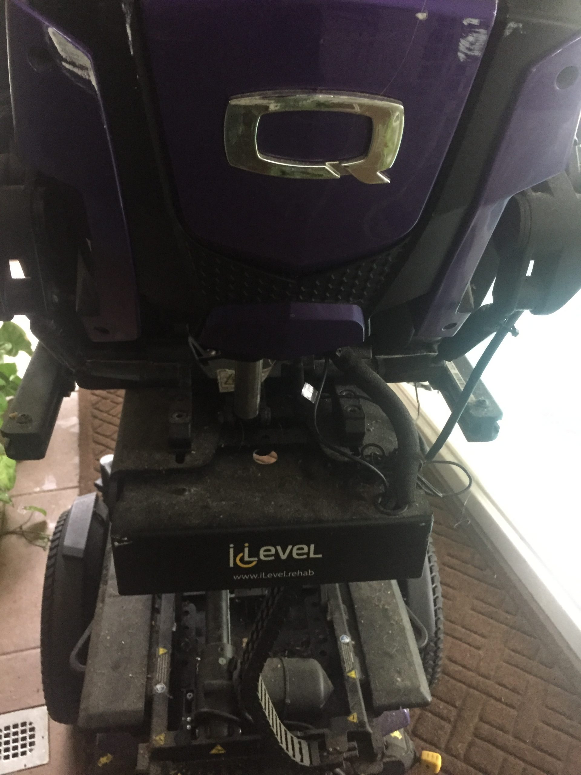 This i level edge 2.0 has multiple spare parts to go with it including seats and backs, foot rests, side supports, leg supports and head rests. Professionally maintained. It has seat lift, leg lift, recline function and even lights. The wheel chair has remained inside the home at all times. The rechargeable battery functions properly and the 24 volt battery charger goes with it and works as it should. Every function works perfectly. The chair can be fully elevated and operate at full walking speed (4.5 mph). The speeds of operation range from indoor slow indoor moderate outdoor moderate and outdoor fast. Range of motion leg lift seat lift and back recline with combinations of each. The chair can operate using 5 different languages. This unit can log distances in miles and kilometers and logs with a trip meter. It is a fun purple color with cool wheels and black tires that do not scuff flooring. The chair is located in Crossville TN.