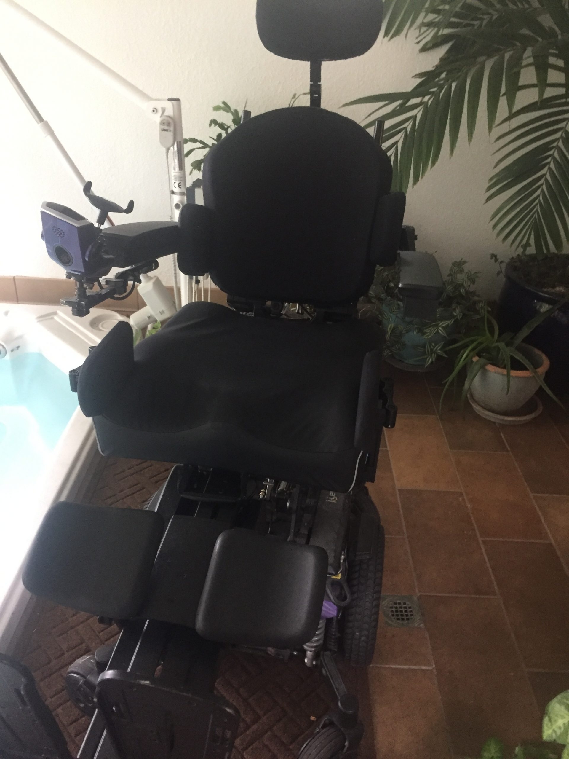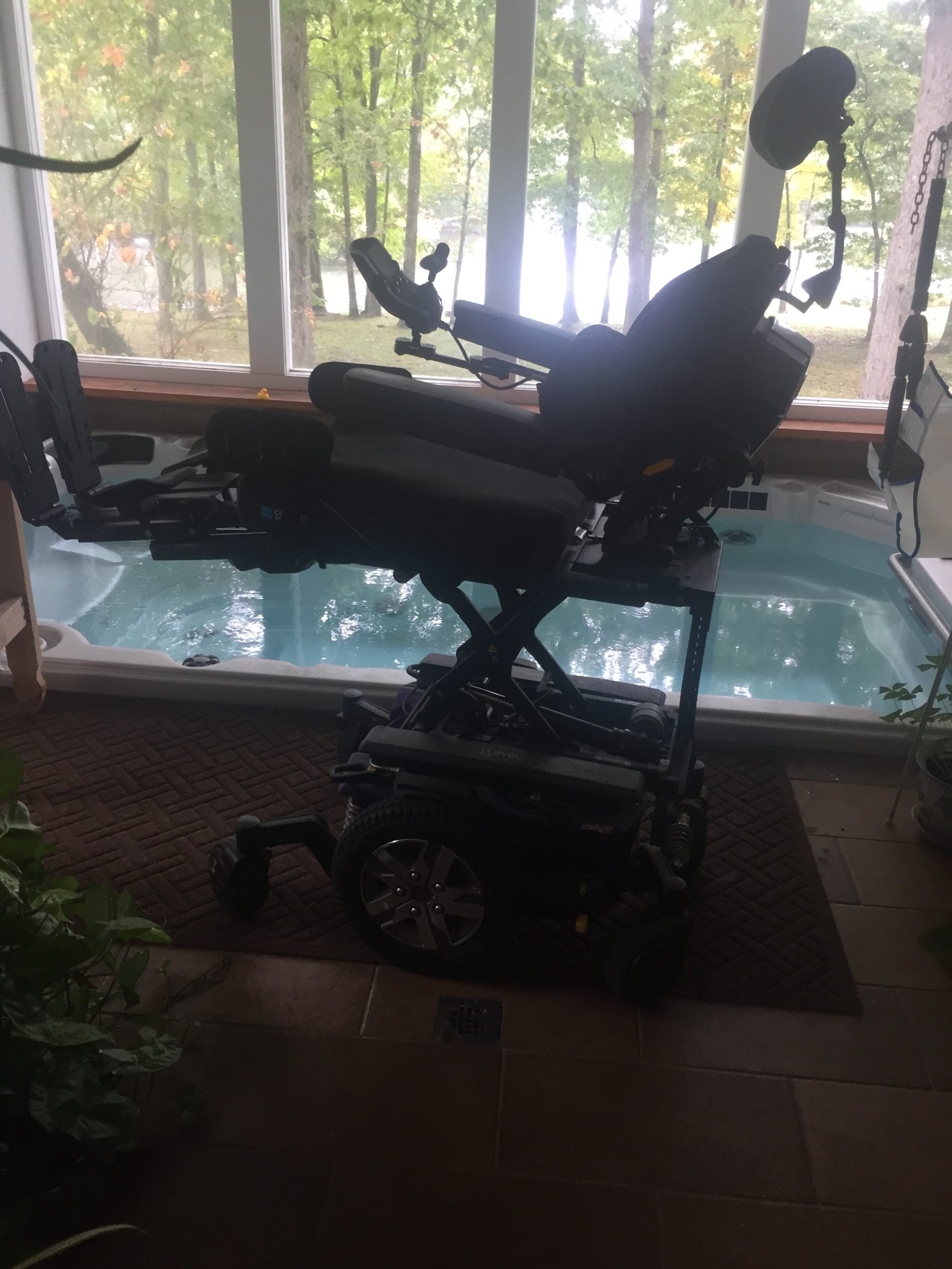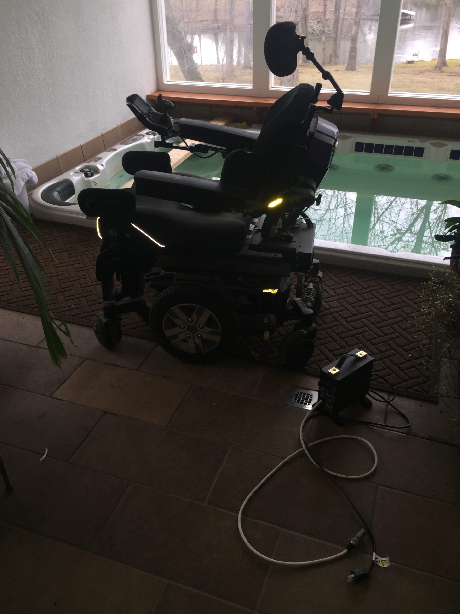 This i level edge 2.0 has multiple spare parts to go with it including seats and backs, foot rests, side supports, leg supports and head rests. Professionally maintained. It has seat lift, leg lift, recline function and even lights. The wheel chair has remained inside the home at all times. The rechargeable battery functions properly and the 24 volt battery charger goes with it and works as it should. Every function works perfectly. The chair can be fully elevated and operate at full walking speed (4.5 mph). The speeds of operation range from indoor slow indoor moderate outdoor moderate and outdoor fast. Range of motion leg lift seat lift and back recline with combinations of each. The chair can operate using 5 different languages. This unit can log distances in miles and kilometers and logs with a trip meter. It is a fun purple color with cool wheels and black tires that do not scuff flooring. The chair is located in Crossville TN.