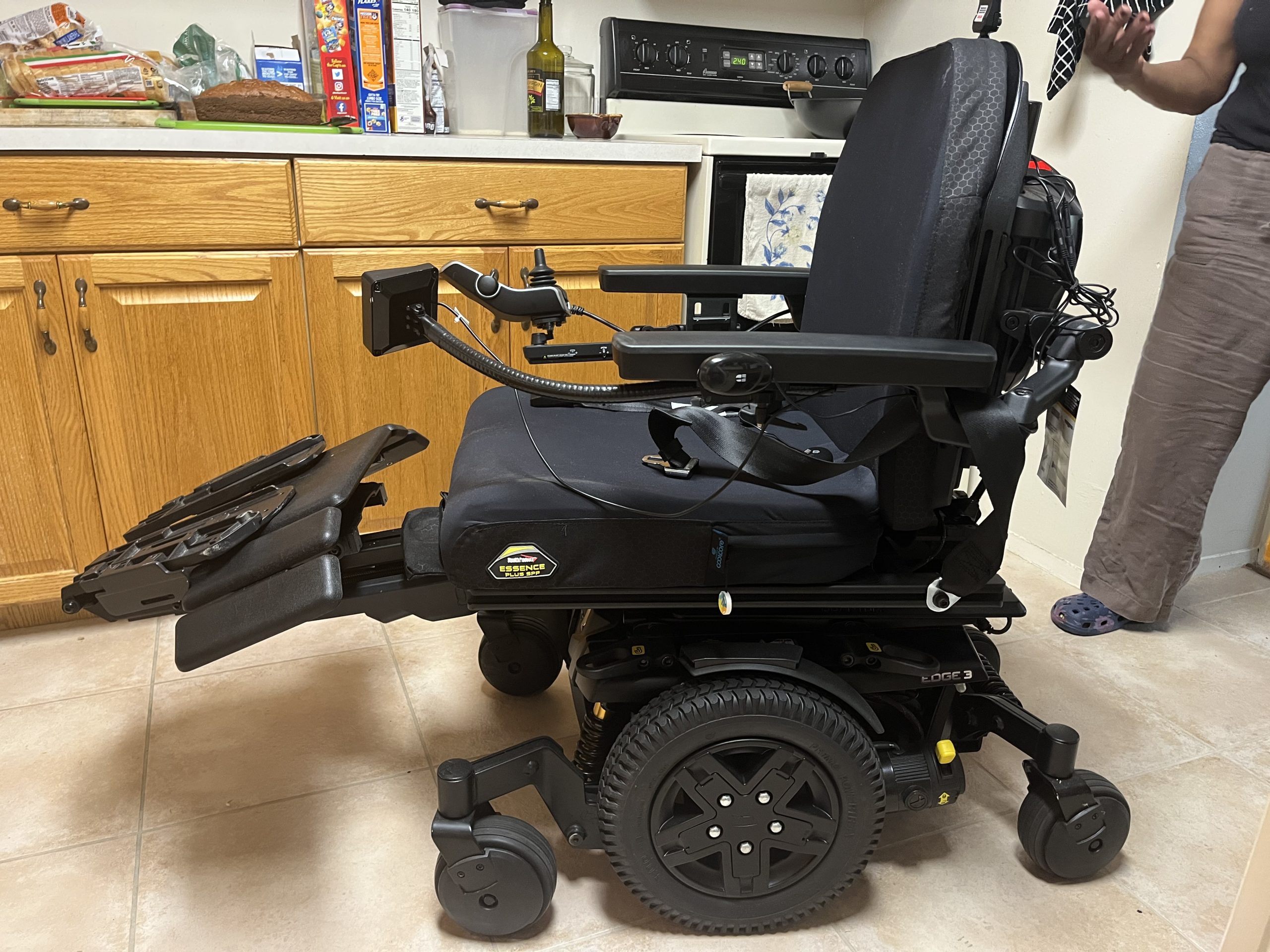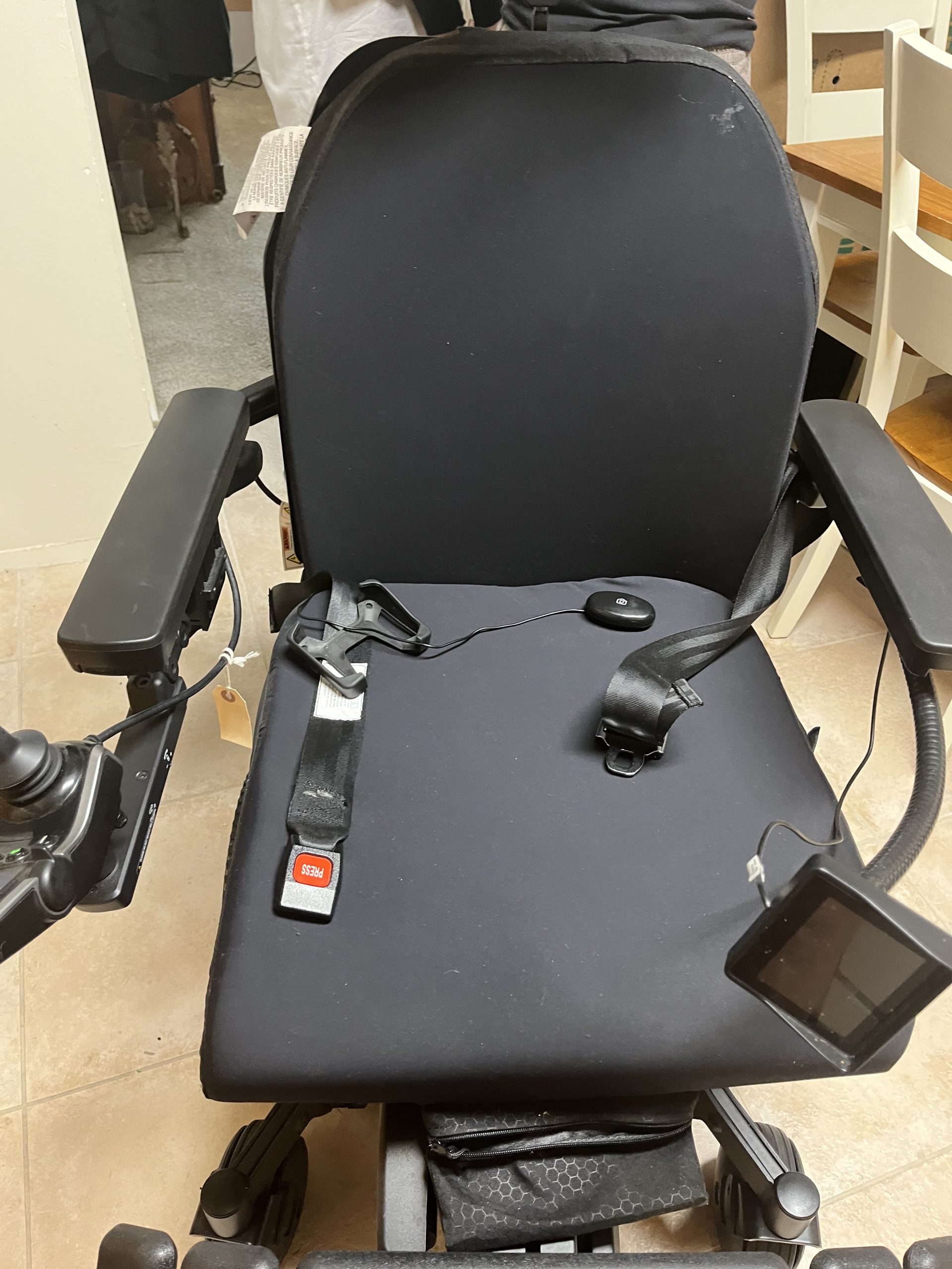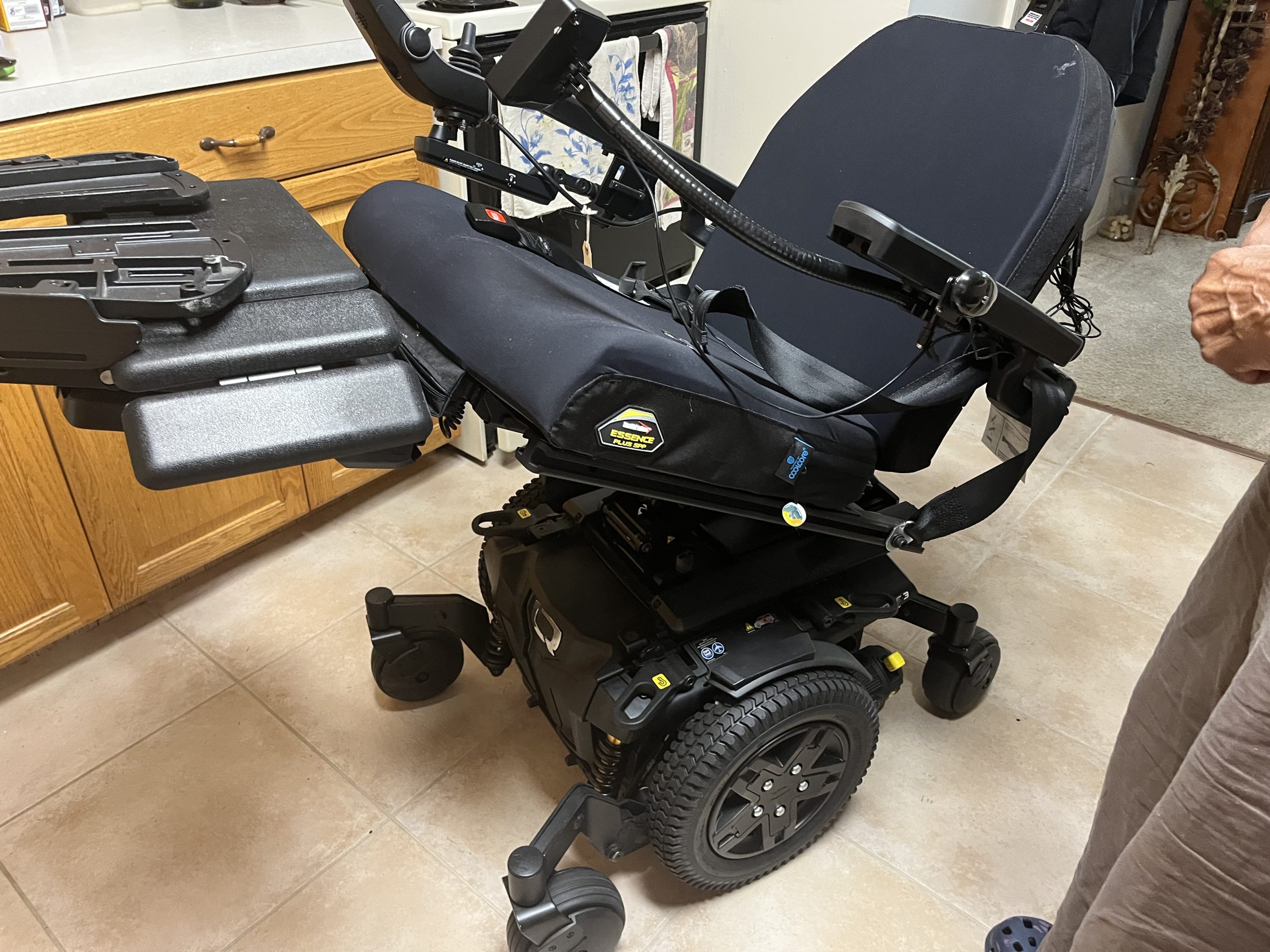 My cousin/God father is in the Stony Brook vet center and no longer needs this so it barely had been used. It is taking up space in his wife’s small apartment. He barely used it before he was admitted. It combines state of the art components with safety, comfort and style. The chair comes with LED fender lights, tilt and recline seat, joystick controller , armrest width is adjustable, armrest angle adjustment, armrest height adjustment, foot angle adjustment, power seat adjustment, seatbelt, back up camera, Bluetooth, indoor control, foot platform adjustment, battery charger, a single charge goes up to 19 miles, swing away footrests, horn, TRU-comfort cushions, TRU-balance 3 power positioning, it has intelligent breaking, swing away calf pads, six wheels and patented extra stability technology. It comes with Owners manual. The weight limit is up to 450 lbs. it’s a great chair and it is priced to sell. Thank you.
