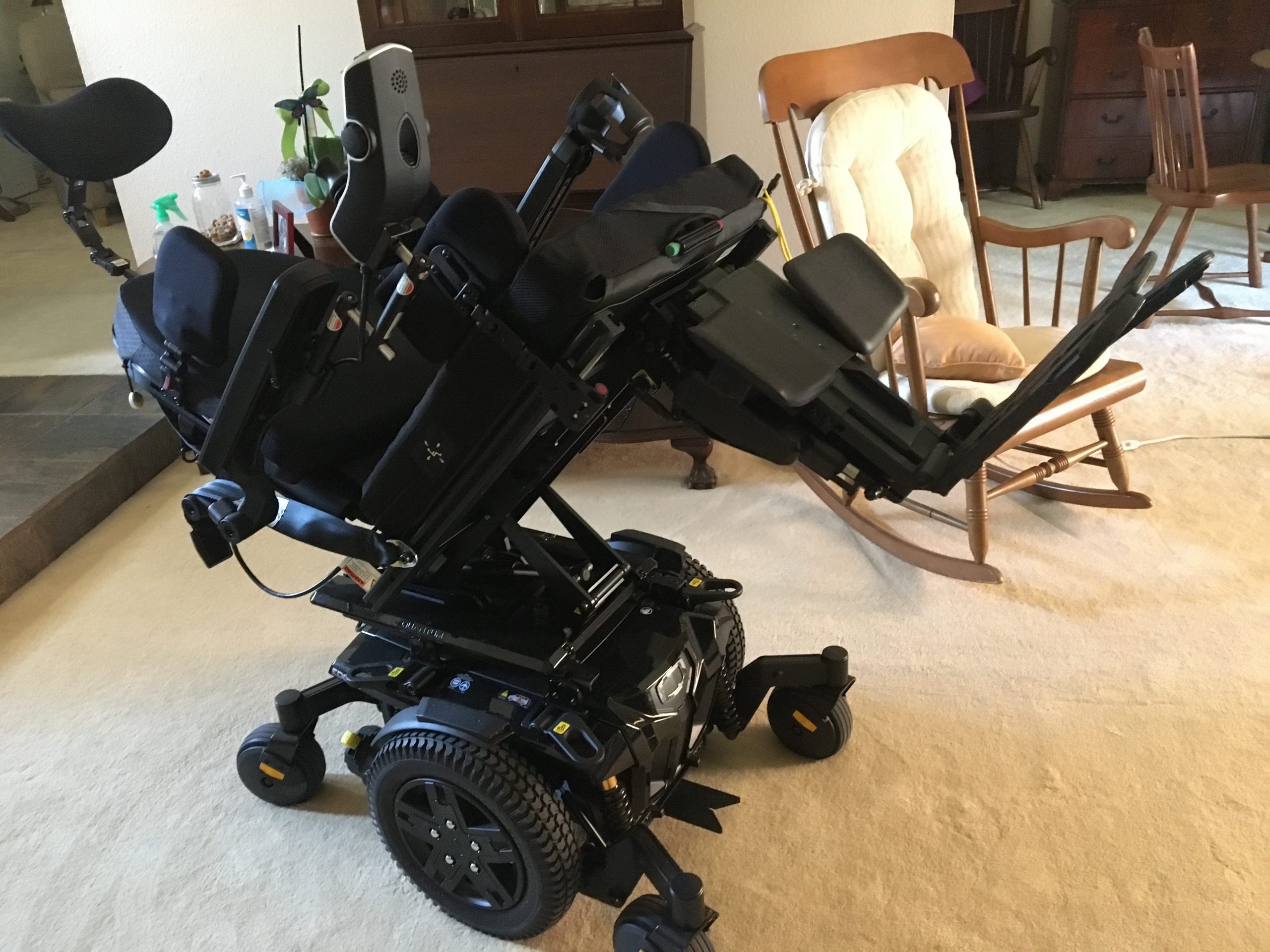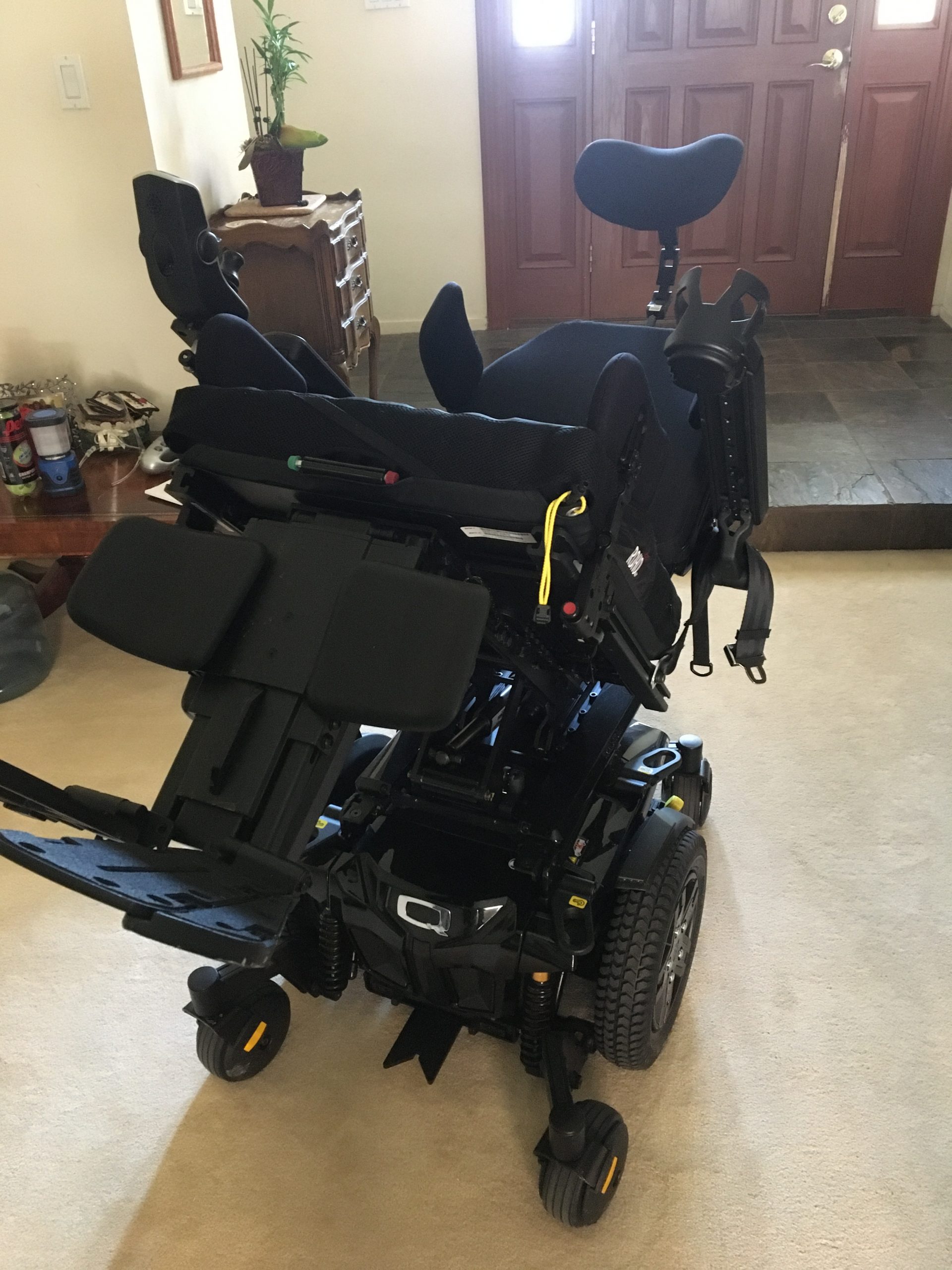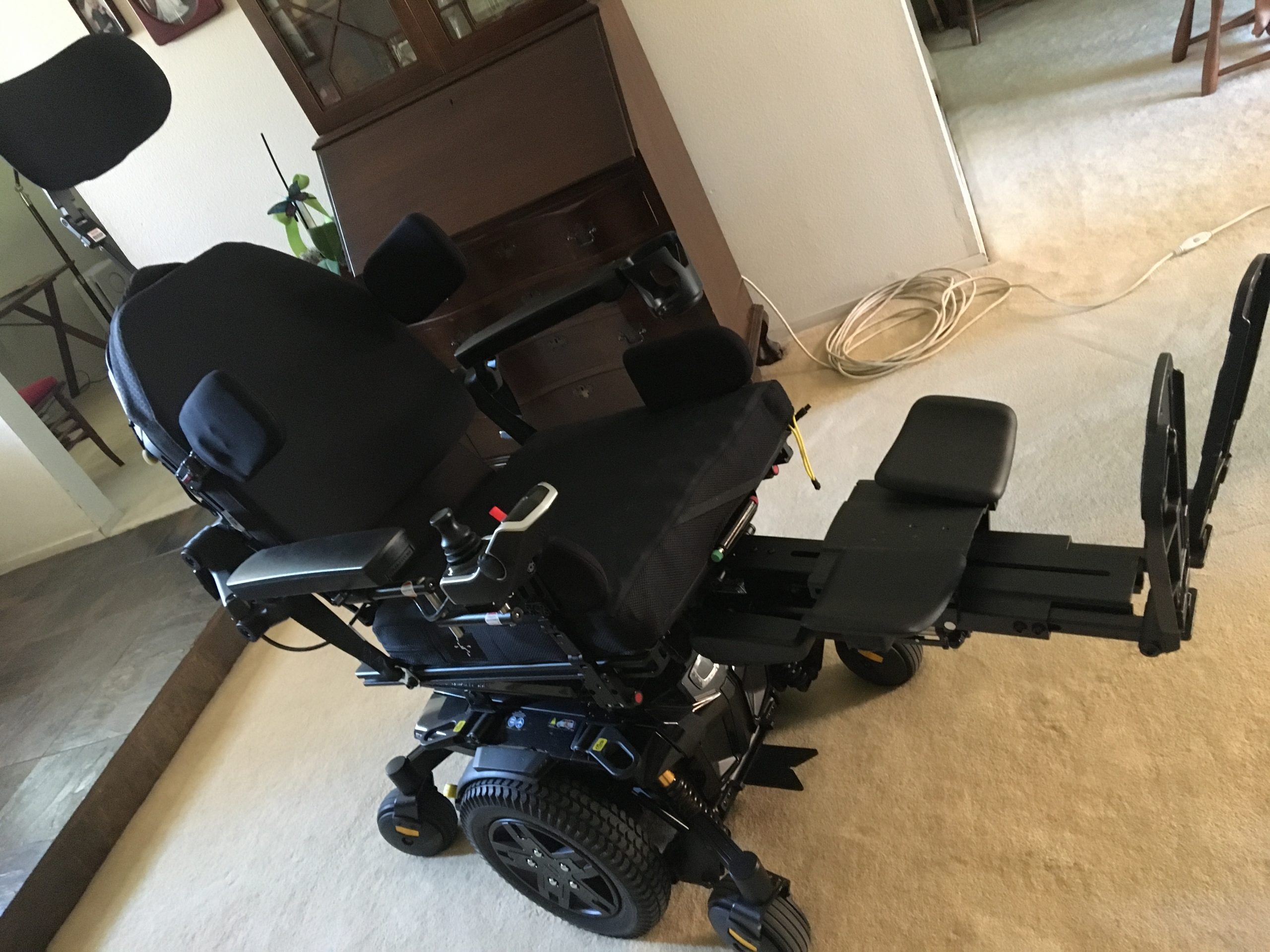 Quantum Q6 Edge 3.0 for sale. It was purchased new in October 2020 and remains in excellent condition. The wheelchair color is Black. It has NF 22 50 Amp batteries, Q logic 3 EX joystick, Electronic Assy Q logic, Q-Logic 3 expandable controller harness, Tru Balance 3 power tilt and recline, Tru comfort back 14-20" width, electronic Assy Curtis power recline, Stealth 10" comfort plus headrest, width extension 11" footplates, power articulating foot platform, pelvic/ thigh guides. There are Waist and chest straps. The power cord keeps the battery charged. Roho seat cushion and pump are included. The Quantum power chair is designed to provide superior rider control, balance, maneuverability and comfort. The owner's manual is included. It has an EZ Lock docking pin attached on the bottom of the wheelchair, to use in vehicles equipped with the EZ Lock docking system. There is capability for service connection with Interactive Assist by Quantum.