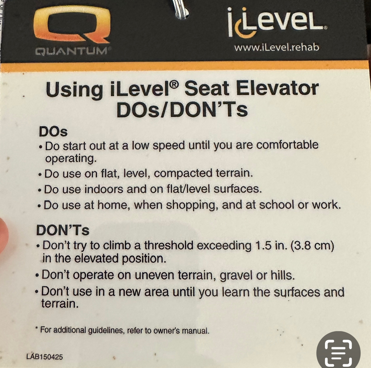 iLevel improves daily functionality and quality of life by allowing operation of the power chair with the seat fully elevated while at walking speed (at 4.5 mph).