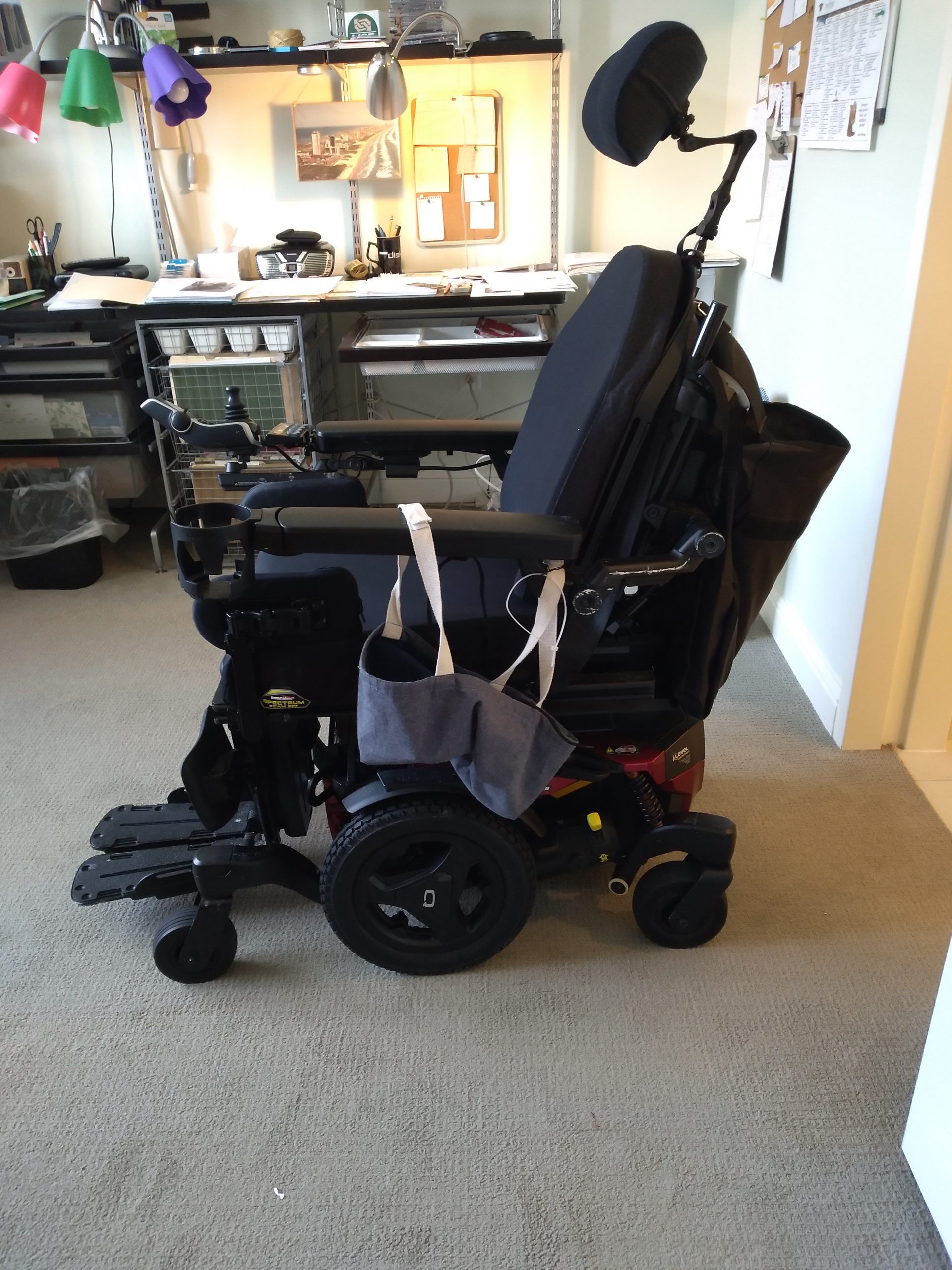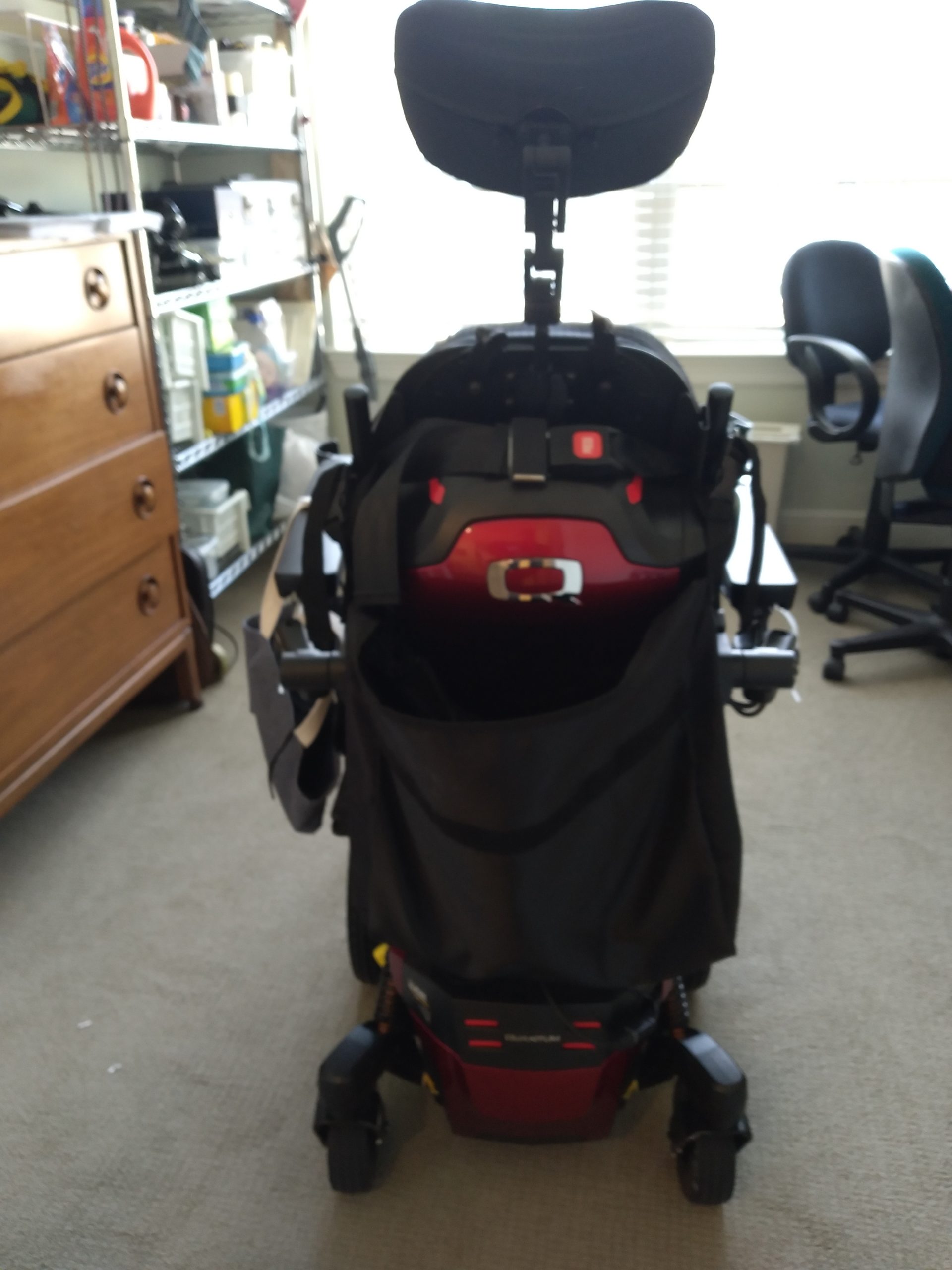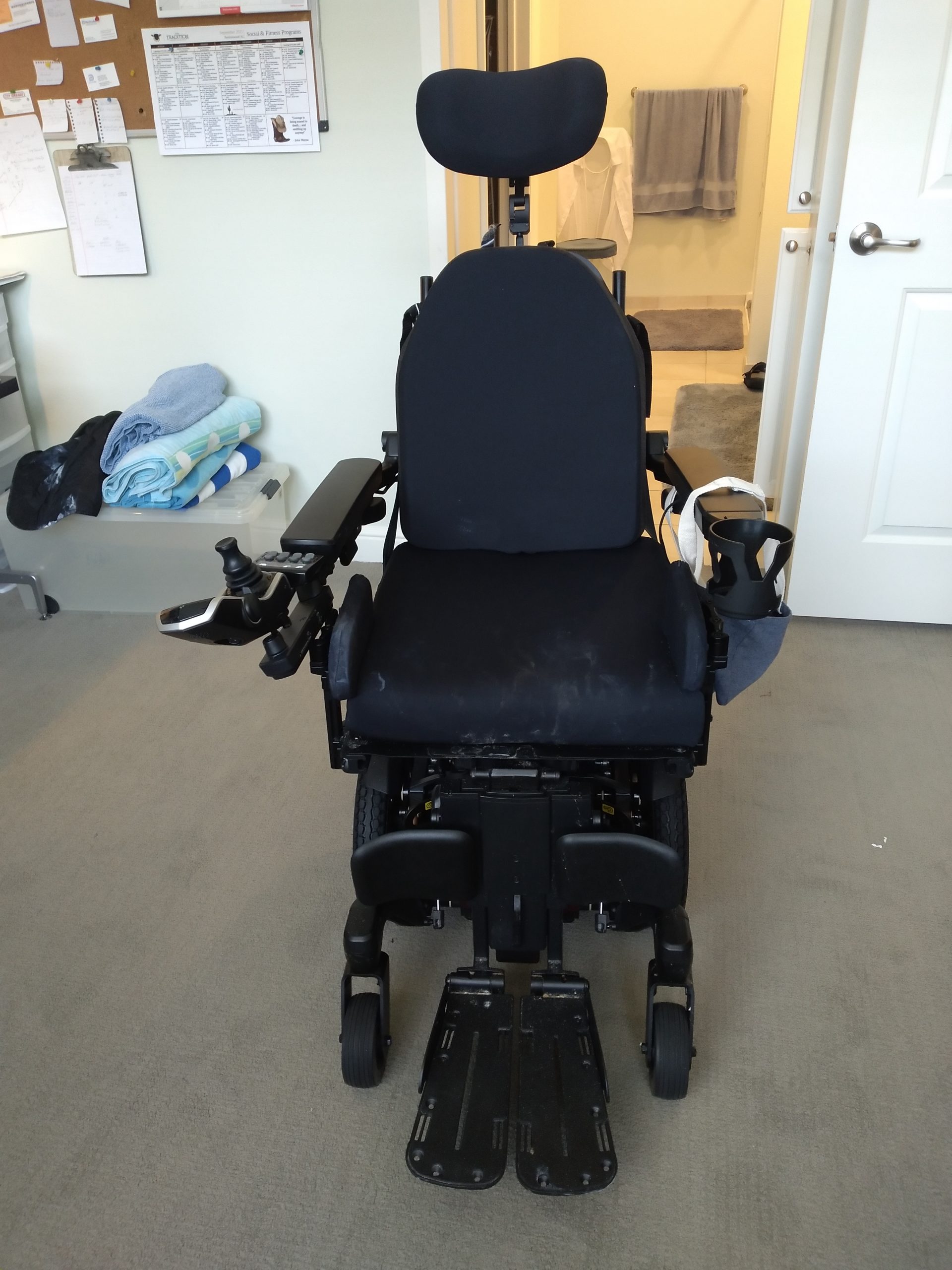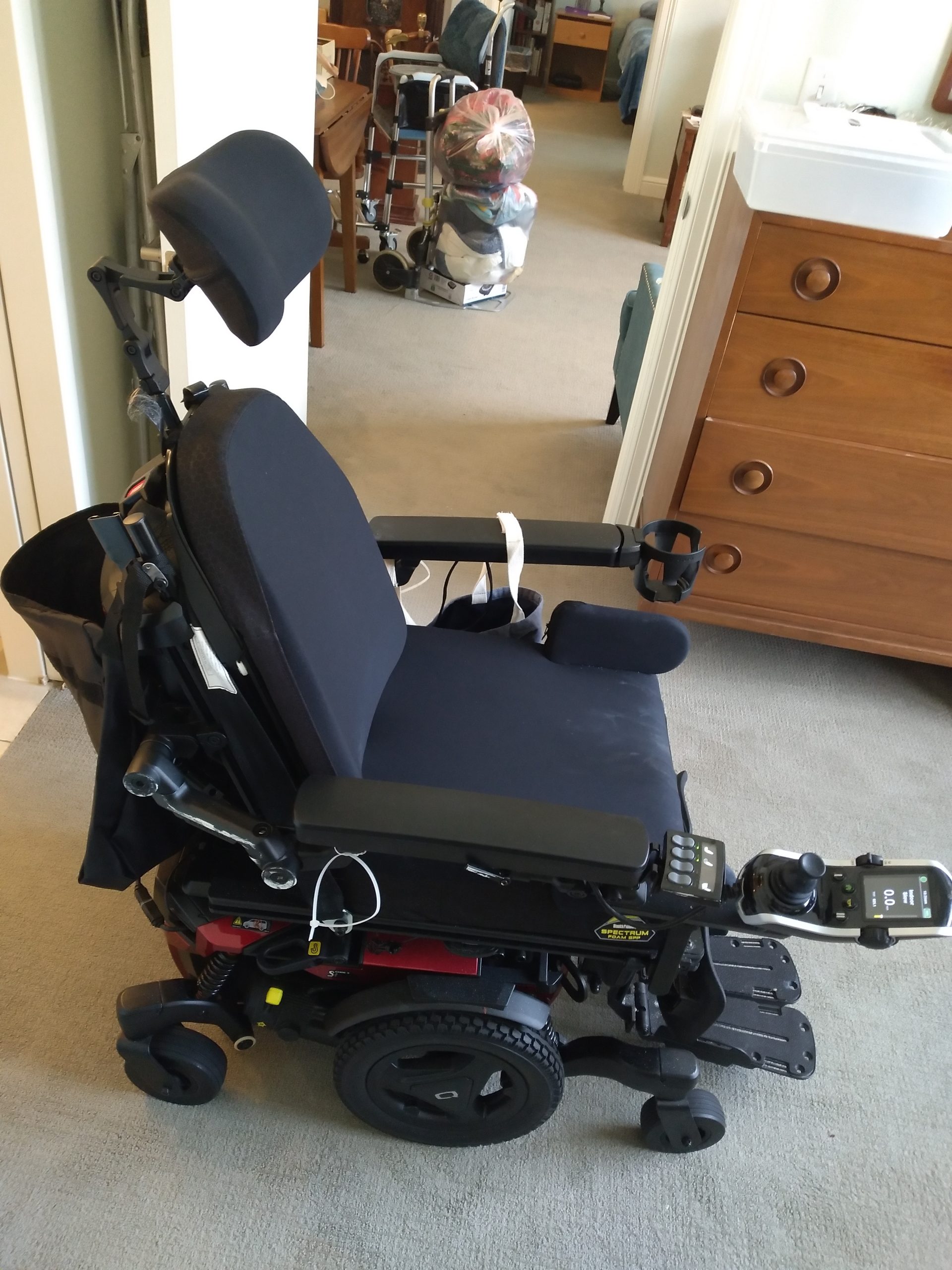 The wheelchair is five months old and was used very sparingly due to the condition of the owner ( my late wife ). It was never taken outside or driven any faster than Slow speed. The model number is Quantum Q6 Edge 3MPSS with 6 wheels for stability, 300 lbs. capacity, 6 mph maximum speed, turning radius 20.5in., 16 mile range, battery charger, comfortable foam gel seat and back rest, 38 lbs. base weight, 32 inch overall length. 24 inch base width, red accent colors, horn, seat belt, 2.7 inch ground clearance, swing-away in line joystick, two 12 volt batteries, two adjustable footplates, custom made wooden table mounted to the arm rests, removable adjustable head rest, adjustable back and foot rest to allow for reclining, and more detailed information is available on quantumrehab.com. The chair is located in the Prestonwood neighborhood in North Dallas, TX. I am willing to meet with you to show the chair at any convenient time in the next few weeks