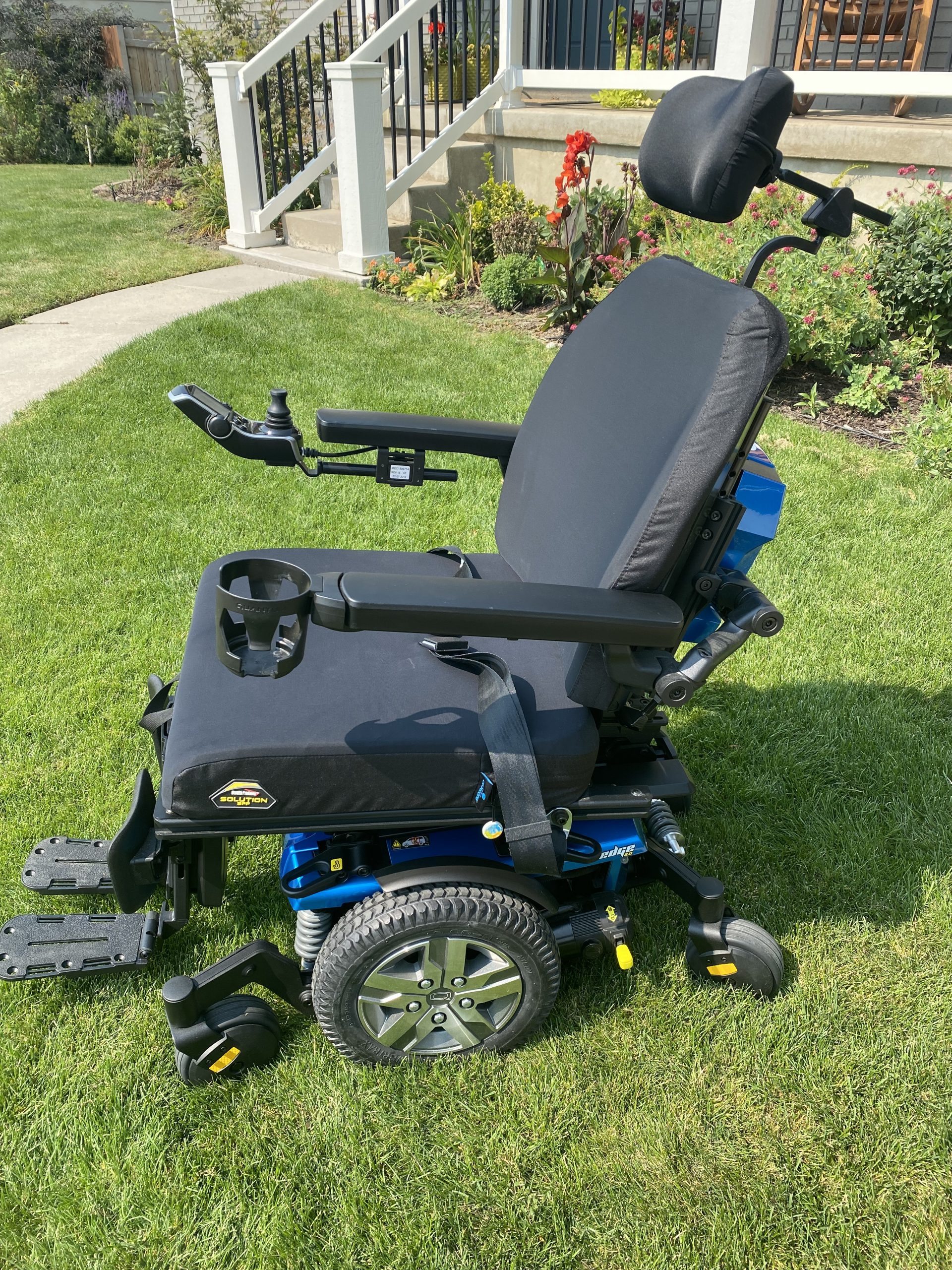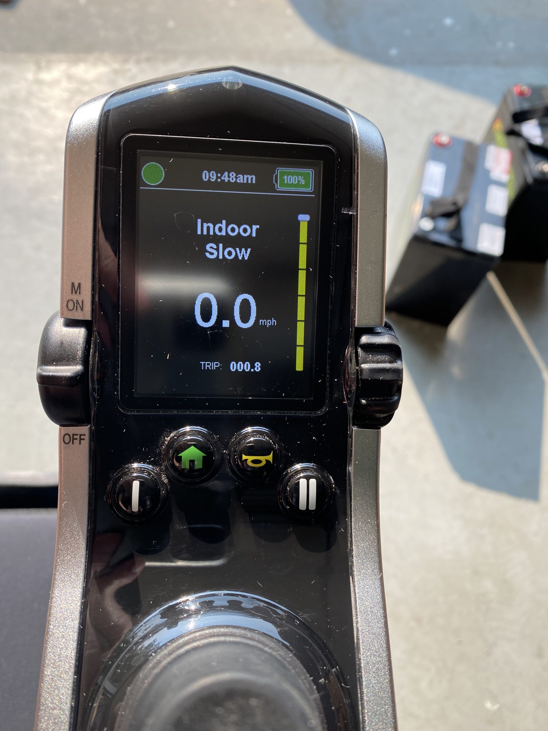 This wheelchair is brand new and has never been used, as you can see in the photo of the odometer reading. My mother had just received it when she was admitted to an extended care facility. We stored the chair for a year and a half until she passed away, and now we are selling it. It also has brand new batteries.