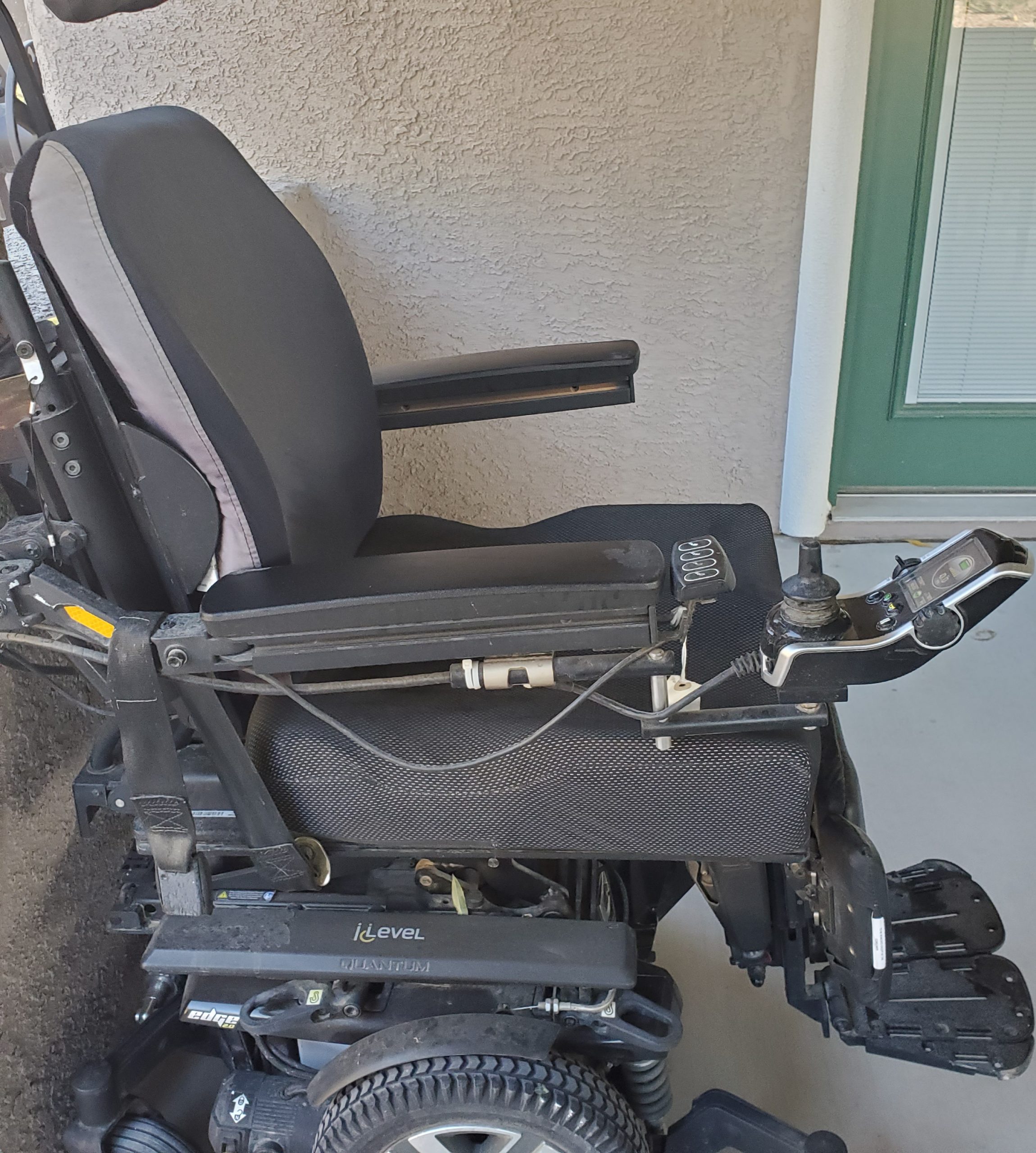 Pride Mobility Quantum Q6 Edge 2.0 iLevelPower Wheelchair. The iLevel Feature allows the user to drive this Power Chair at eye level of others while maintaining a normal walking pace pf 3.5MPH. Chair features a 19 x 19 inch Deluxe Rehab Seat, Flip Up Foot Plate, Q-Logic Joystick, 14 inch Solid Drive Tires, a Battery Range up to 15 Miles, and has 10 inch iLevel Seat Lift. With features like 2 Direct Drive Motors, Mid-Wheel 6 drive design and ATX Suspension, the Quantum 6 Edge is engineered to meet the performance needs of the most active user. Also, the Quantum Q6 Edge has a 20 inch Turning Radius offering exceptional maneuverability in tight spaces. The Pride Mobility Quantum Q6 Edge Power Chair is a Great Riding Chair and is the perfect choice for those who demand maximum stability and true all-around performance! Batteries are less than 1 year old. Comes with Battery charger.