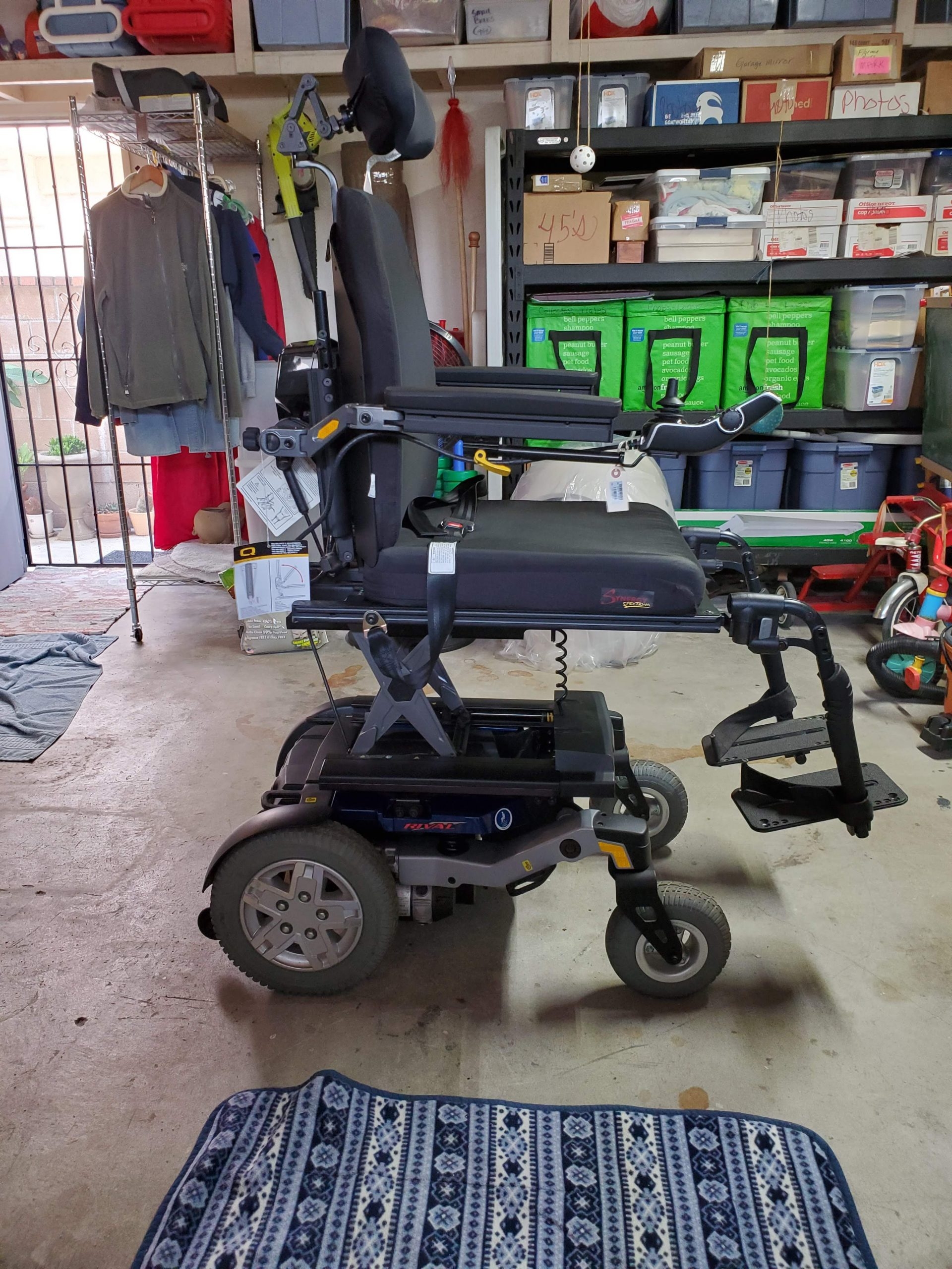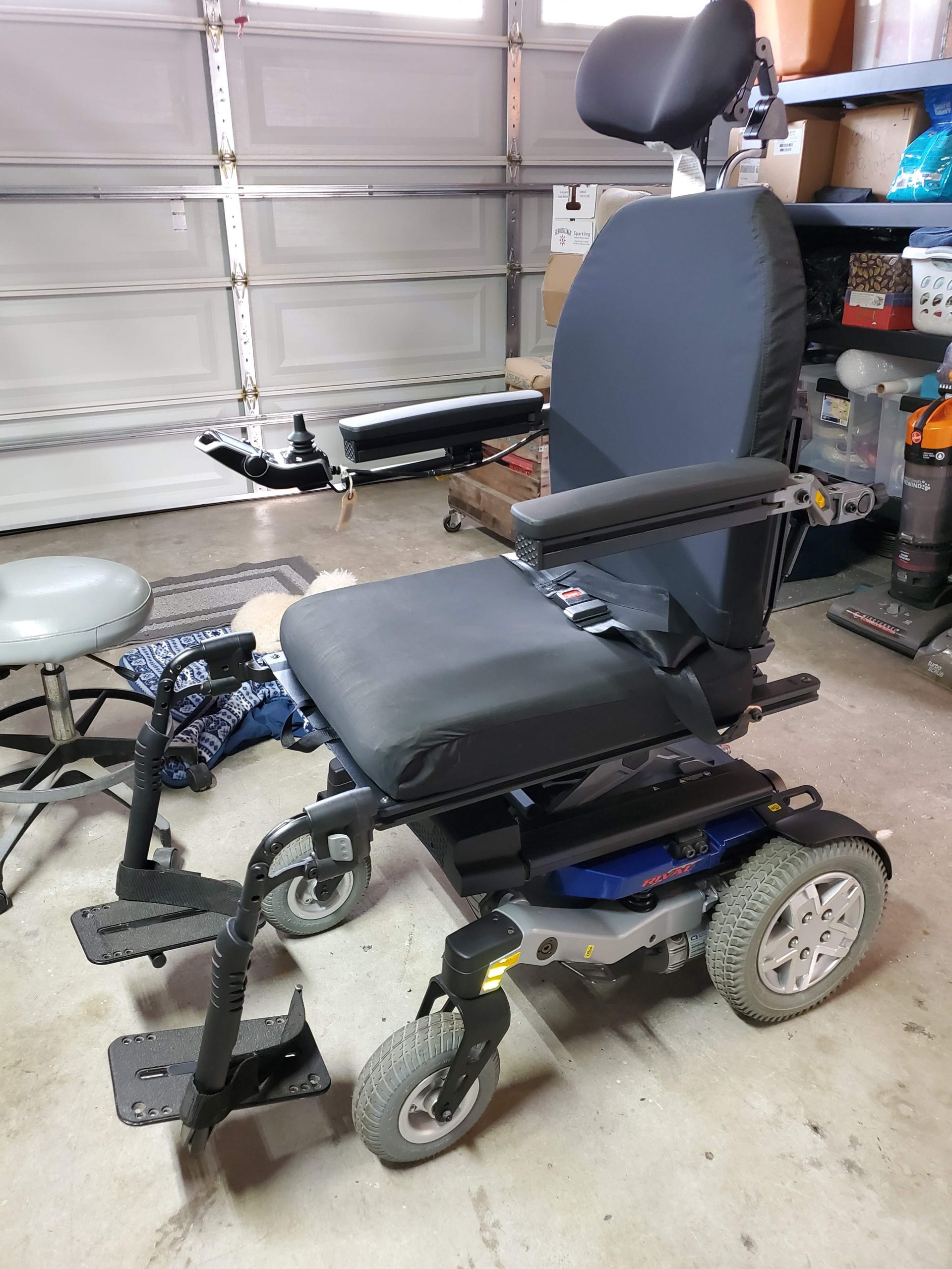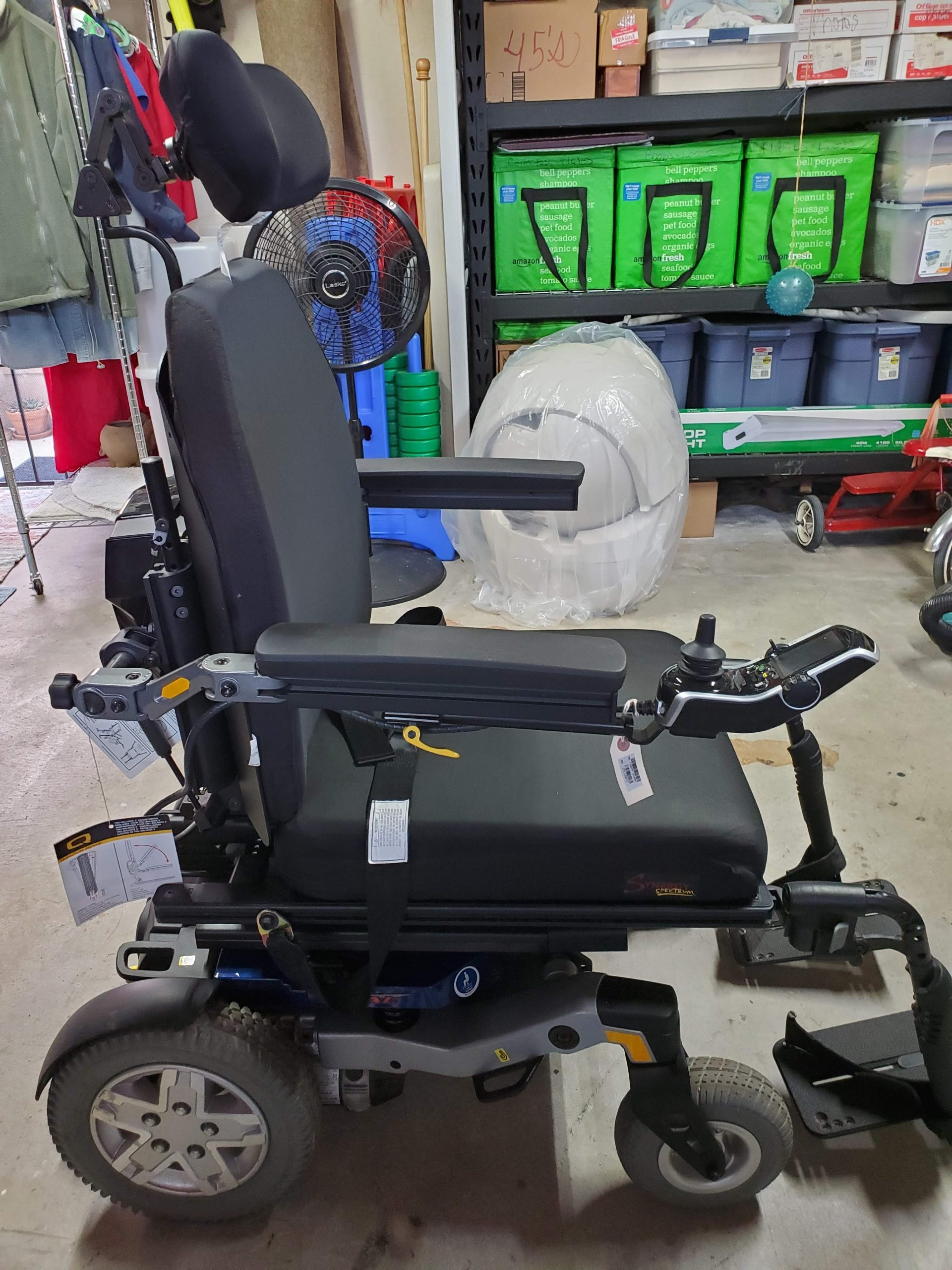 Quantum Rival 3 MP Power Chair with TruBalance3 Quantum Rehab Lift System, manufactured by Pride Mobility Products Corporation. Built and delivered 02/01/2014, was used less than 10 hours due to rapid decline in users health after delivery. Build for 6'2" 300 lbs male with Muscular Dystrophy. Garage kept, like new condition all original parts and accessories, manuals, programming unit, and charger included. New MK Gel Batteries purchased 09/21/20. Solid core tires has all the bells and whistles. Length without foot rests 36", with foot rests 50.9". Width 25". Turning Radius without foot rests 29.75" Weight 300lbs, max speed 6.6 mph. Two motor rear wheel drive, Active-Trac ATX with Long Trail Arm Suspension. Intelligent Braking system, disc park brake. Elevation system rear tilt 50 degrees and can tilt/recline up to 175 degrees. Spectrum 20' wide/22" deep seating system. 6x11 Angle Footplates. Lift extends up to 10". Obstacle Climbing Ability 1.5". Has Transit Securement System Hooks for easy safety tethering in transport vehicles. Very very clean, all tags still attached. Must see to appreciate.
