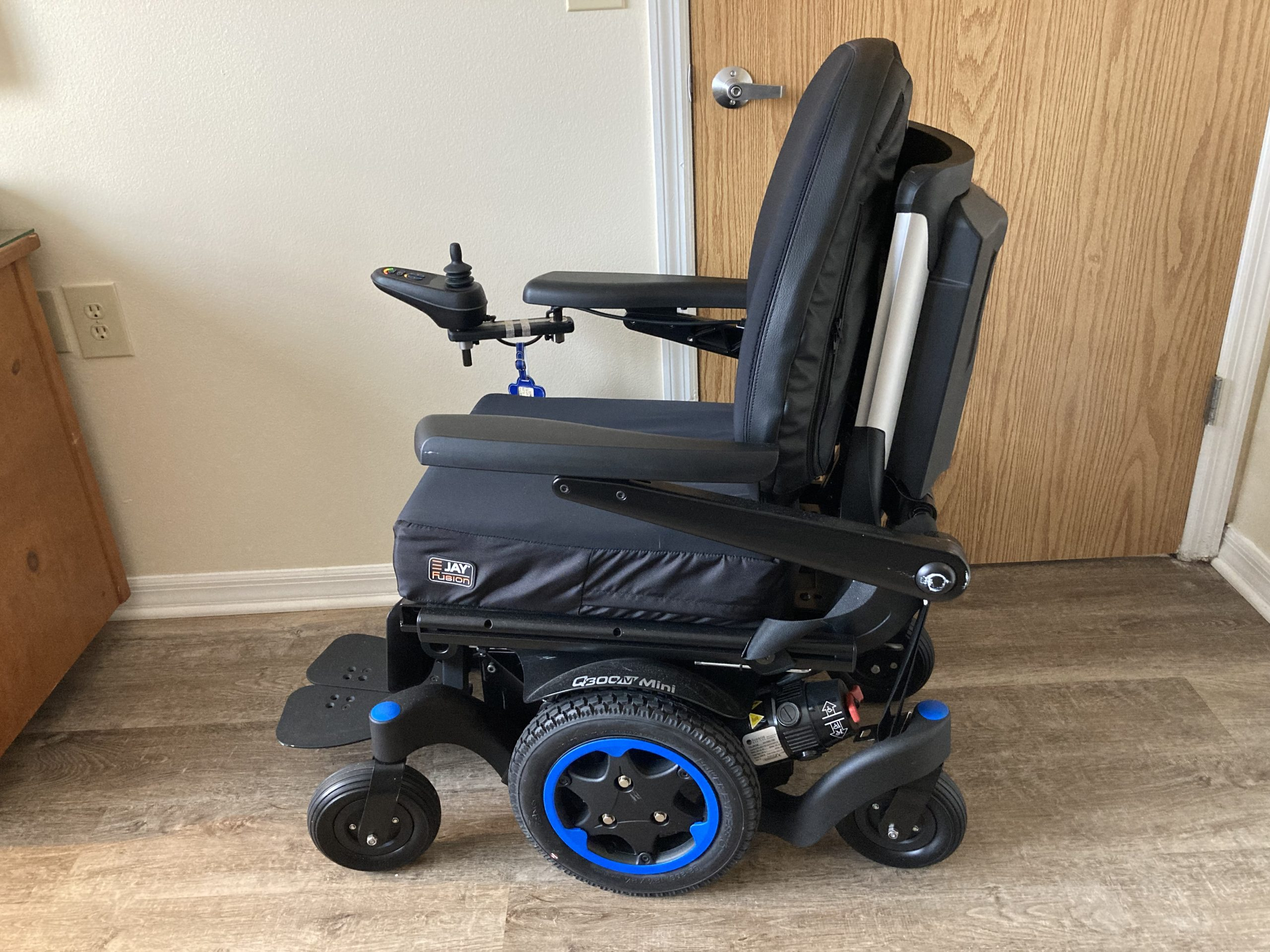 Thanks to its TRUE mid-wheel drive technology, the Q300 M Mini turns on the spot, for an ultra-small 17" turning radius (without footplates). In comparison, RWD and FWD power wheelchairs need to 'swing' around on their front or rear drive wheels, resulting in a wider turning radius.