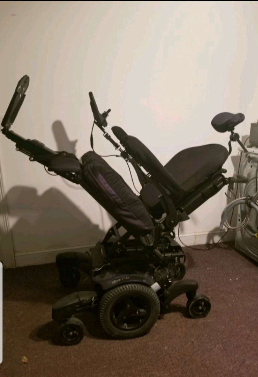 The Quickie QM-710 has mid-wheel drive, power tilt, power seat elevation and elevating feet and legs. It has SpiderTrac suspension for superior traction and handling, featuring independent movement of all six wheels. Optimized articulation of the front and rear wheels give the QM-710 the ability to crawl up and down steep obstacles while keeping you stable and very comfortable. The wheelchair also has a large, very comfortable seat cushion.