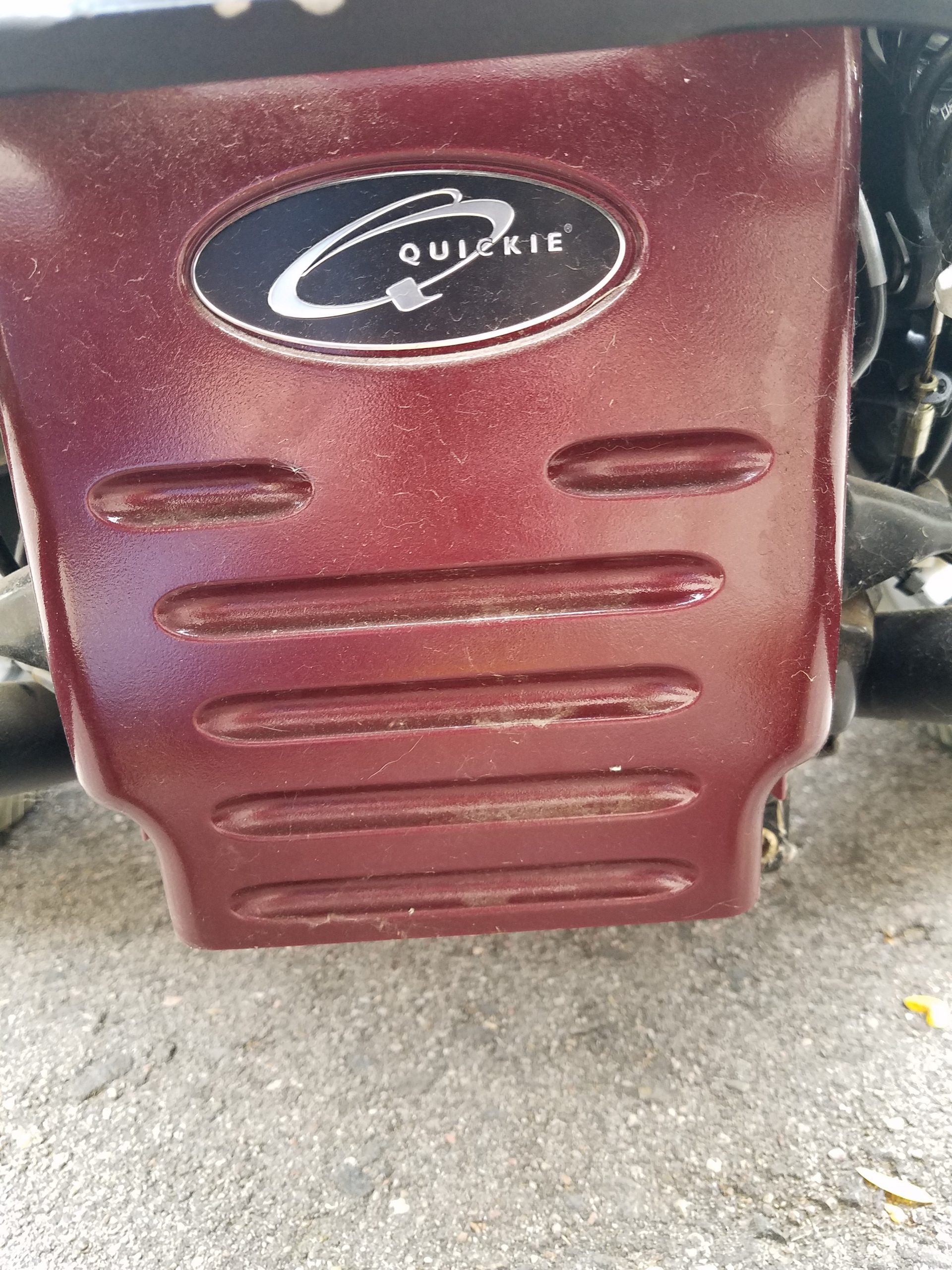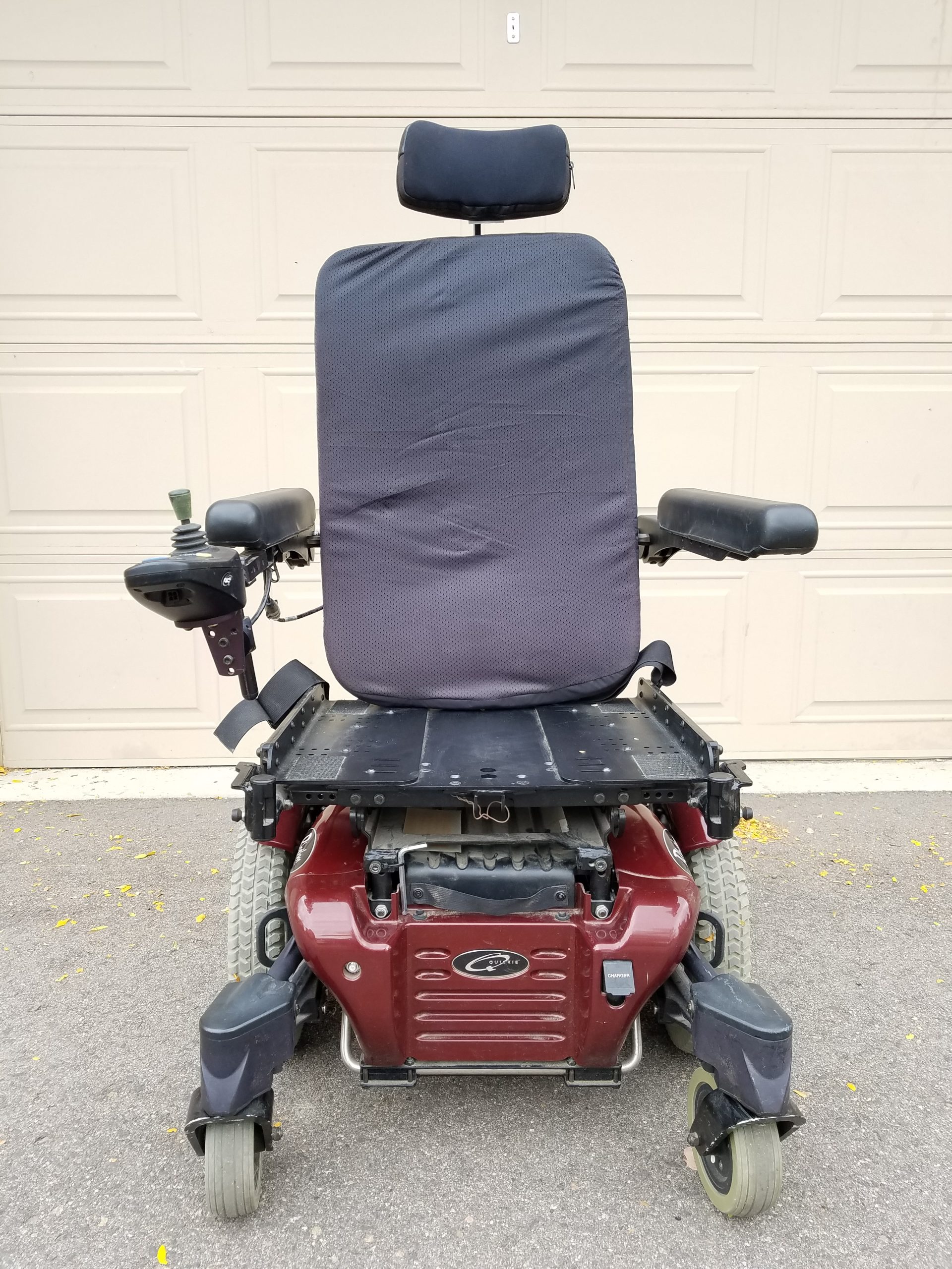 Give the gift of mobility with this Quickie Rhythm power wheel chair. The wheel chair is in good condition, but we no longer need it. It comes in a sleek red, so you'll be riding in style. It has a 6.5 MPH motor with a 300 LBS capacity, a movement speed up to 8.5 miles per hour, with 4 speed settings, 3 inch obstacle climb, all-wheel drive independent suspension, leveler technology that helps driver maintain level when navigating uneven terrain, 6 form suspension - ensures all six wheels remain in contact with the ground. This allows for easier handling of ramps, climbing, and outdoor terrain - even in reverse. Easy battery access, Powered with two 12 volt AGM deep cycle batteries. The wheel chair can pivot, allowing for ease of movement in different locations.