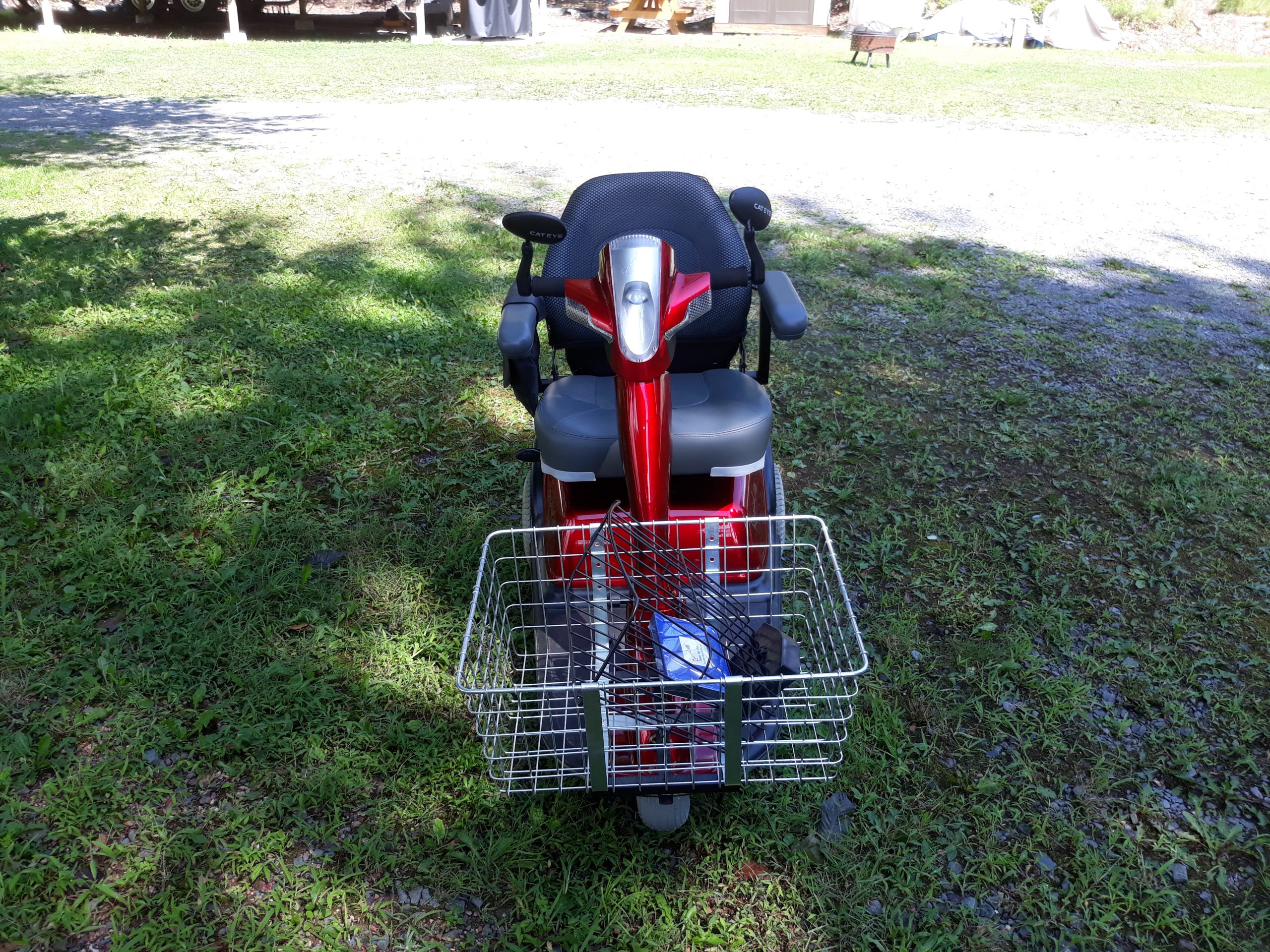Looks and runs like new! Hardly used then stored away. Seat is a large 18 1/2" x 17" Automatically raises and lowers at the touch of a button for easy on and off or easy reach of products in stores. Three wheel all terrain ten inch tires in great shape and two small anti tip wheels on front to keep you upright! Scooter has all lights in working order, horn and rearview mirrors on handlebars. Also comes with a beautiful leather cover to keep this beauty looking good and protected from the elements!