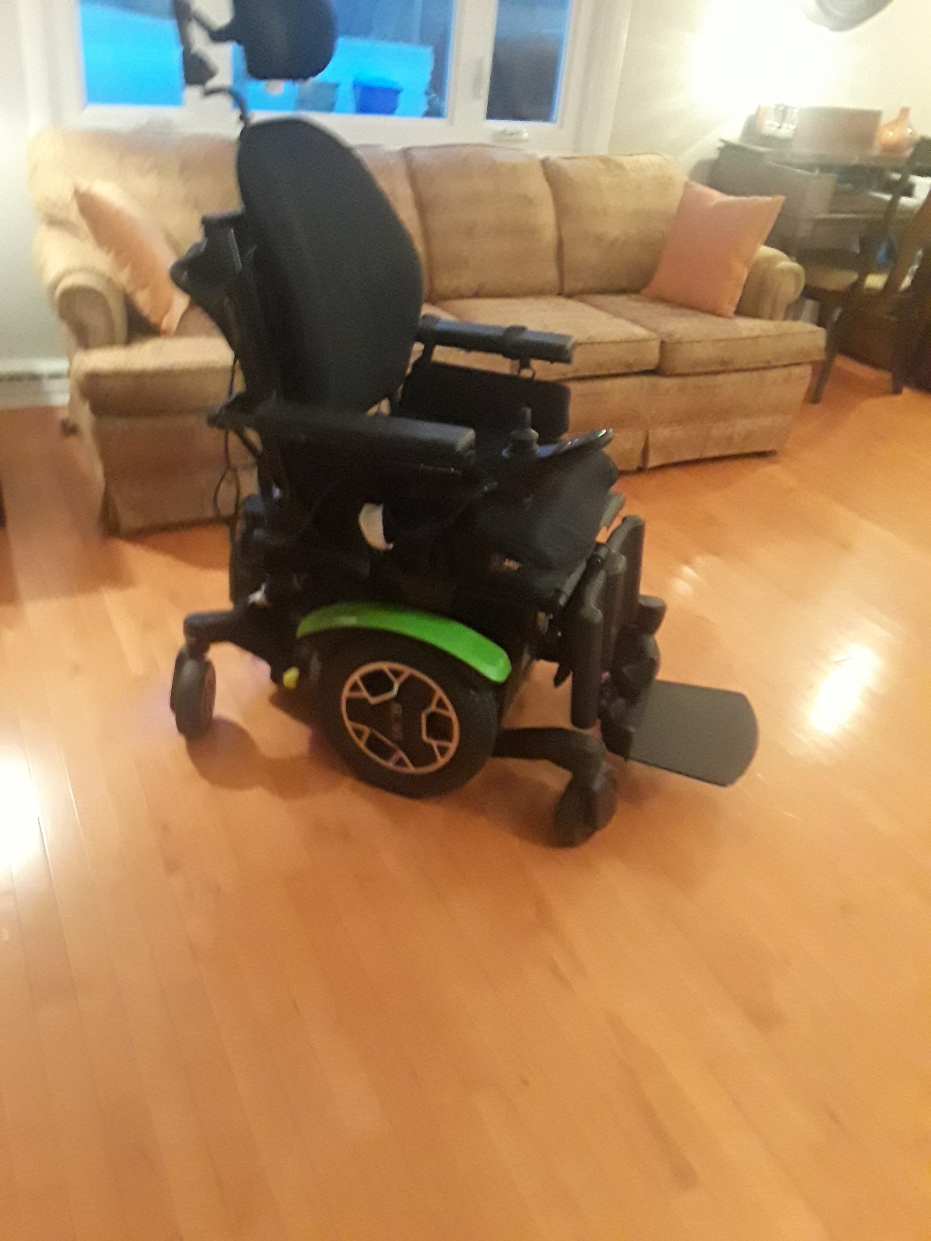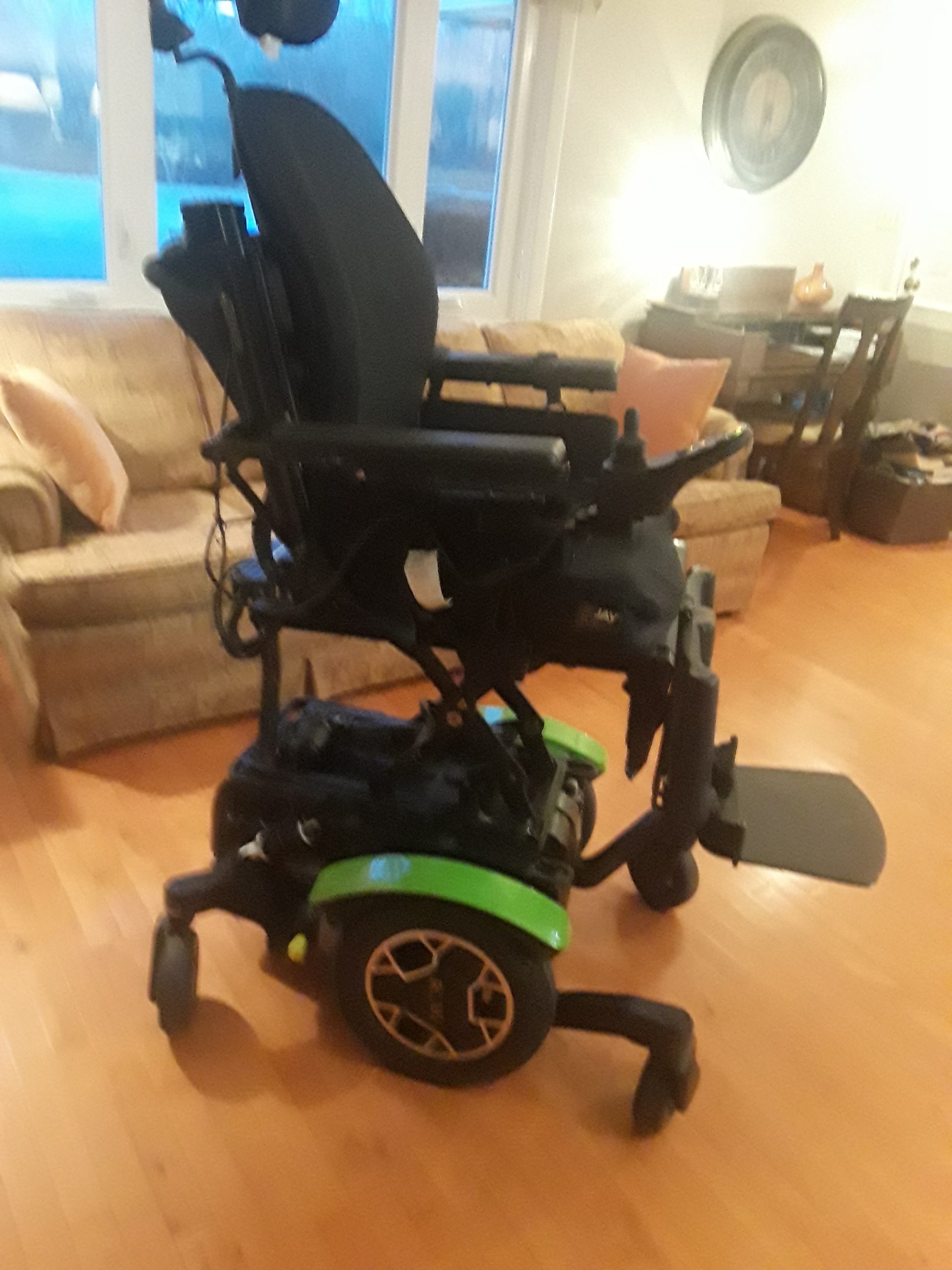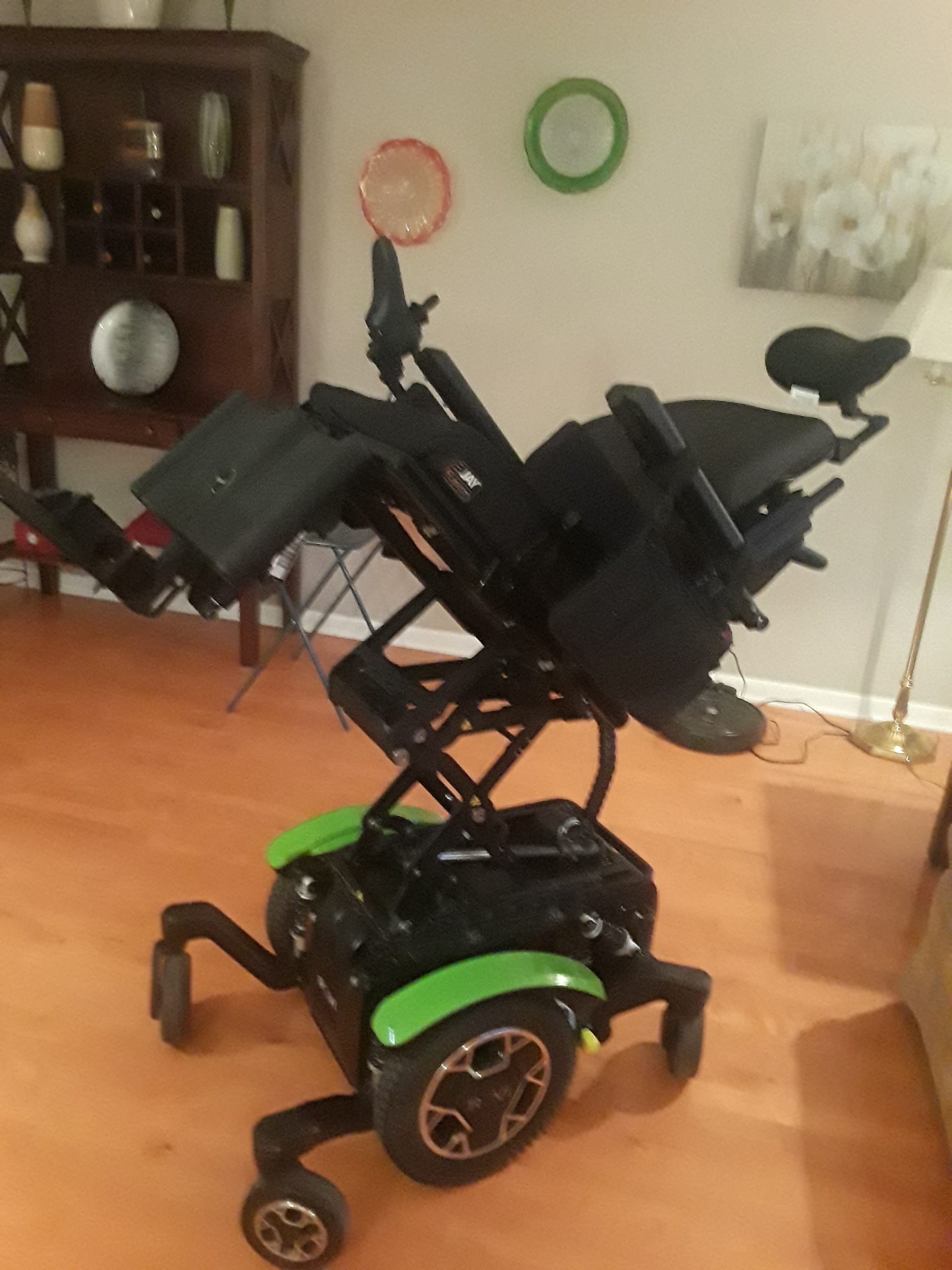 The chair has been maintained by Seating Mobility in Milwaukee, WI. Within the last 12 months, new motors, new batteries and new stabilizer wheels have been installed. The chair can elevate up to 12" and can be operated by either the joystick or the assistant's keypad on the back of the chair. The cost of the chair when purchased in December, 2018, was approximately 25,000.00