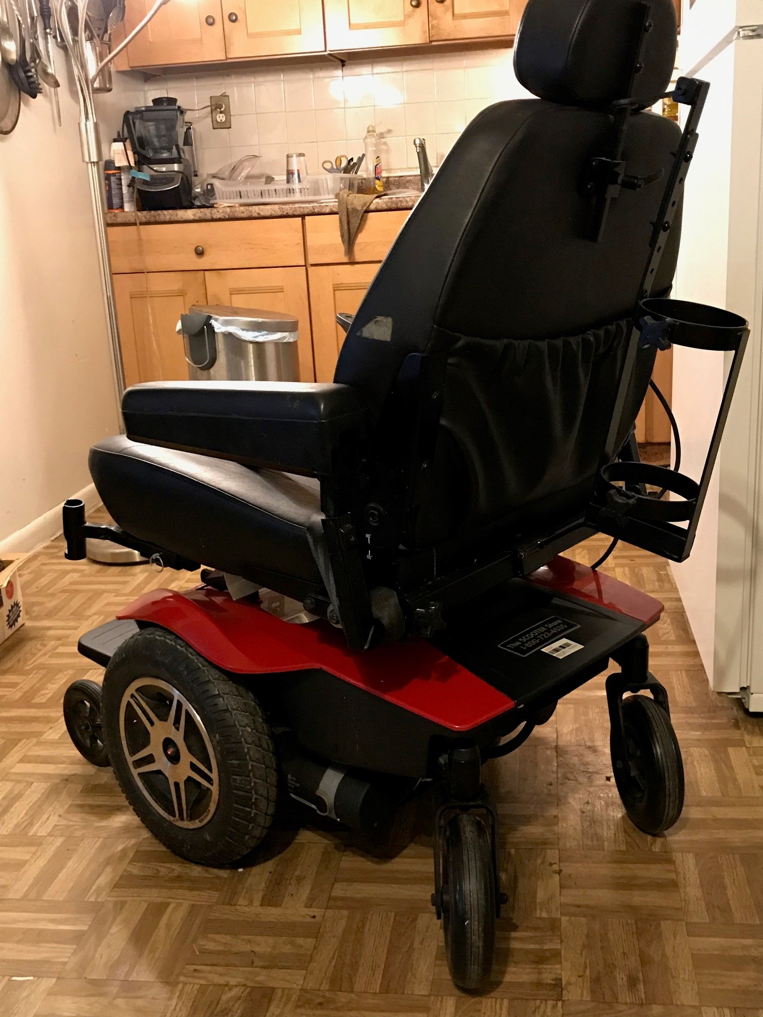 Powered heavy duty chair in excellent condition ridden less than a kilometer combined within 2.5 years from brand new purchase to July 2014. Used mainly in kitchen area (25sq. yards) of single bedroom apartment, never outside apartment; in storage and not ridden since July 2014 at demise of user. Chair is suitable for users beginning from 200 Lbs. reaching to 450 Lbs.. Currently setup for right-handed user. 2 brand new AGM lead acid batteries and new charger purchased per specifications in March 2022. Chair newly retested for proper charging, mobility and speed. Manuals available to buyer.